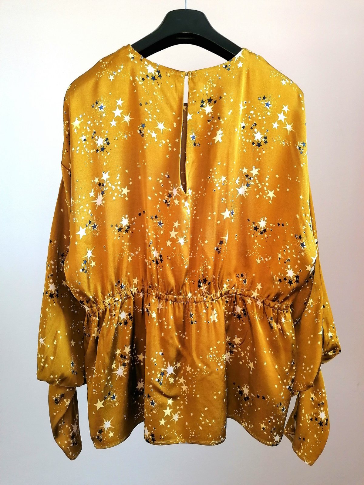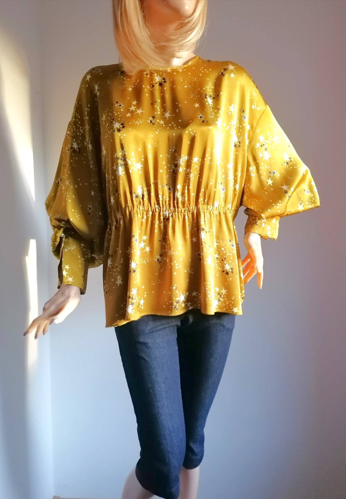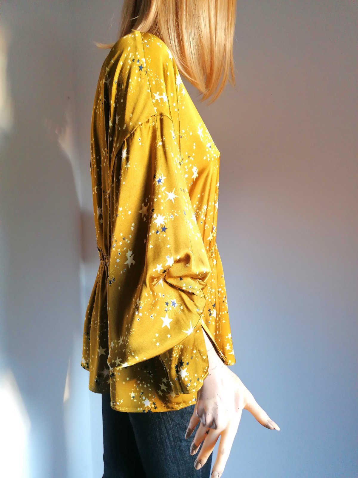 Veľmi originálna blúzka, vo farbe zlatej až horčicovej, s hviezdičkami.