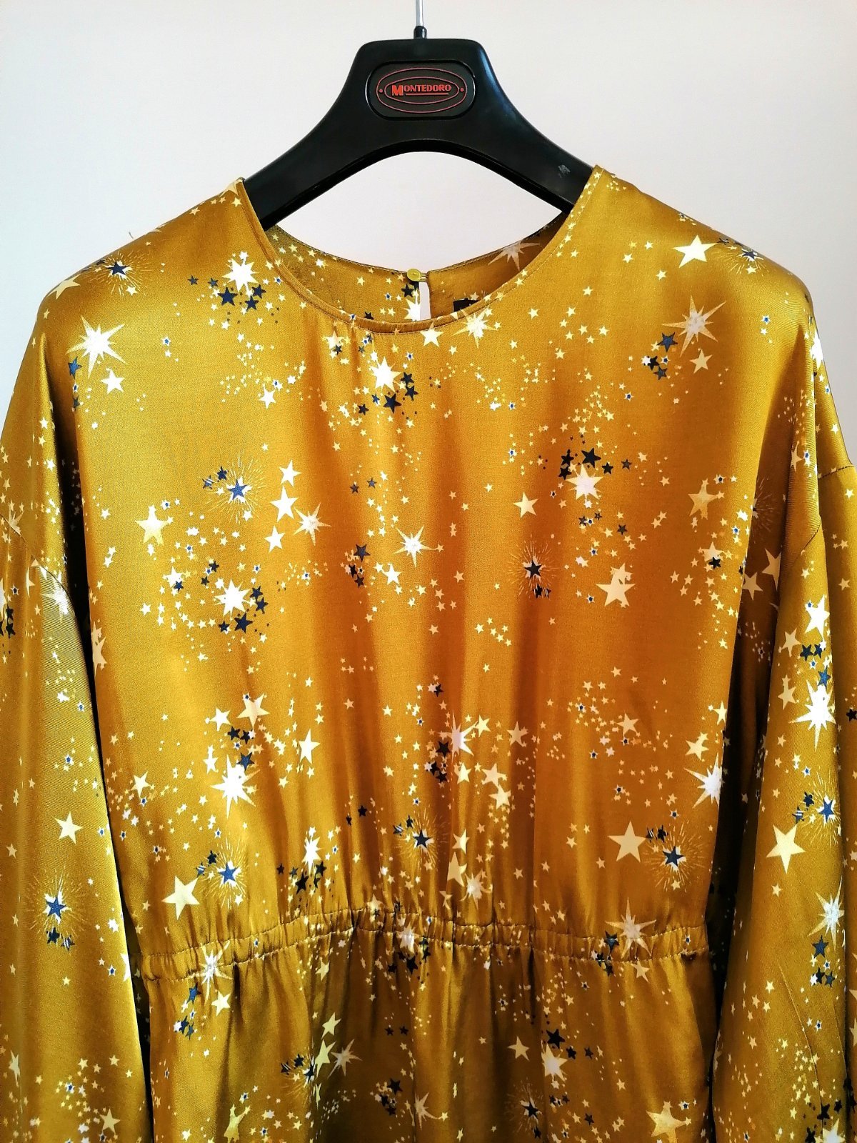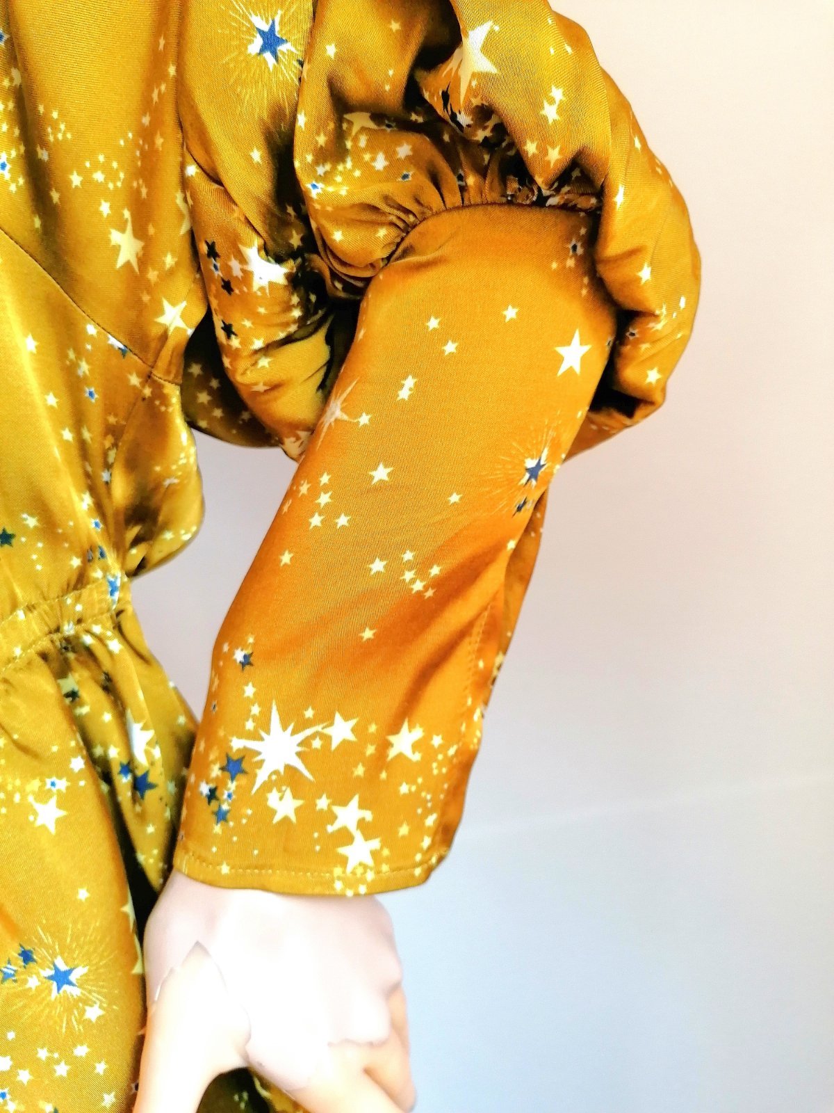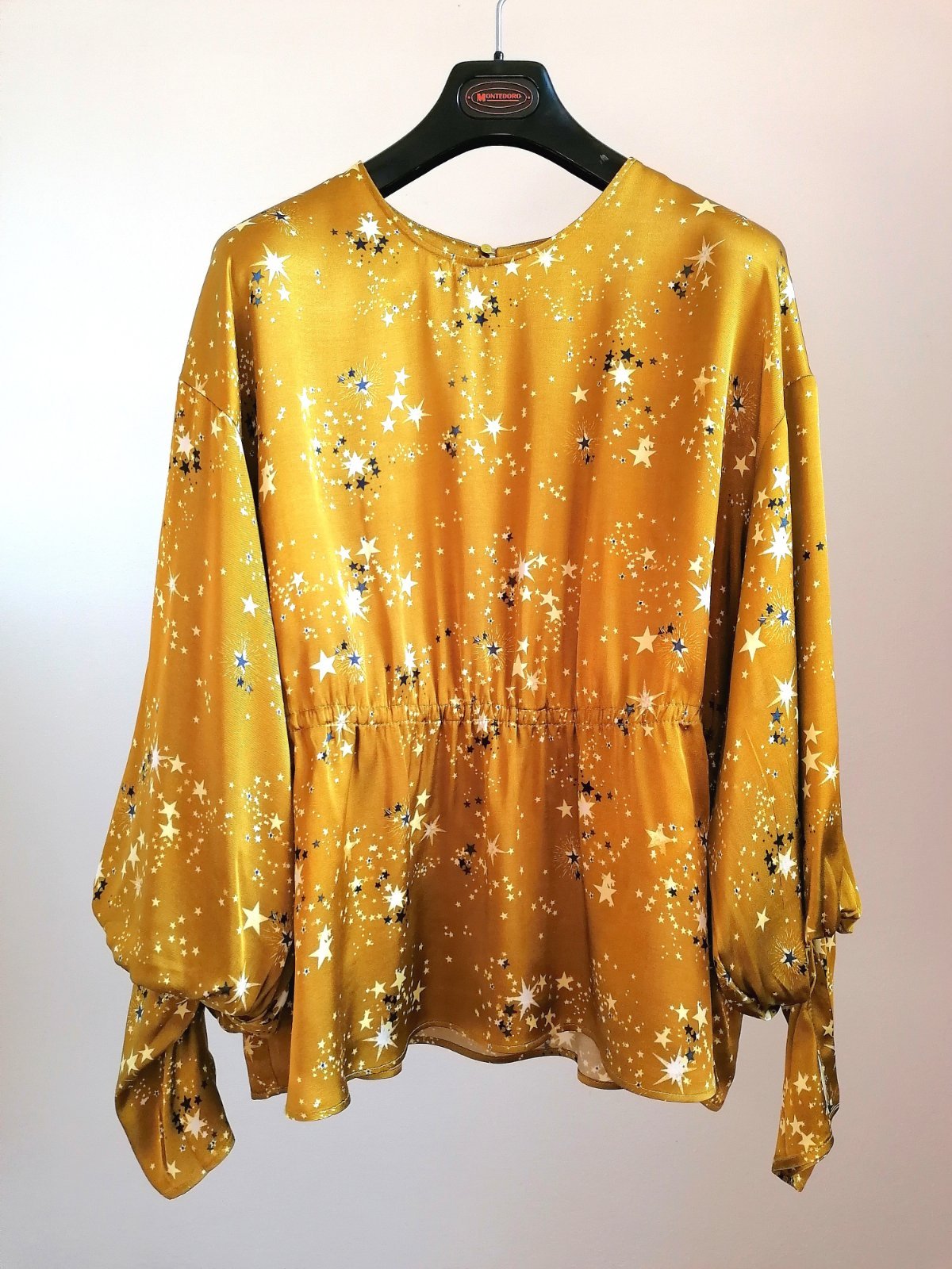 Veľmi originálna blúzka, vo farbe zlatej až horčicovej, s hviezdičkami.