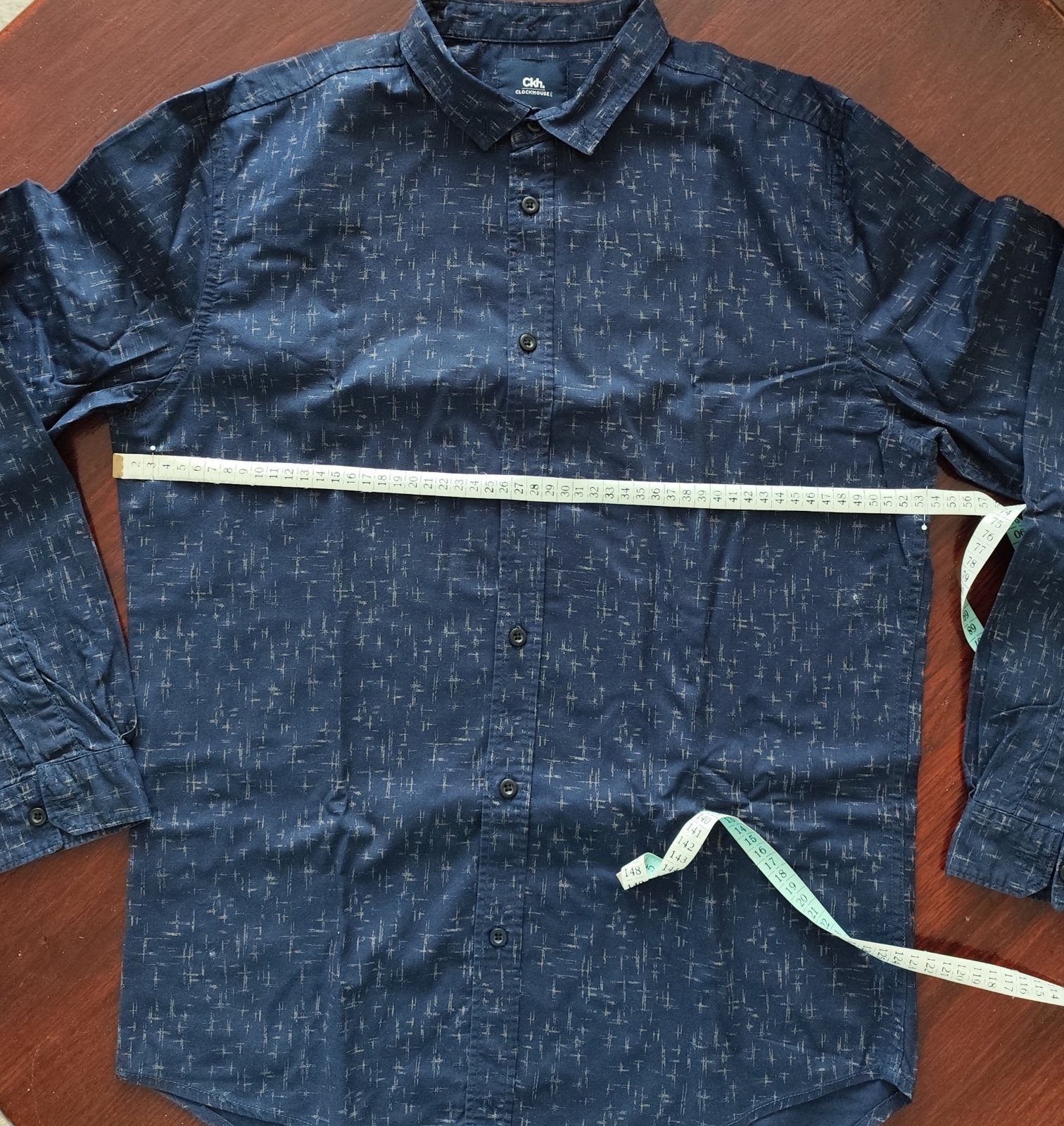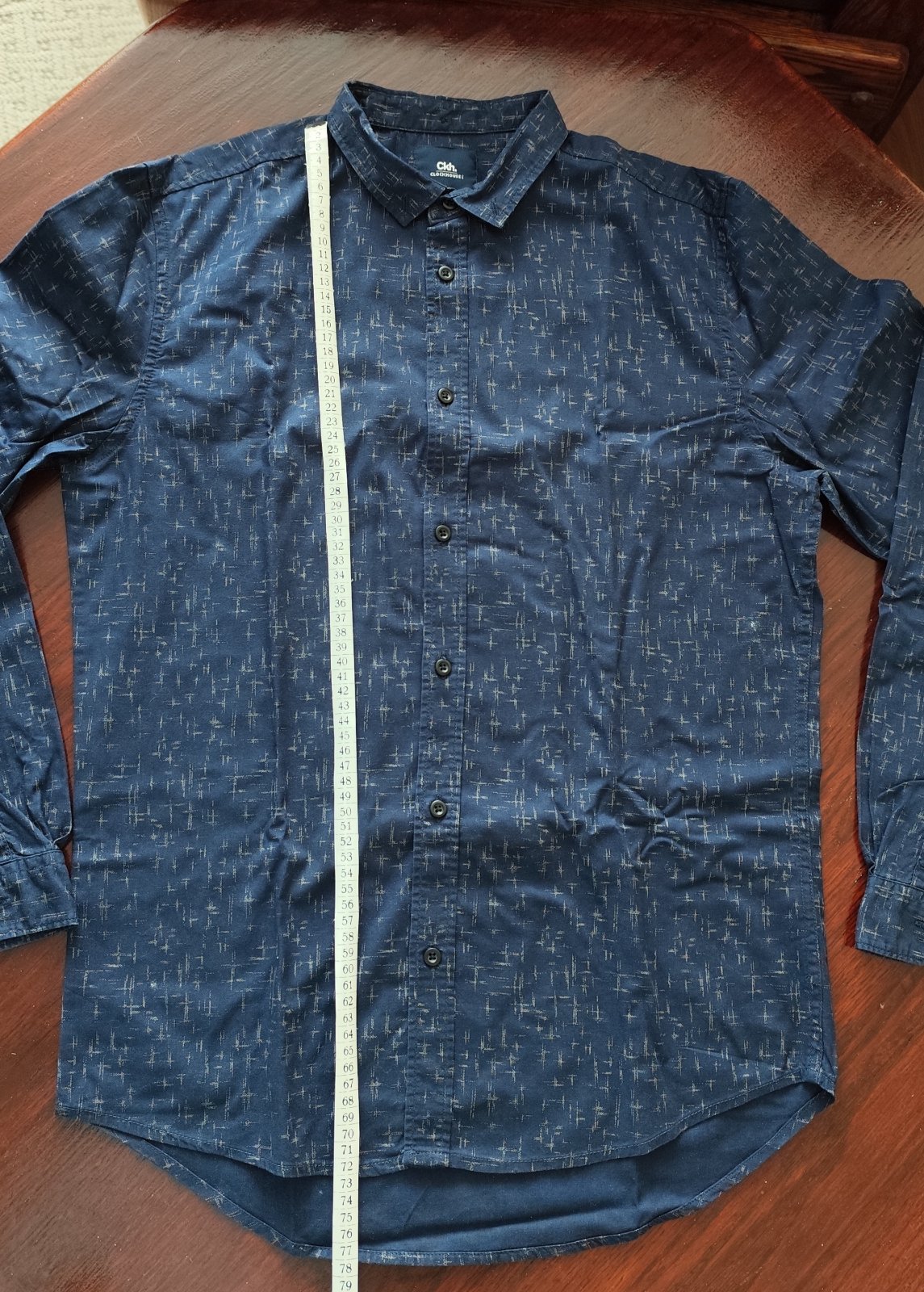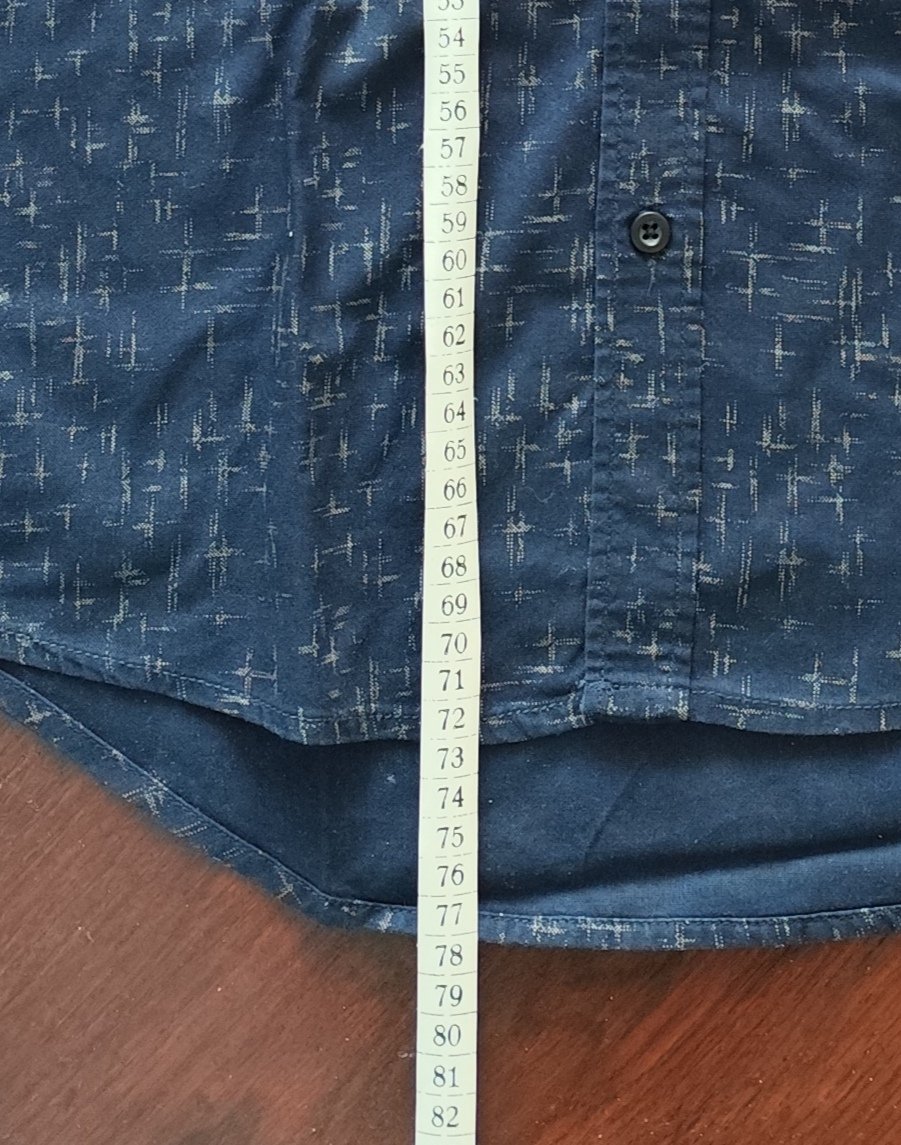 Pekná tmavomodrá košeľa so šedým vzorom, 100%bavlna, voľný strih. Cez prsia 2 x 53 cm. Dĺžka vpredu 72 cm, vzadu 77 cm. Perfektný stav.