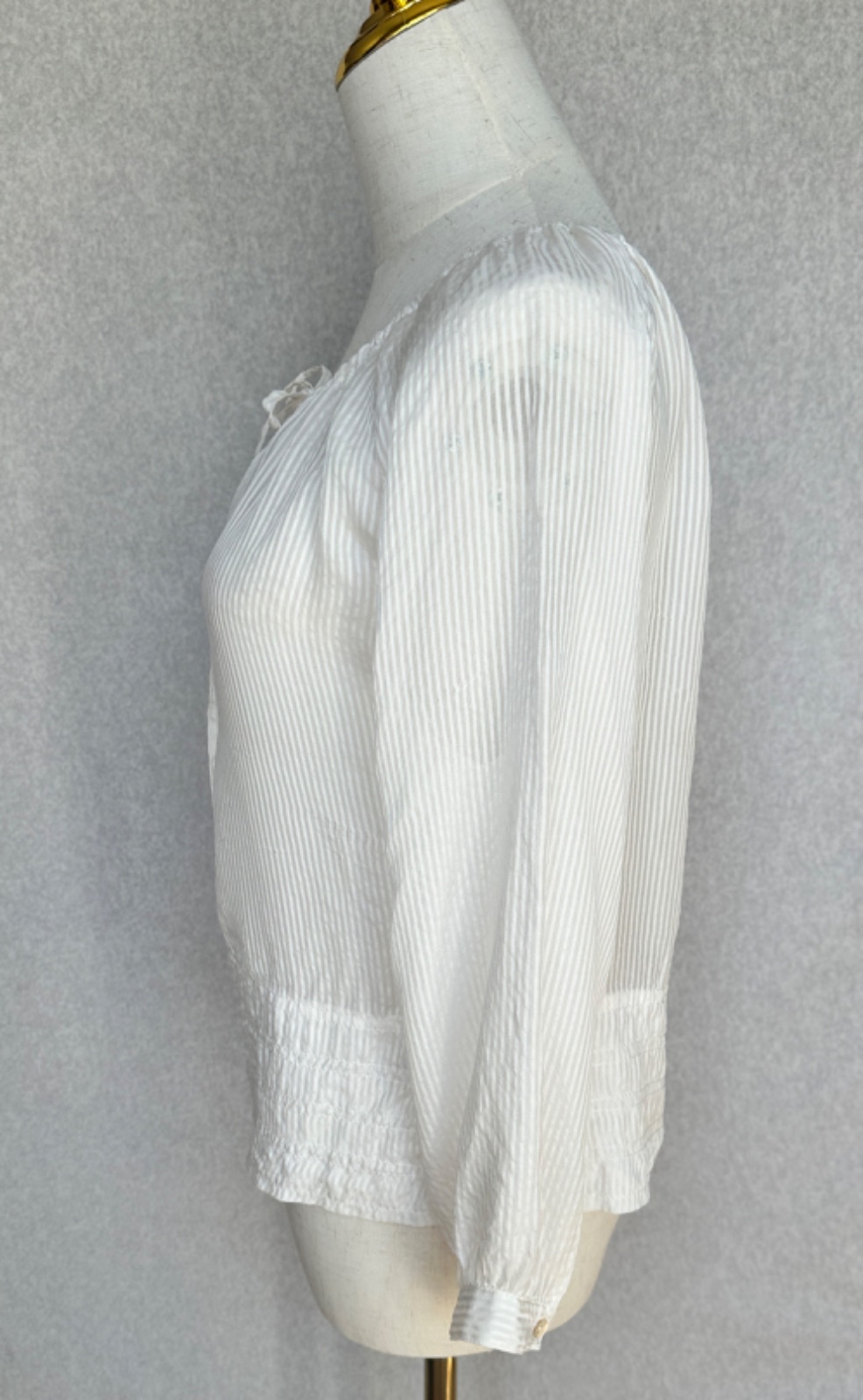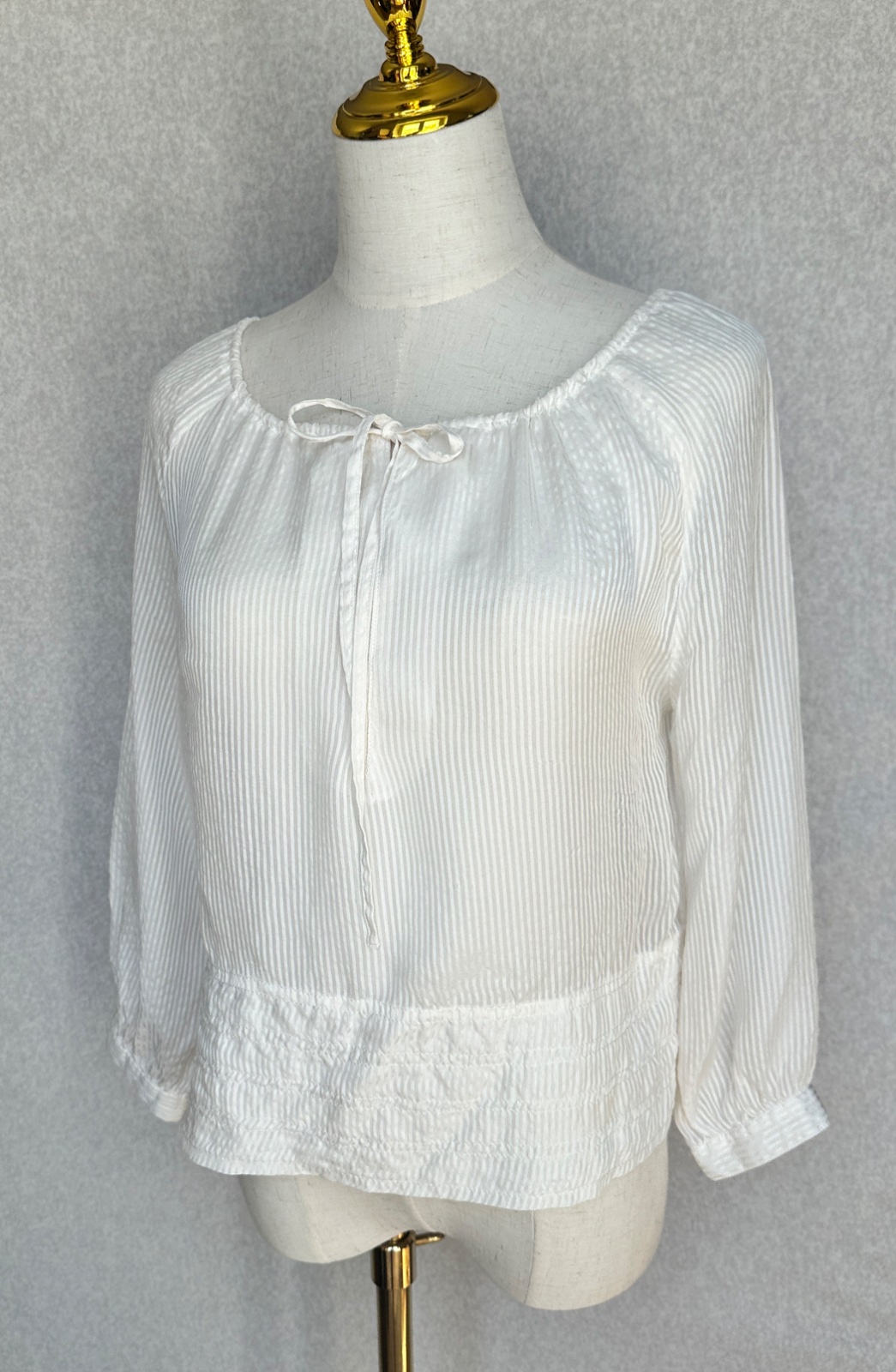 Jemná ženská blúzka zo 100% hodvábu so zaväzovaním na mašličku. Štruktúra látky má jemný vertikálny pásik. V peknom stave, bez viditeľných poškodení.
