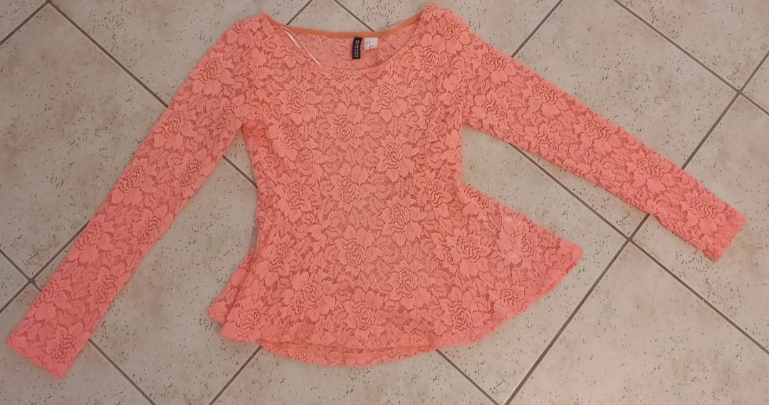 Predám krátku lososovú blúzku, veľ. S/M, zn. Madame Elysees, málo nosená. Našla som dve malé bodky akoby od pera (viď tretia foto) a pod rukávom, skoro ich nevidieť, ale upozorňujem na ne.
