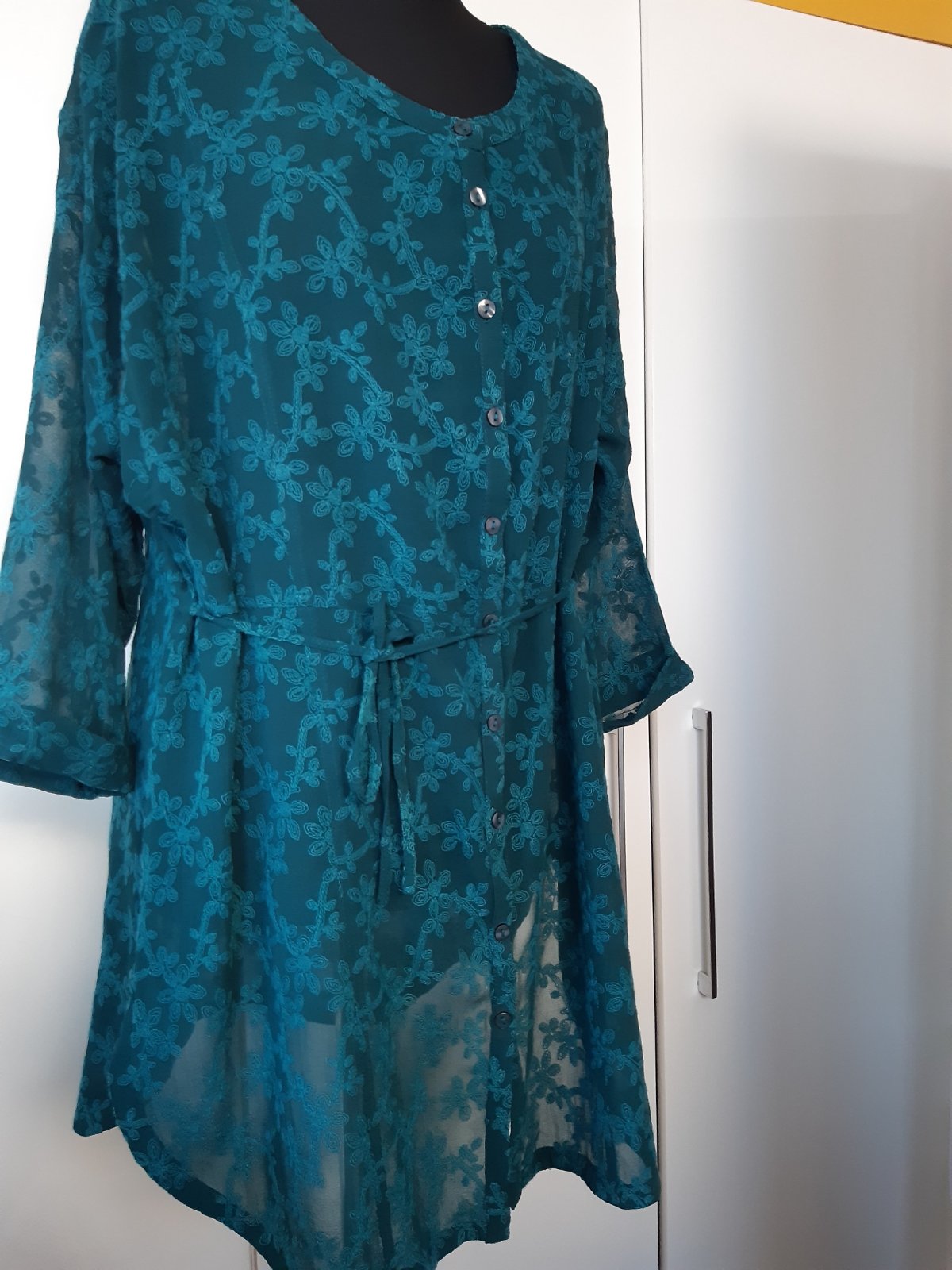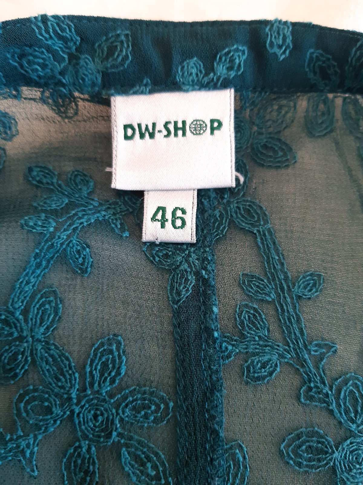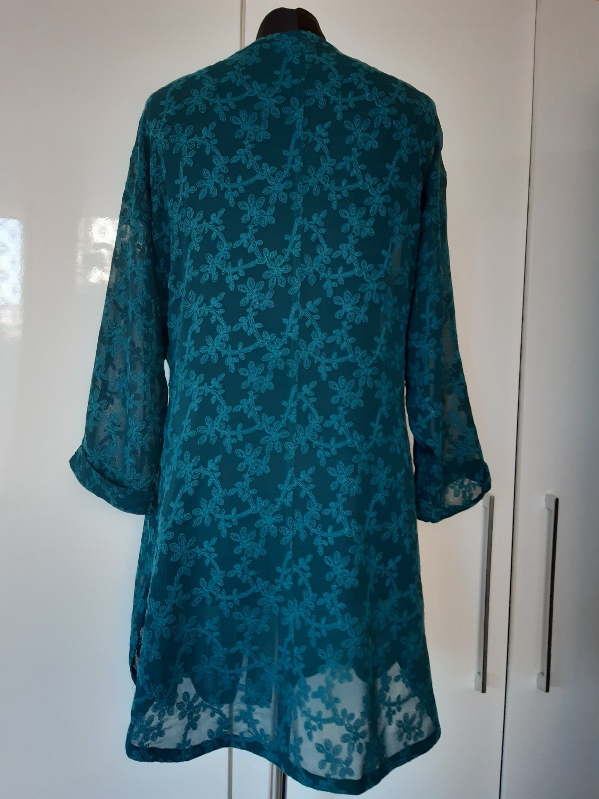 Farba blúzky je zelená , ladená tyrkysovo-zelenej-pekná. Materiál je to akoby výšivka na tenšej látke. Látka presvitá, blúzka sa hodí na sviatočnú príležitosť, party... Dl. 85 cm, dl. 3/4 rukáva od krku-je to spadnutý rukáv 57cm, šírka cez prsia 62x2 cm, pas 59x2 cm, boky 62x2 cm. Sedí na 46/48, potrebné premerať sa. Materiál je 100% viskóza. Blúzka je vo výbornom stave, bez poškodenia.