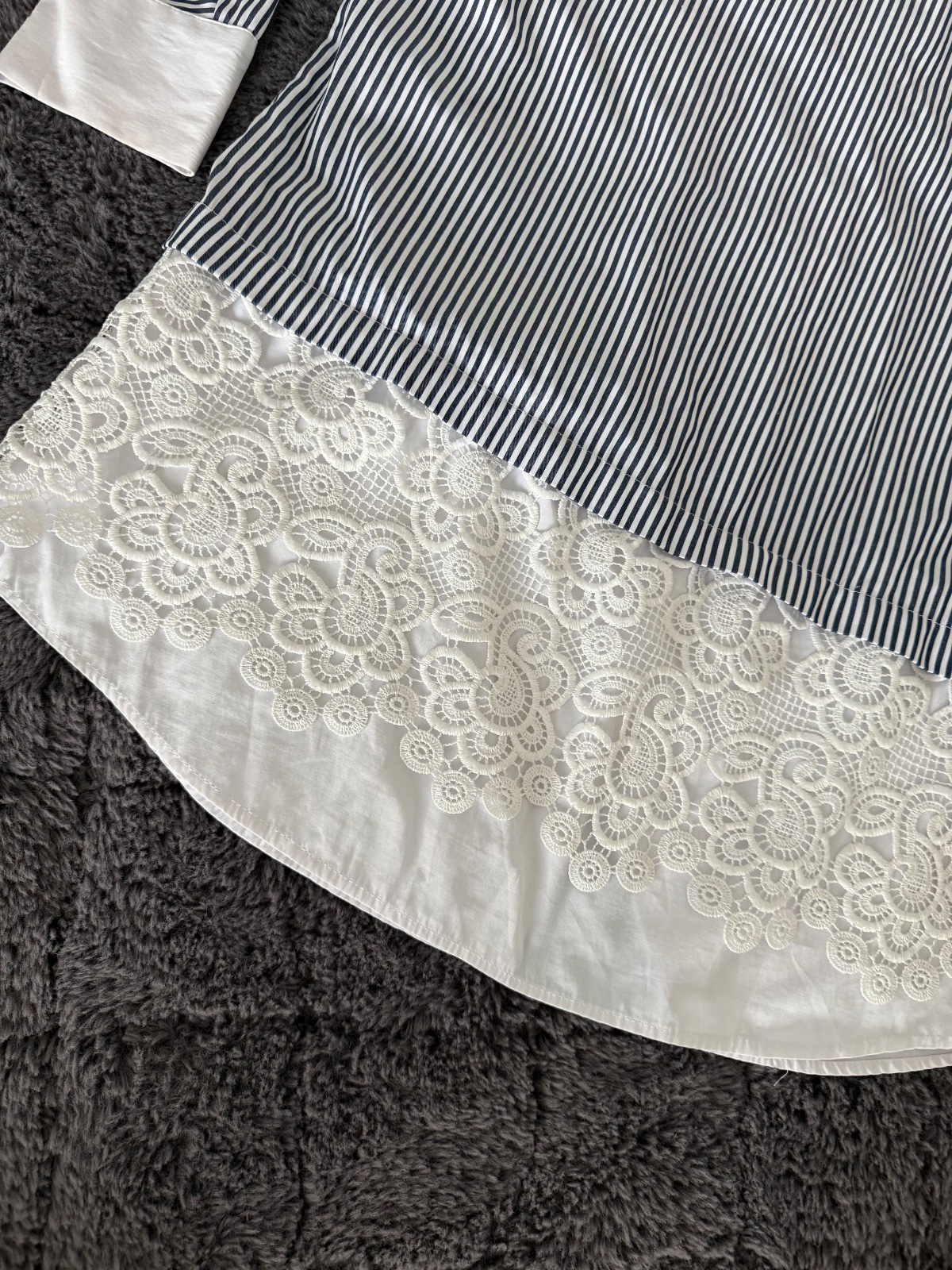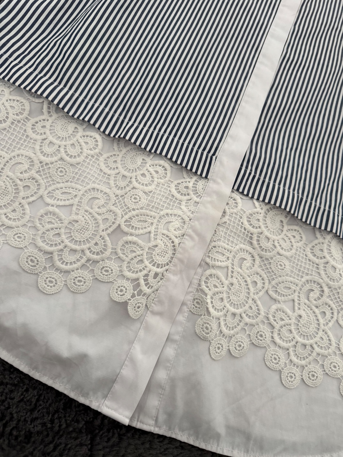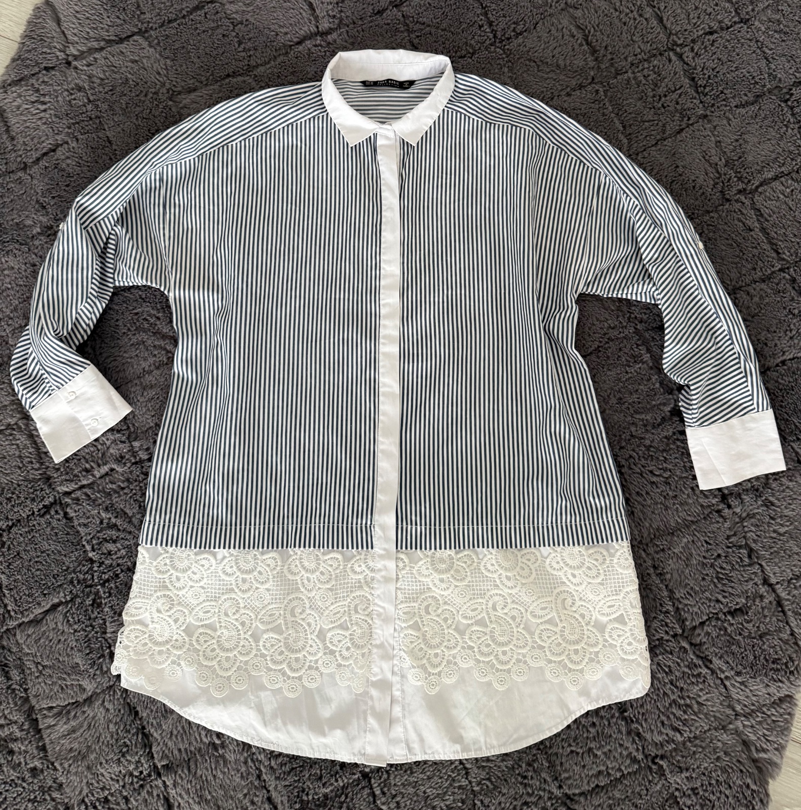 Krasna dlhšia košeľa Zara. Kombinácia bielo-modrých prúžkov a krajky. Rukávy majú možnosť vyhnutia. Velkost XL. Štítok so zložením odstrihnutý. Velmi dobrý nosený stav.