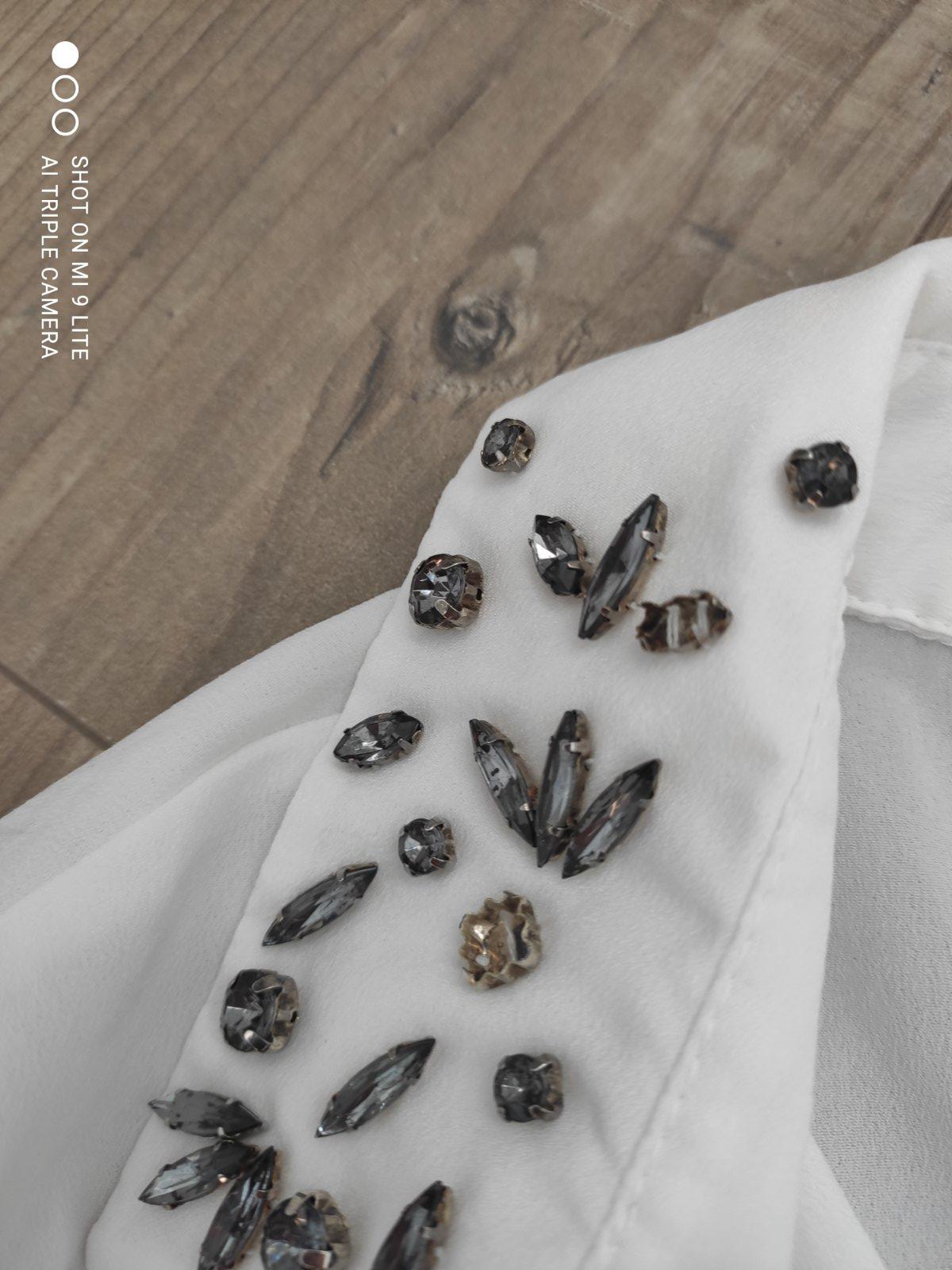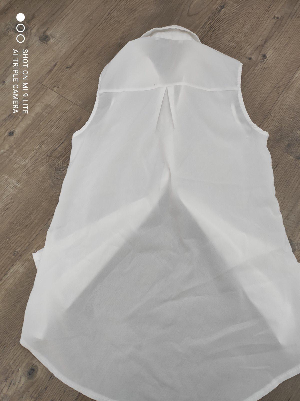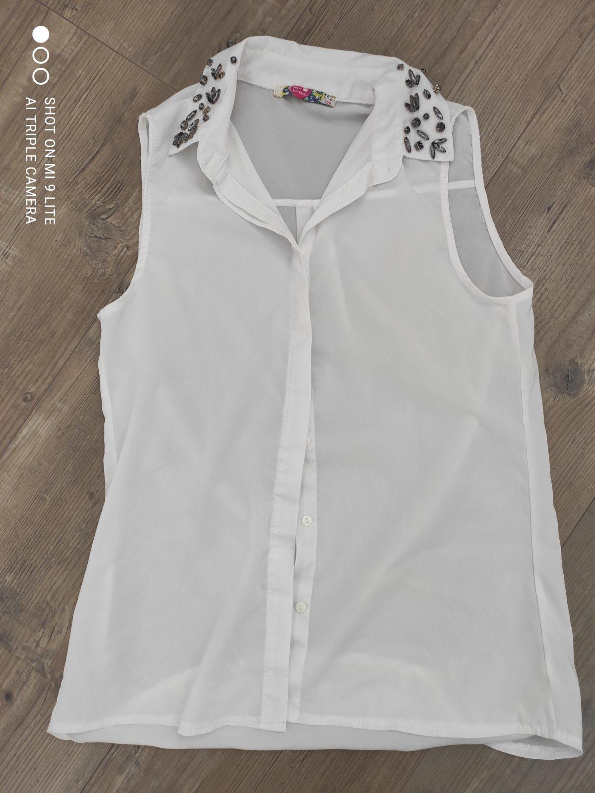 krasna par krat oblecena biela priehladnabluzka bez rukavov s kamienkami na golieriku. bluzka bola oblecena iba par krat vypadlo vsak par kamienkov, nie celevybijanie, iba ich vnutro- kamienky. vid fotky. pri noseni to vobec nevidno kedze nevypadli cele. velkost 36- S