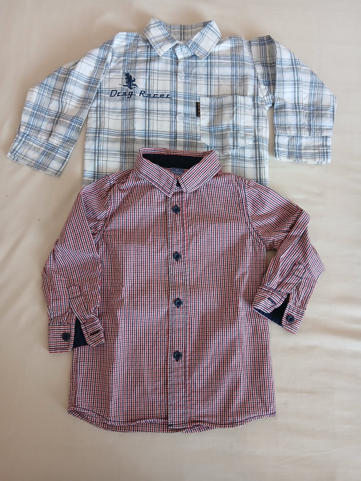 1 košeľa ale karo s cervenym znacka dopodopo a 1 karo biely podklade značky, malo nosene