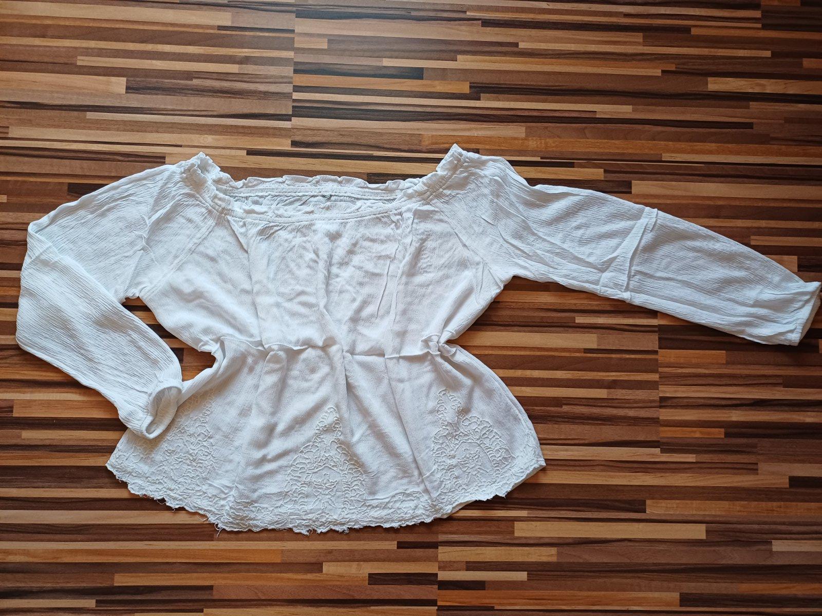 Ľahká, letná, biela blúzka, veľ. sedí na M. Rukáv ukončený gumičkou, lodičkový výstrih. Dĺžka od ramena po spodný okraj 50 cm.