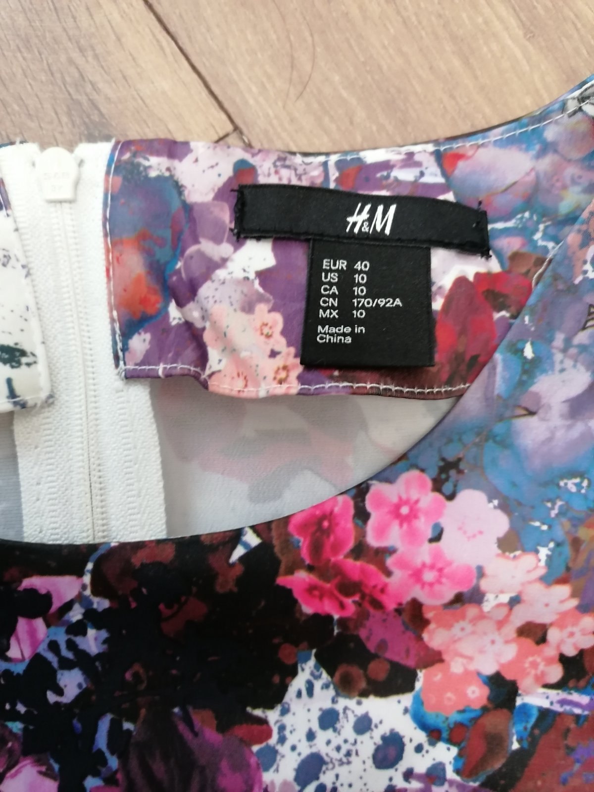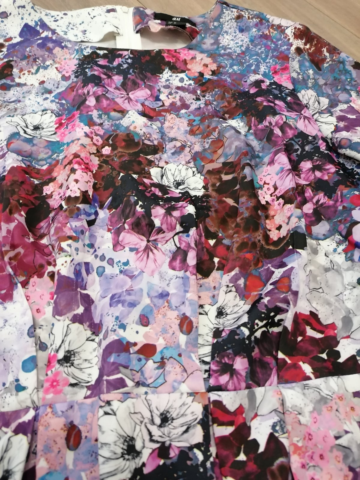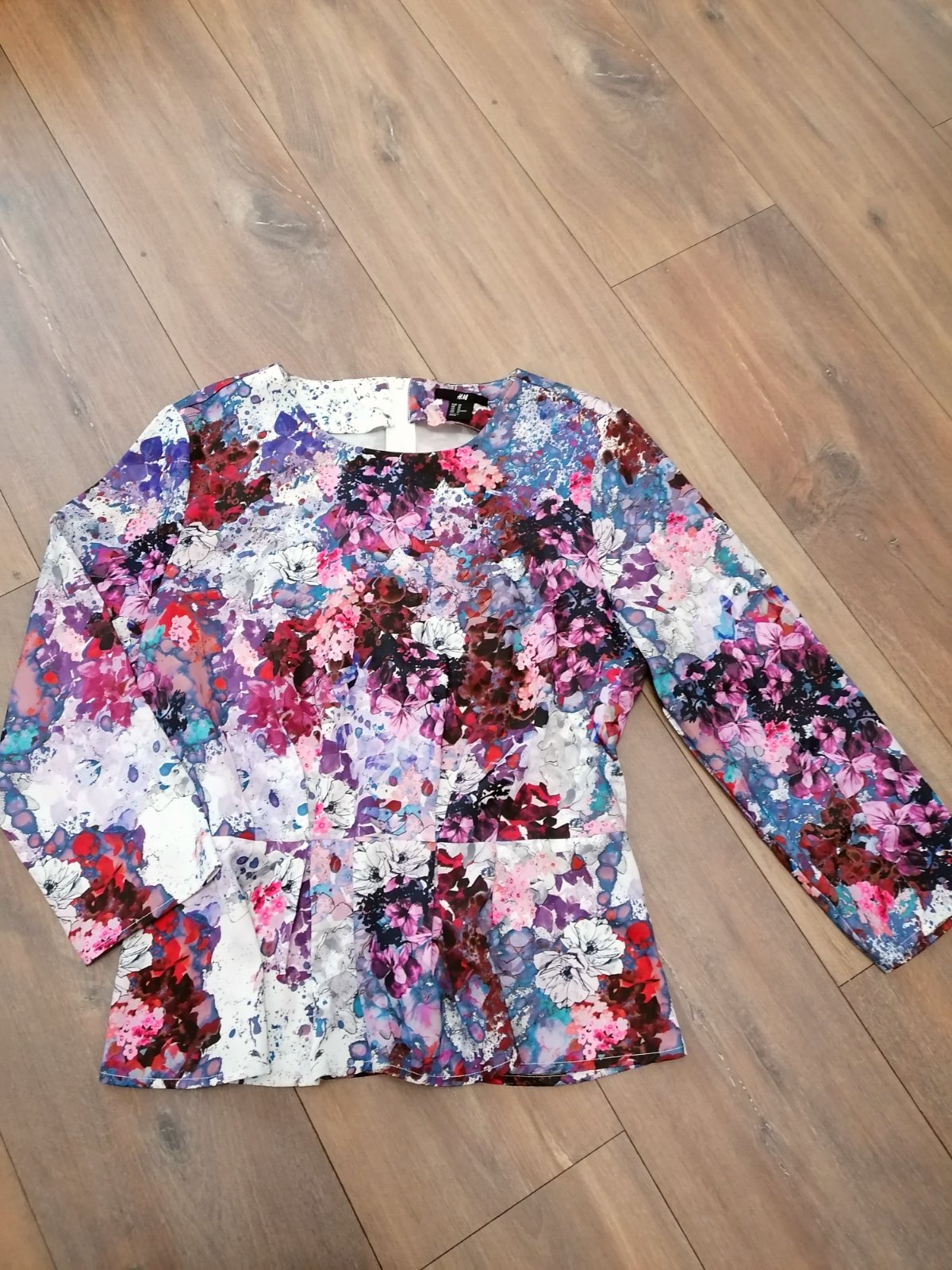 Krásna lahučká blúzka peplum strihu, nekrčivá, niečo ako satén. Vzadu sa zapína na zips. Rukávy sú také niečo medzi 3/4 a dlhým, širšie. Pekne formuje postavu. Je vo výbornom stave akorat na jednom rukáve akoby zatrhnuta nitka (na foto), ale keďže je taka farebná tak to pri nosení vôbec nevidno. Dĺžka 59 cm, šírka v prsiach 48 cm.