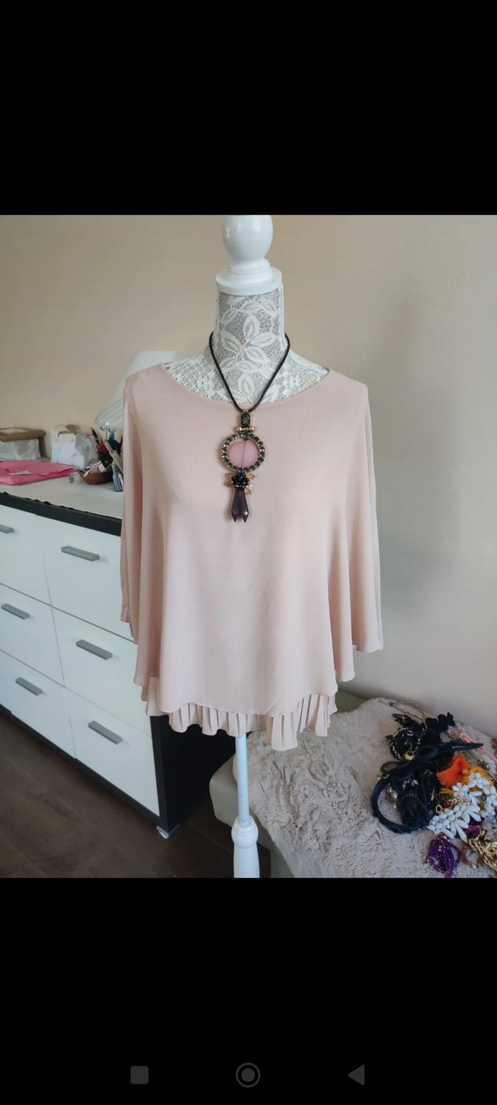 Krásna predĺžená tunika s dlhým rukávom, pohodlný rozšírený áčkovy strih, nosena krátko, bez akýchkoľvek poškodení.....celk.dl. 88cm, šírka pod pazuchami 2*57cm, rukáv od krku 74cm... poštovné pod...