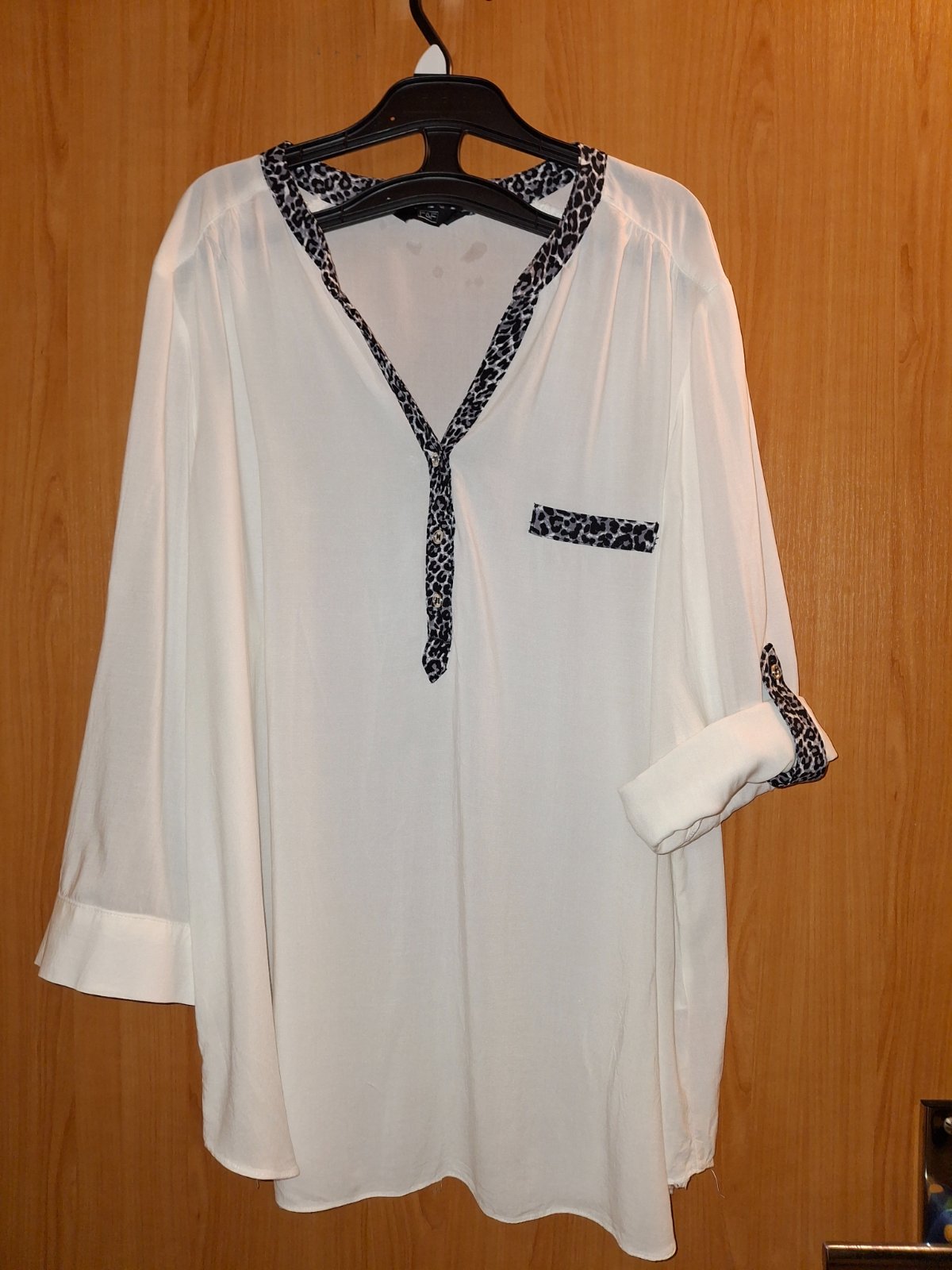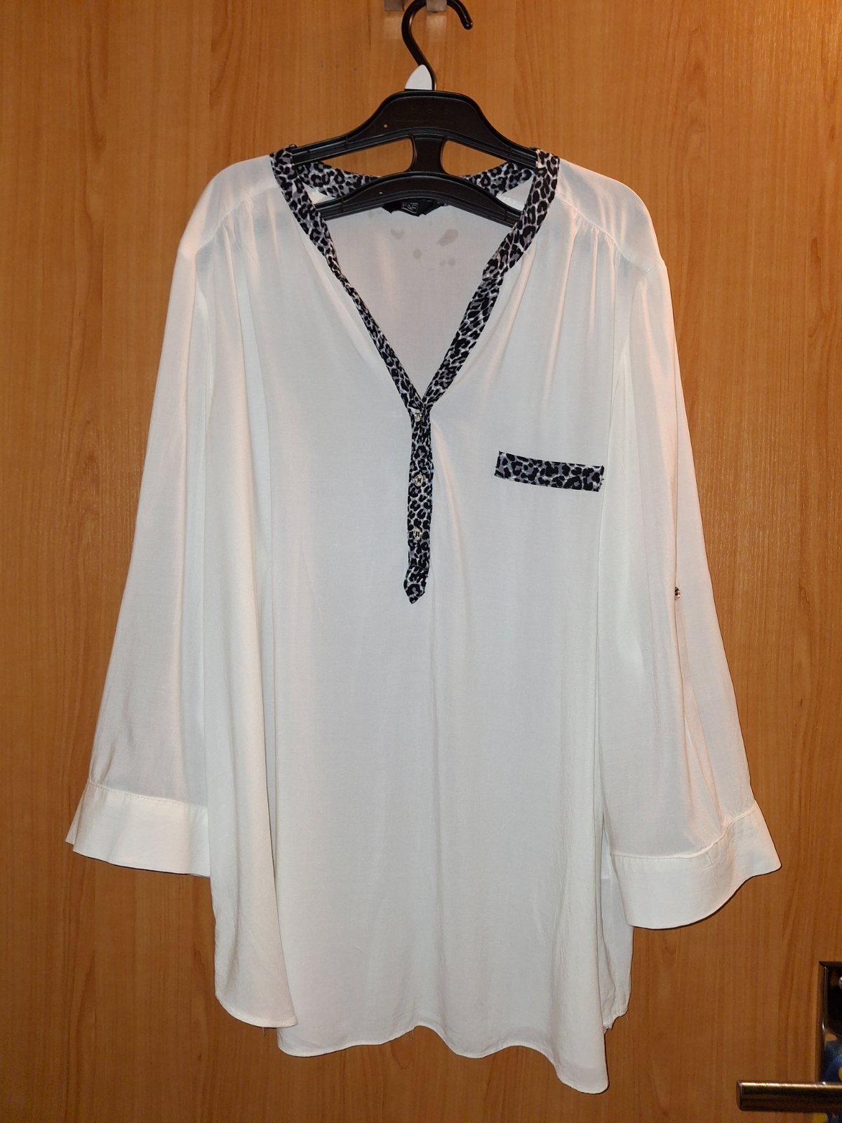 Ľahká biela blúzka volného strihu s možnosťou skrátenia rukávov vyhrnutim a zapnutim. Veľmi príjemná na telo. Veľkosť je 46 ale lepšie sedí ako 44.Šírka pod pazuchami 60cm , cd cca 70cm, rameno 12cm