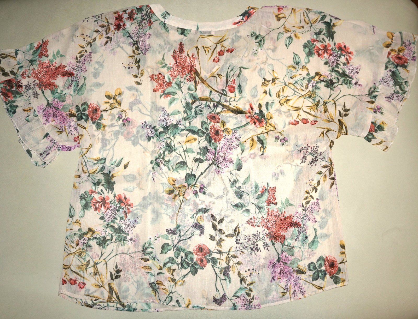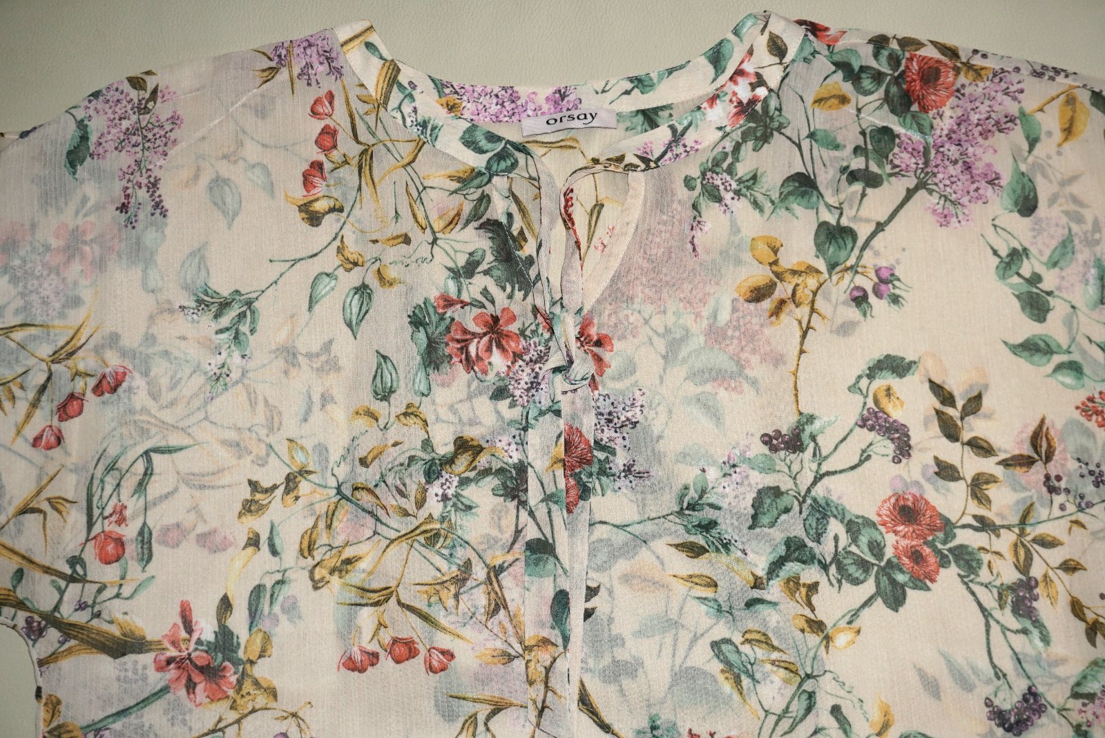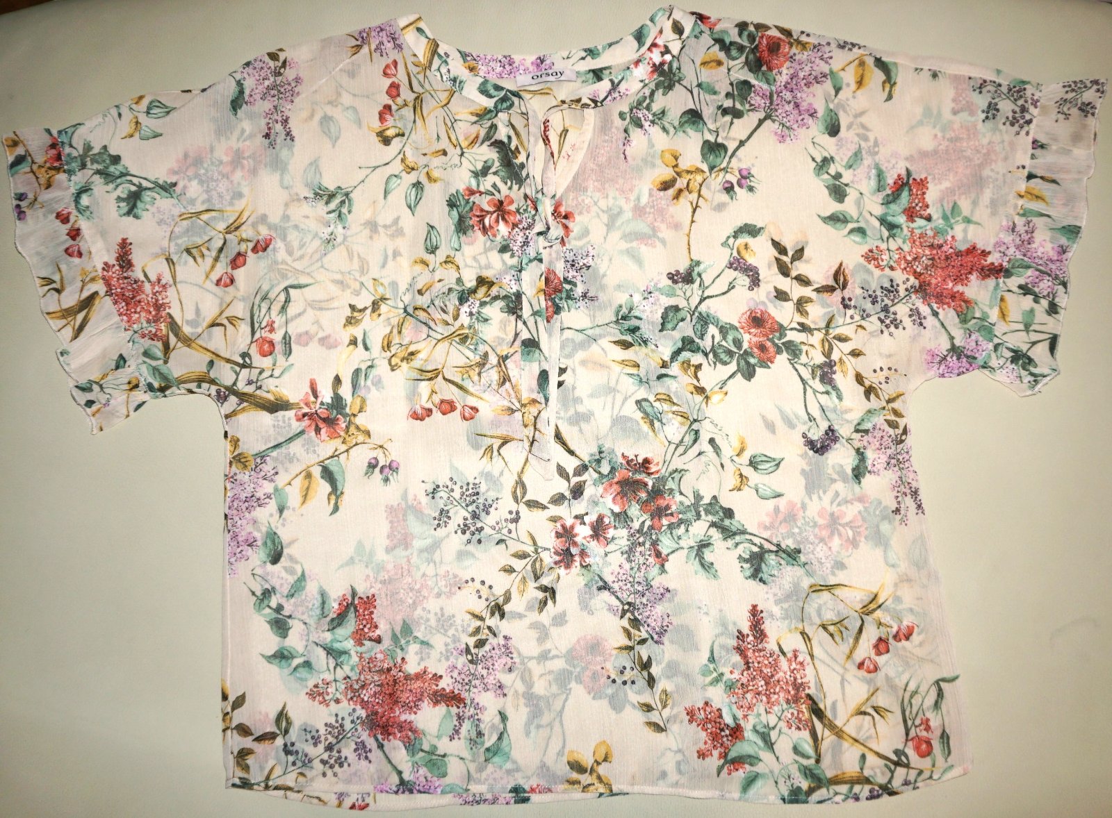 Ľahučká a pohodlná blúzka s pekným vzorom. Okrúhly výstih je ozdobený viazaním Rozmer 60x48. Treba sa zmerať. Strihovo je pre viac veľkostí