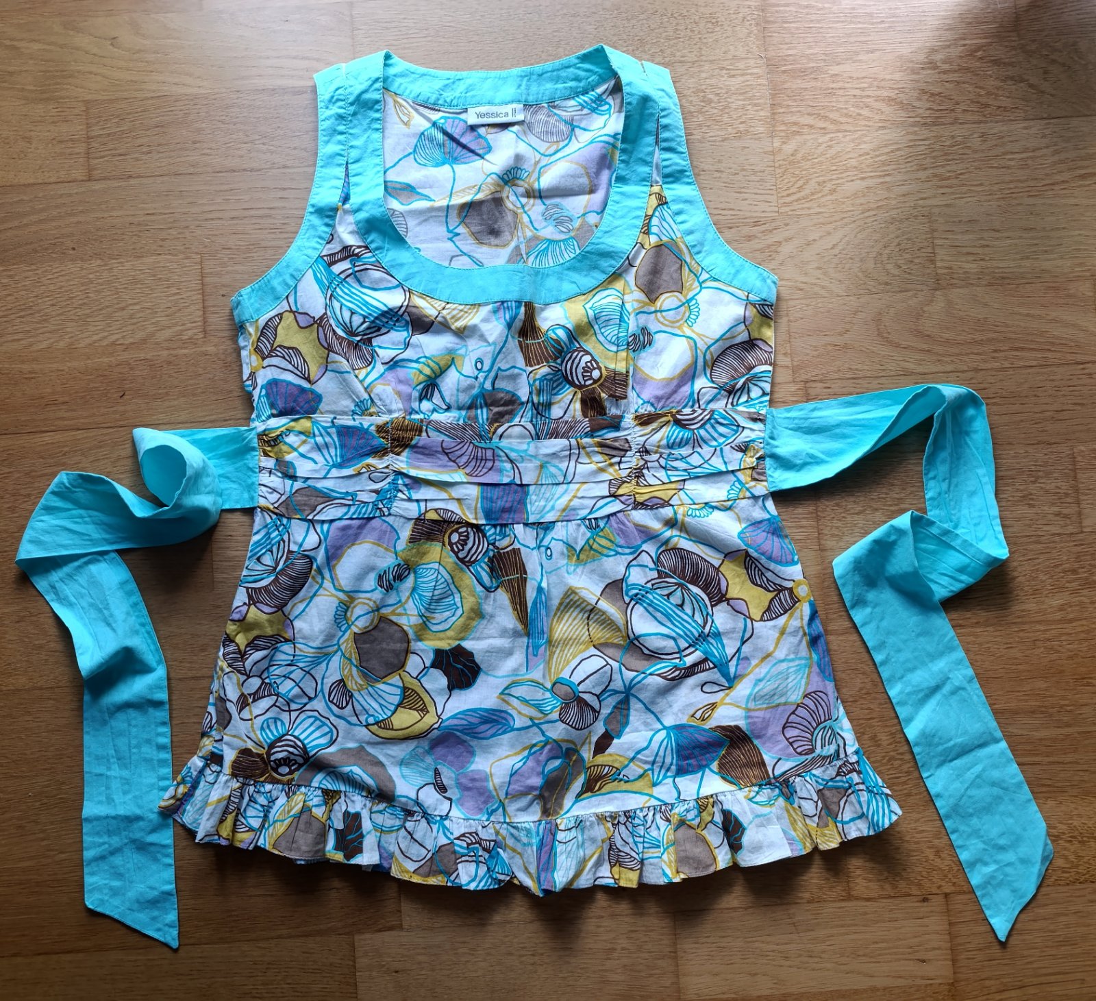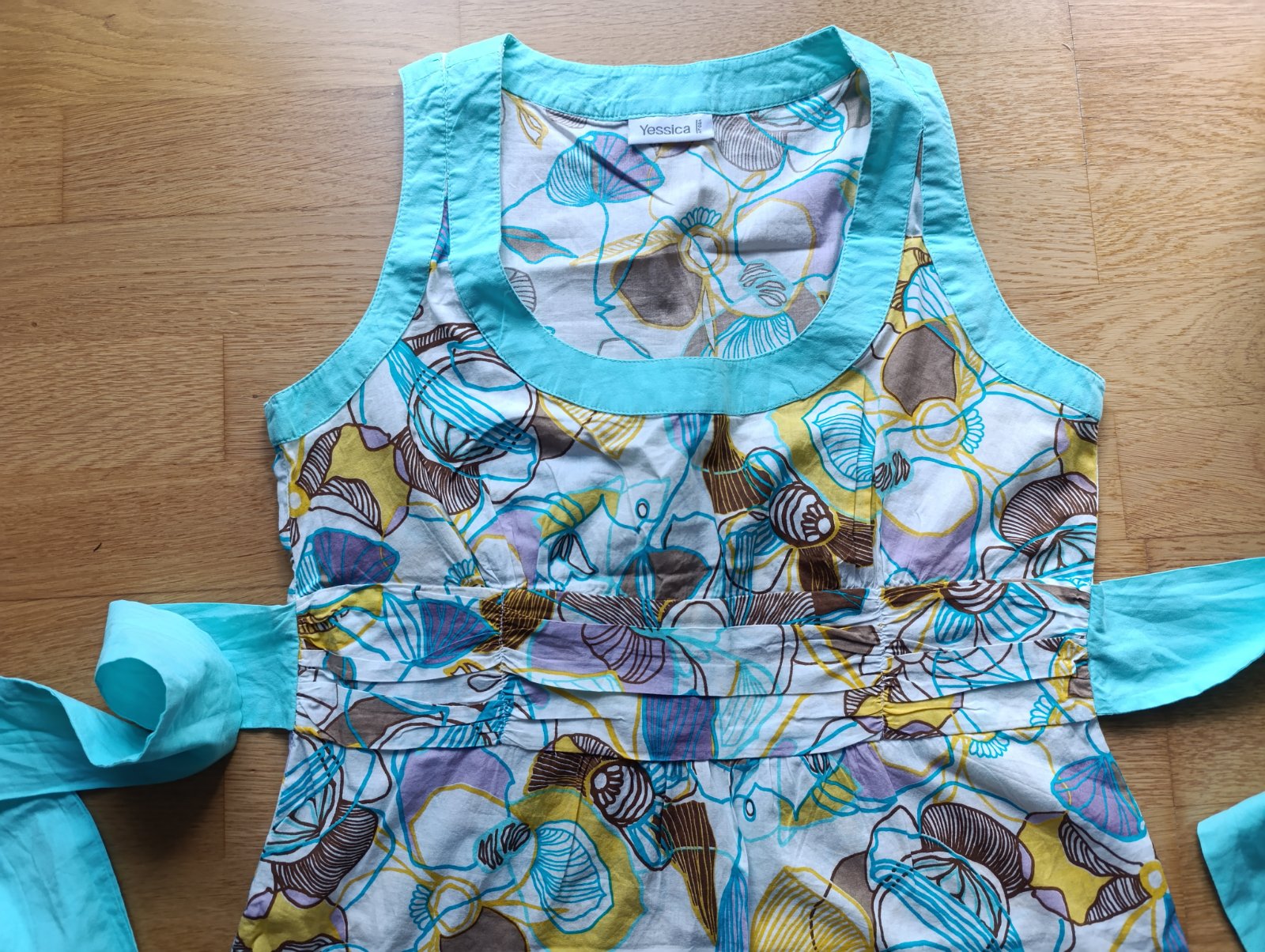 raz oblečené, je mi menší. Tenké plátienko, vhodné na leto. Veľkosť písaná 38, ale je to skôr 36. Mašľu je vhodné zaviazať na chrbte, vpredu je taký preložený zvýšený pás s jemným riasením na prsia, ale nie je to hrubé, látka je mäkká. Na to páse š 41,5 cm, pod pazuchou 46 cm, dĺžka aj s volánikom 65 cm. Ako nové