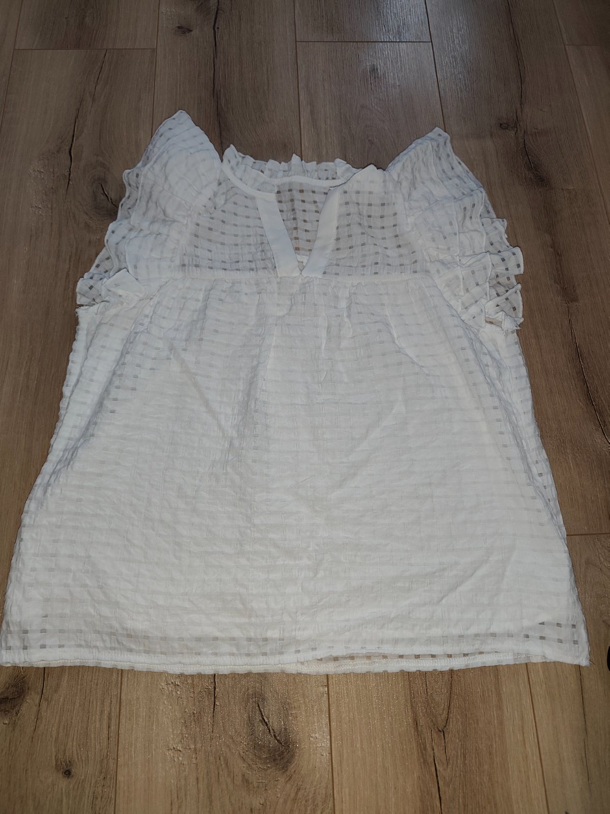 Priehľadná, voľná blúzka.Skôr smotanová ako biela. Na etikete veľ.L. Nositeľná na S, M, L..Voľná, padava látka. Zadny strana blúzky preflžená. Bez poškodenia. Celková dlžka je 74cm.