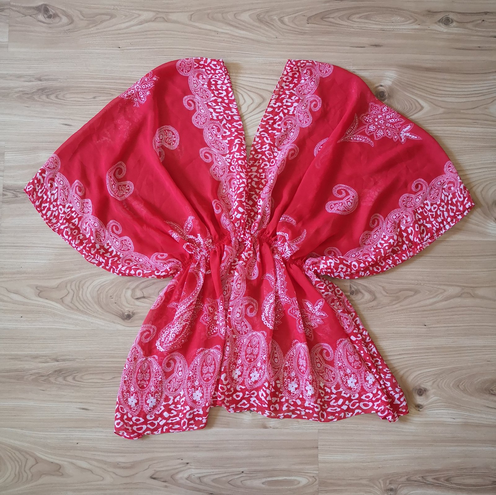 Priesvitná plážová tunika v sýtej červenej farbe s potlačou bielym ornamentov. S hlbokým výstrihom do V a stiahnutím na gumičku pod prsiami.