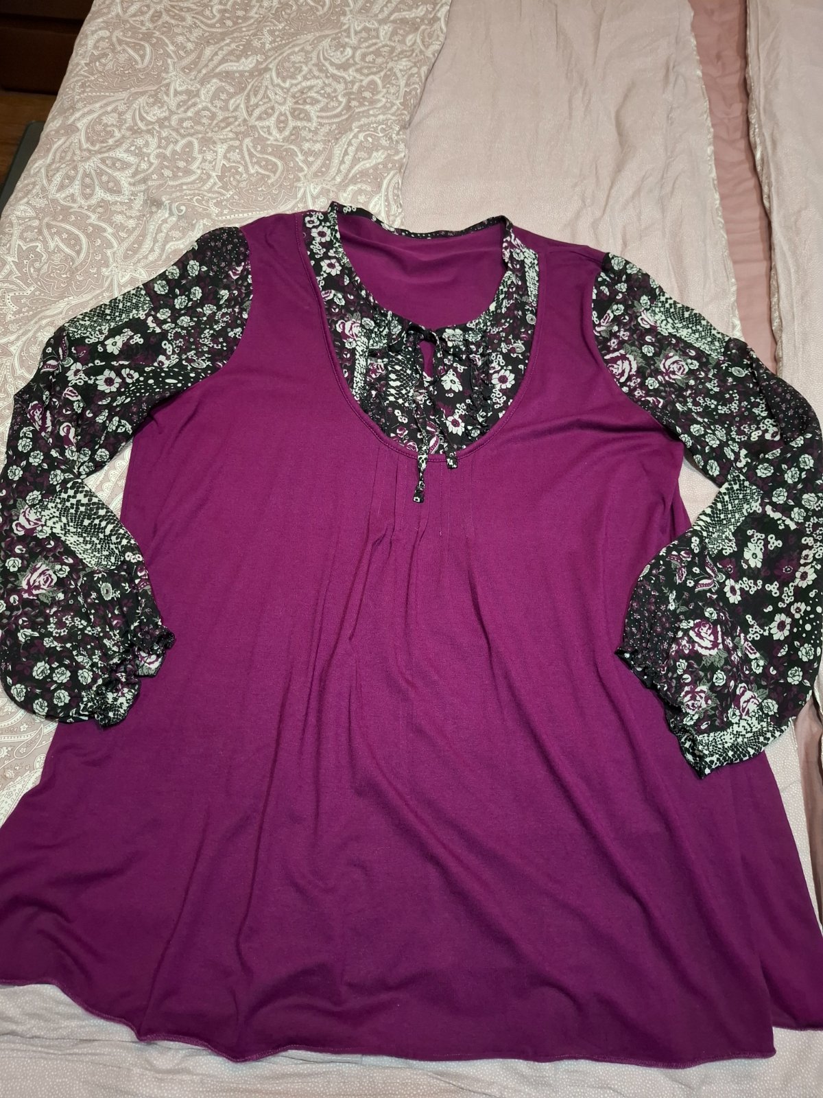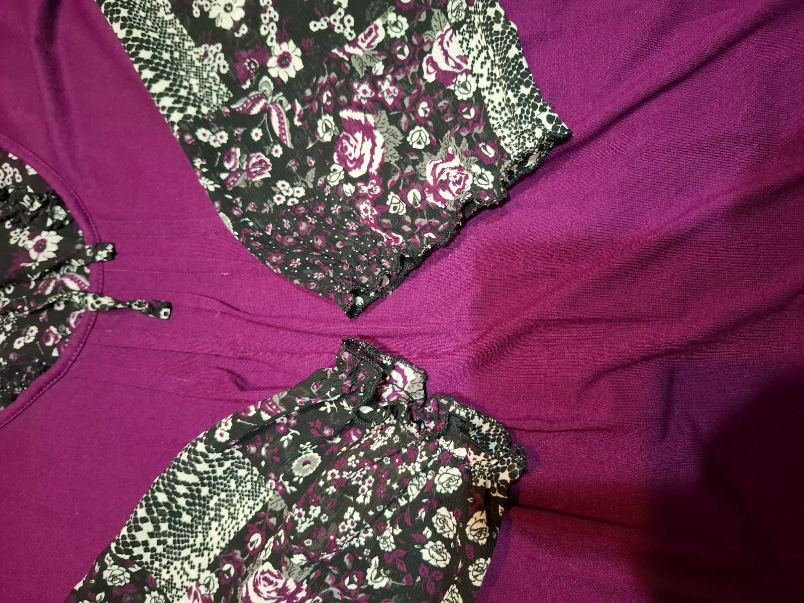 Tričko-blúzka alebo tunika. Veľkosť odhadom. Šírka 54cm, dĺžka 75cm. Rukáv ľahký/priesvitný. Na poslednej foto vidieť, že nie je rovnako stiahnutá gumička.