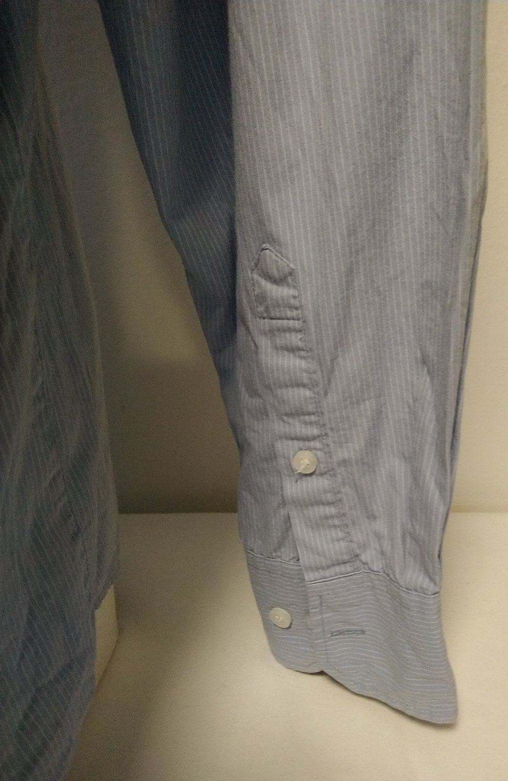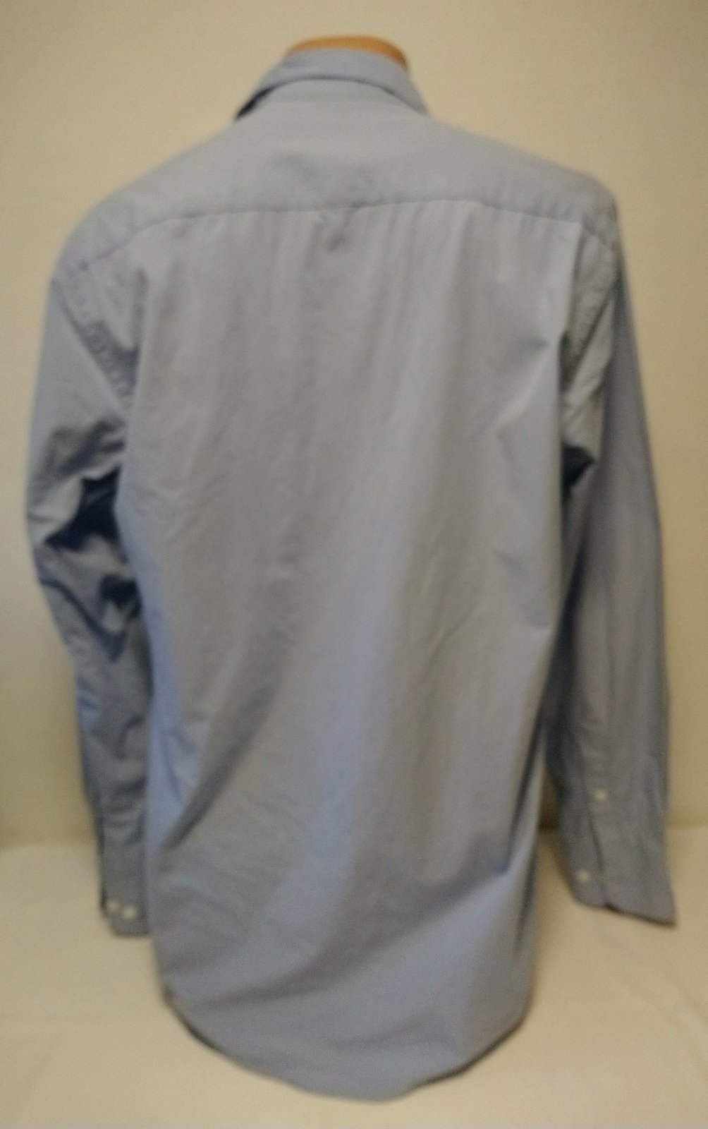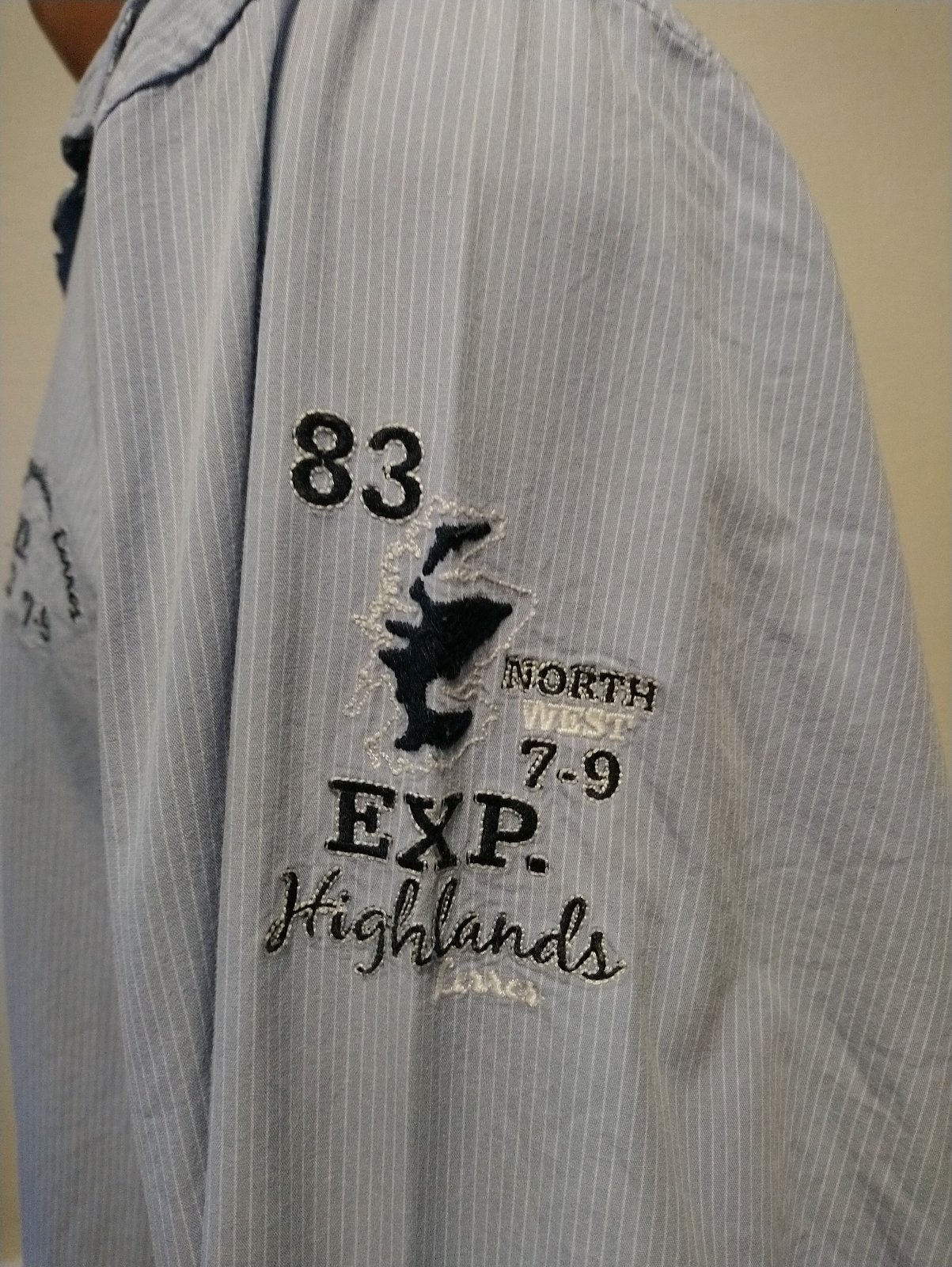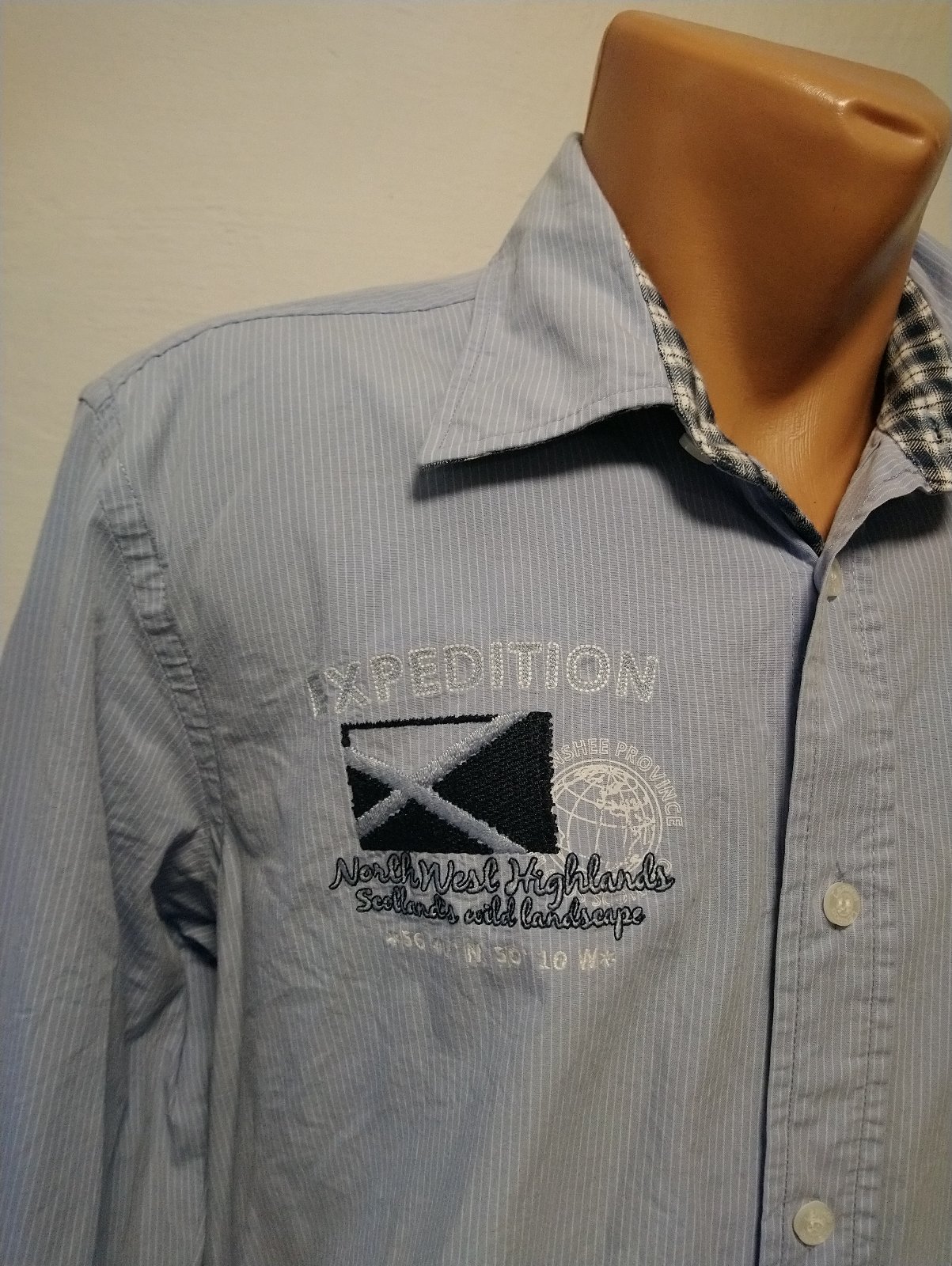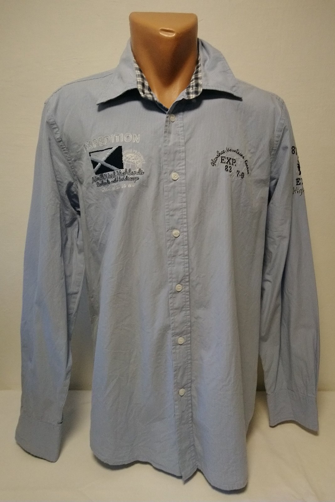 pánska modro biela košeľa, zvislé biele pásiky, zapínanie na gombíky, motív s nápisom v predu, na rukáve,,