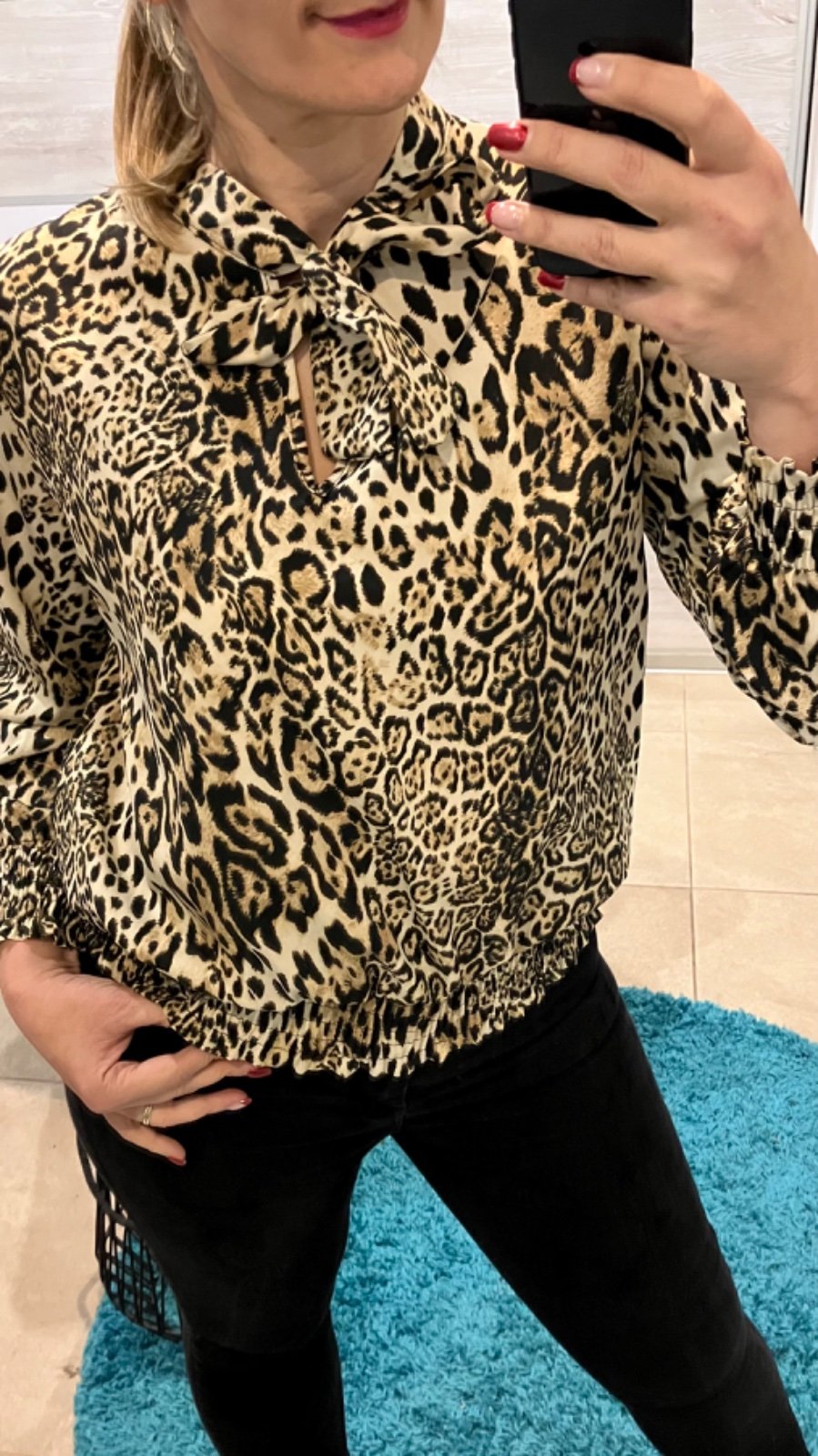 Moderná dámska blúzka s dlhým rukávom, so zaväzovaním okolo krku a leopardím vzorom. Na drieku a na rukáve je široká elastická guma. Blúzka je ležérna. Tenká.