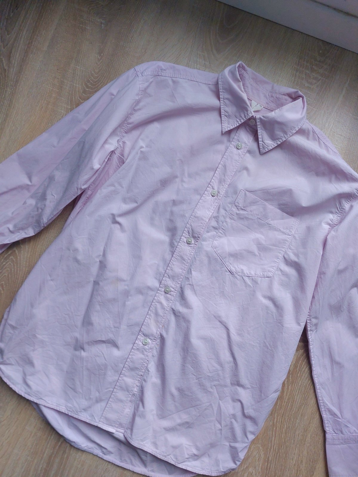 Predám košeľu Arket v jemnej ružovo fialkovej farbe, veľkosť Xs, ale je je oversized a sadne aj na S. Vpredu má malé fliačiky, viď foto, zohľadnené v cene.