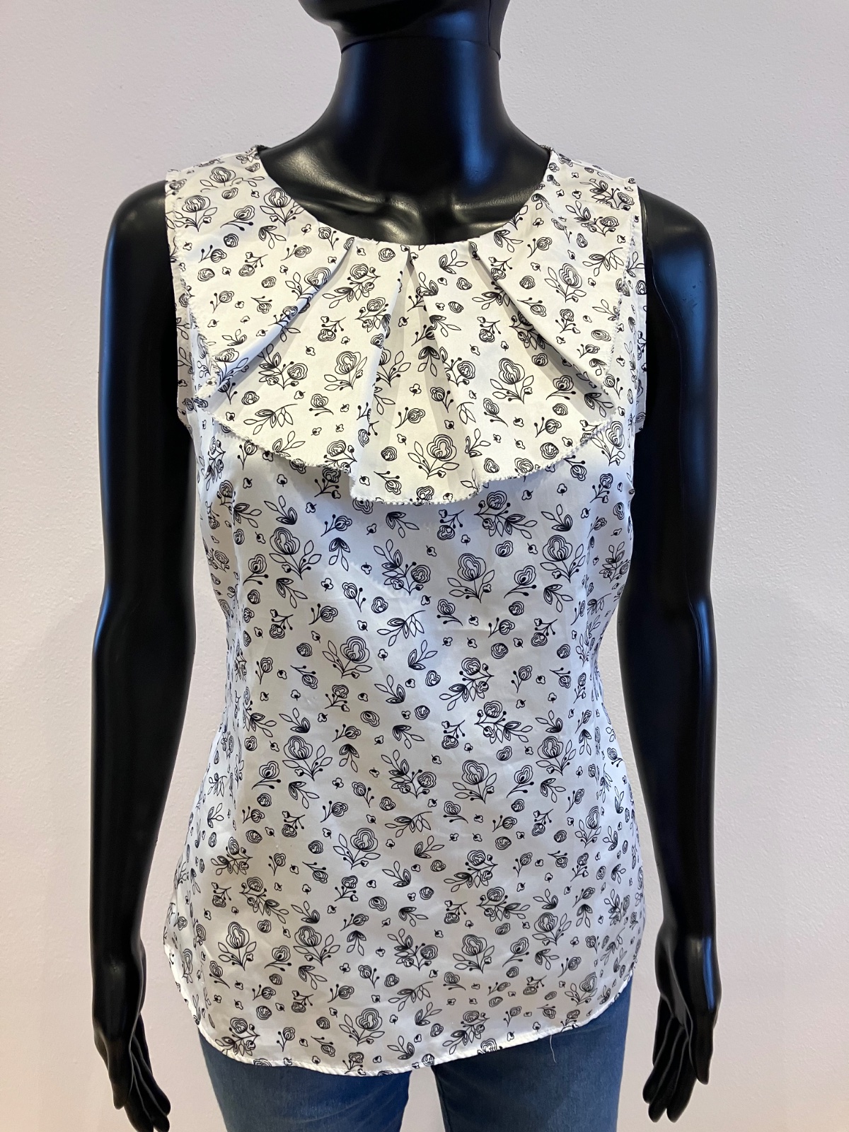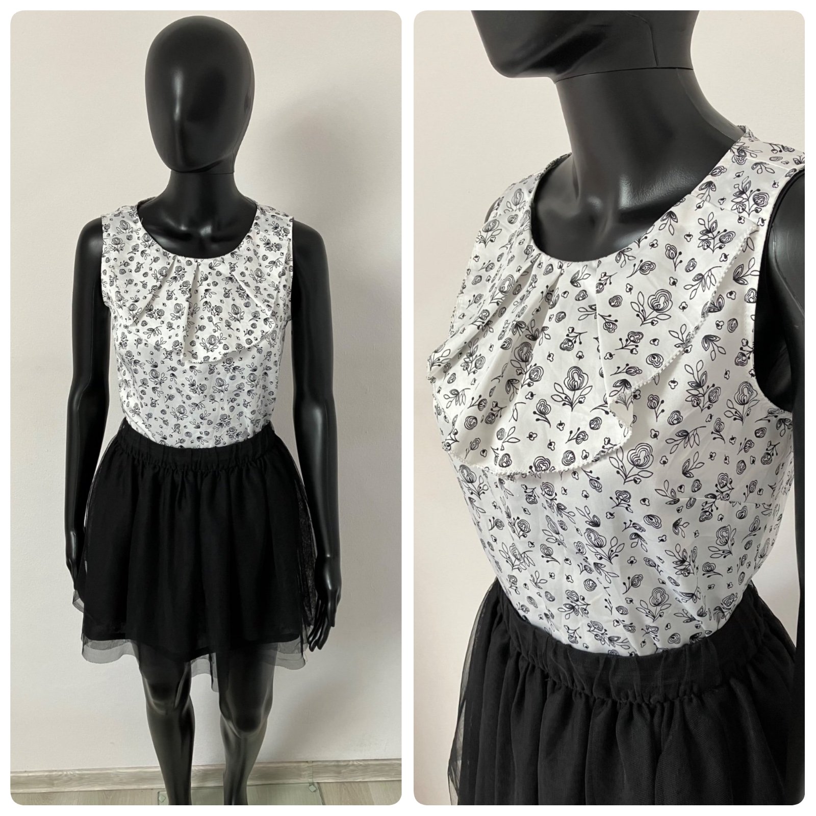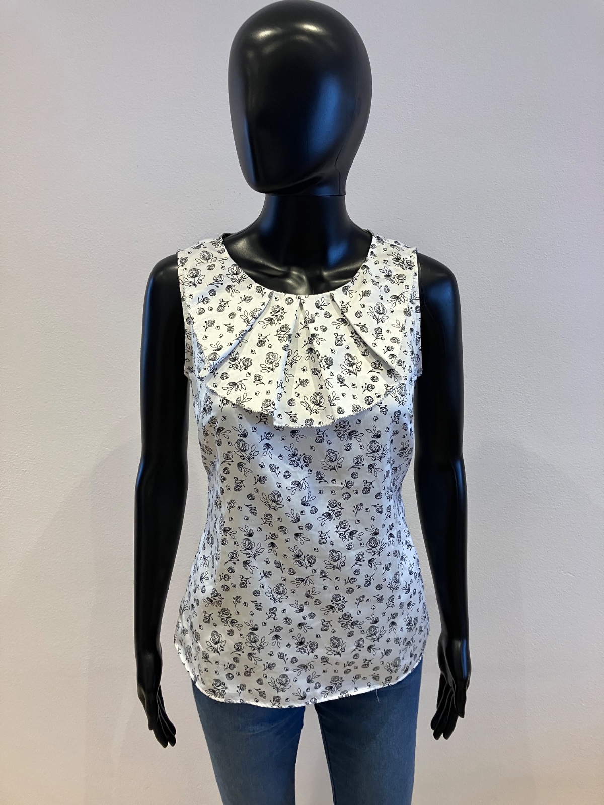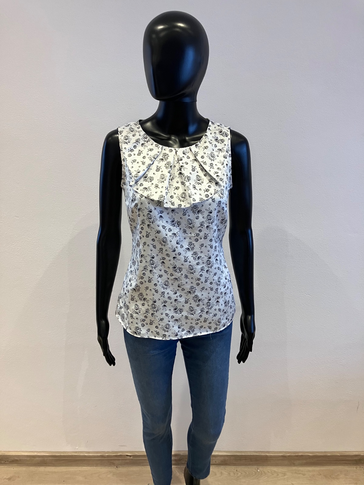 Dámska dievčenská blúzka bez rukávov, vzorovaná, s volánom, tenká, zapínanie vzadu na zips, nie je elastická, materiál 100%polyester.