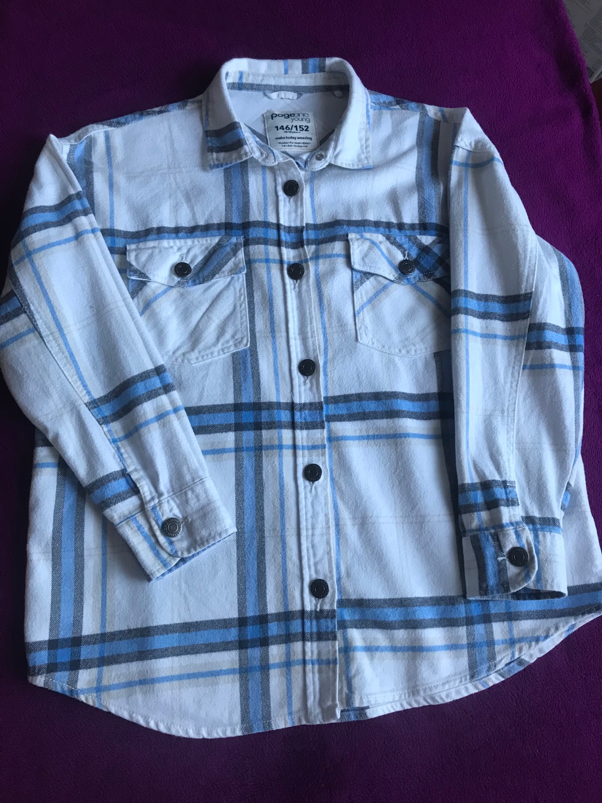 Košeľa v super stave bez poškodenia a fľakov. Všetko je na foto. Zapínanie je na kovové gombíky. Zloženie - 100% bavlna. Velkost je uvedená 146/152. Celková dĺžka - 62 cm. Šírka - 2x52 cm. Dĺžka rukáva od pleca - 45 cm. Nie je to hrubé ako kabát. Dcéra ju nosila rozopnutú na tričku. Odporúčam👍👍👍👍