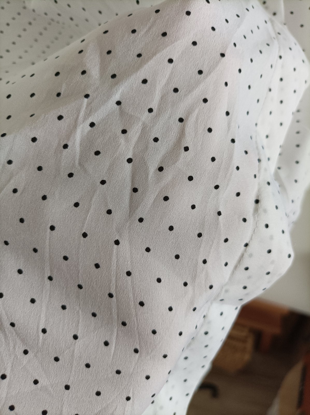 Bodkovaná velmi vkusná bluzka , vhodná do kancelárie aj k dzinsom do mesta :-) je tenka, lahka, ma prekrytie ak chcete nepriznane gombiky ,zalezi ako si to zazehlite, otvorene alebo prekryte. ma odnimatelnu snurku ktorá sa viaze ku krku, gombicky aj na rukavoch takze si z toho viete urobit vkusne kratsie vyhrnute rukavy. Skratka velmi vsestranna bluzka. je jemne priesvitna , na 4 foto je odfotena na ruke pre predstavu. Oblecená jeden krat - kedze zehlenie je smrť , uz som ju nevynosila , tato bluzka si zasluzi niekoho, kto dramaticky neplace tri dni lebo musi zehlit :-D preto ju posuvam dalej.