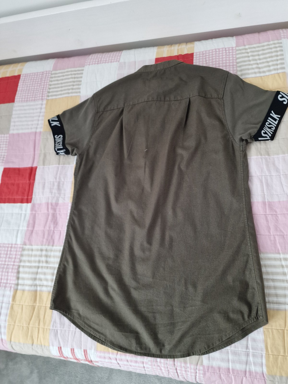 Nádherná khaki farba, nízky golier, rukávy ukončené akoby gumičkovým lemom s reflexným nápisom značky SIKSILK. Pre skutočne chudého slim chalana, pána. Dĺžka je 76 cm, pod pazuchami 49 cm.