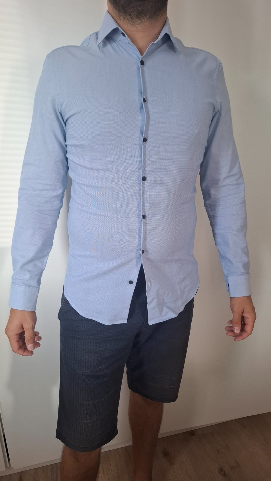 Biela košeľa so svetlomodrým károm, výrazné predné vrecko, značková, kvalitná, zaoblený spodok. Nosená minimálne, bez vád. R: prsia š:59cm, dl:78cm, rukáv od okr:83cm, dol š:59cm.