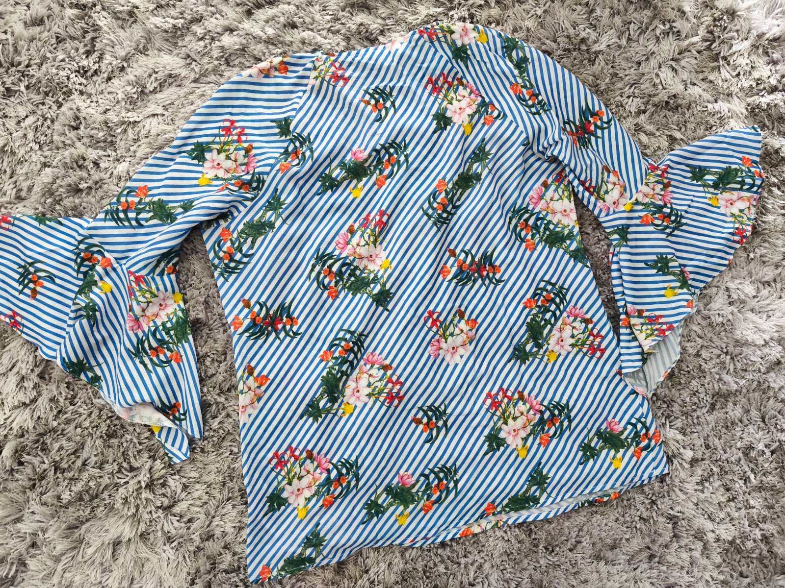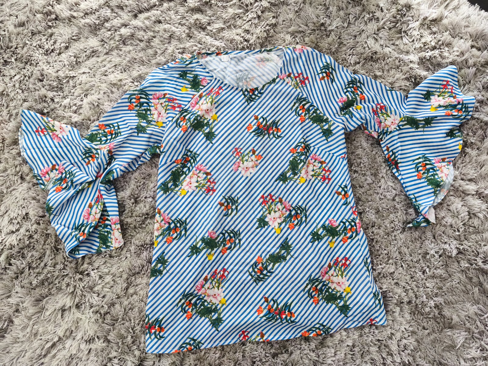 Posúvam túto peknú blúzku v bledomodrej farbe s kvietkami. Rikáv je 3/4 s volánom, veľmi pekne sedí na postave. Zakryje malé nedostatky. Blúzka nosená, veľmi dobrý stav. Na ľavej strane maličké žmolčeky od pása z auta, inak pekná.