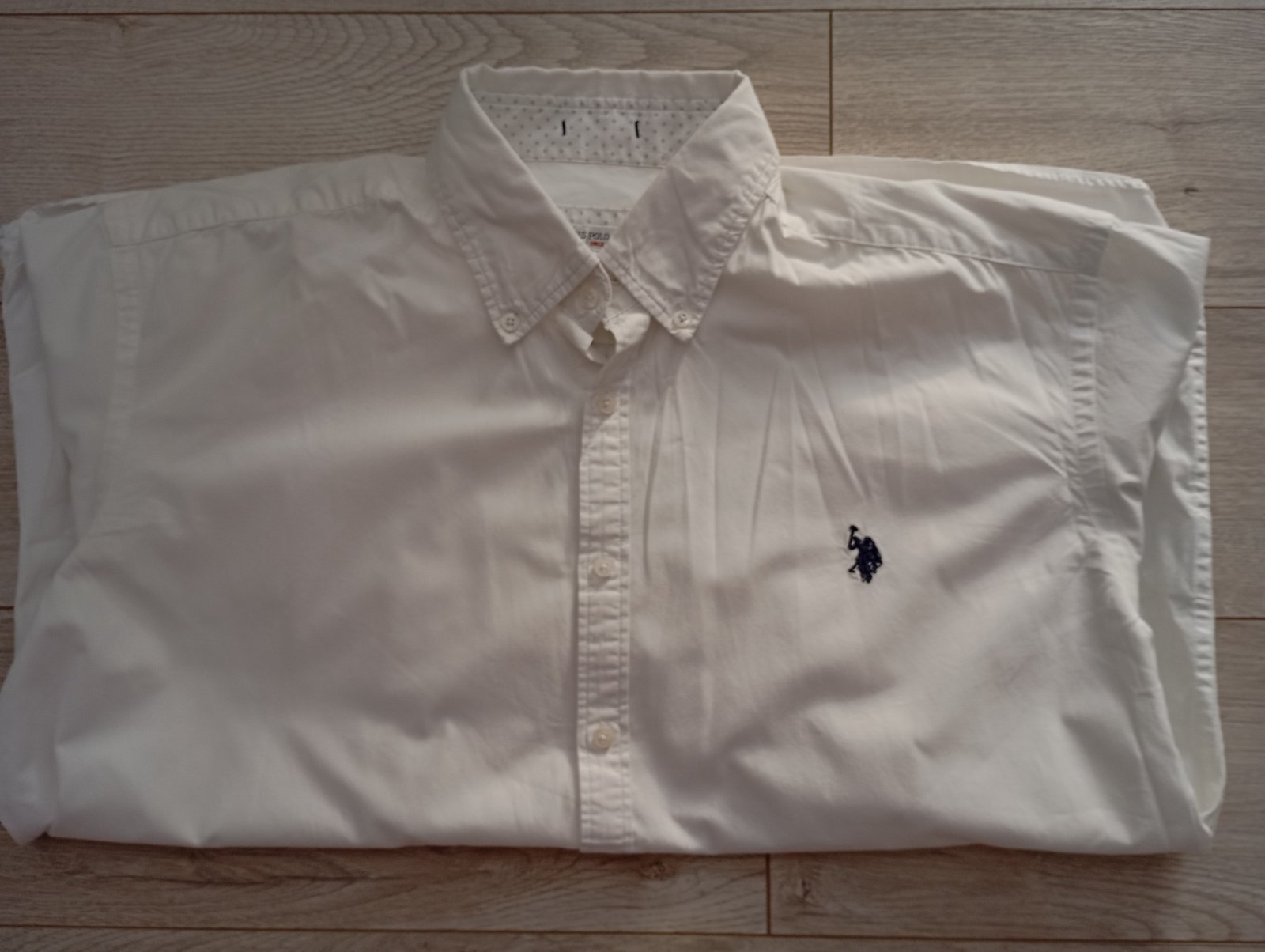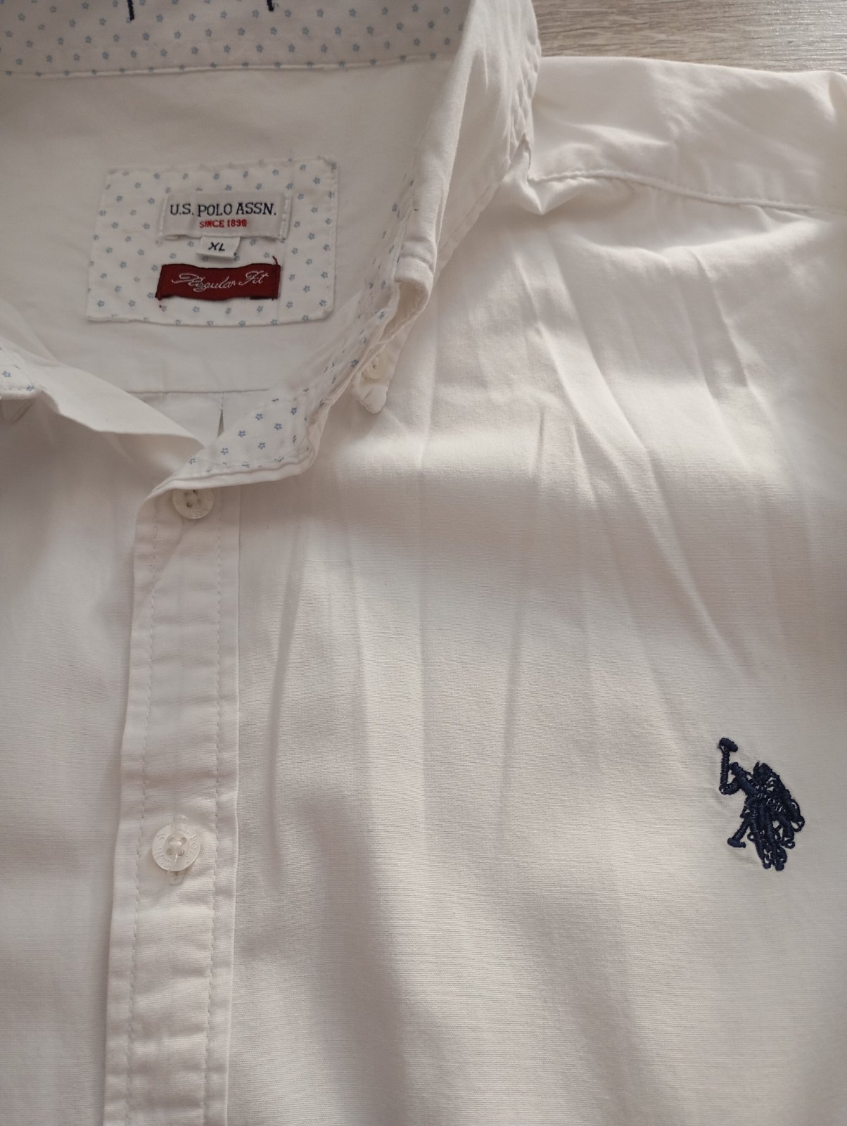Predám pánsku košeľu U.S.POLO.ASSN, veľkosť XL, bielej farby, znak vyšívaný tmavo modrej farby., zapínanie na gombíky. Bez poškodenia. Cena 9€ plus poštovné.