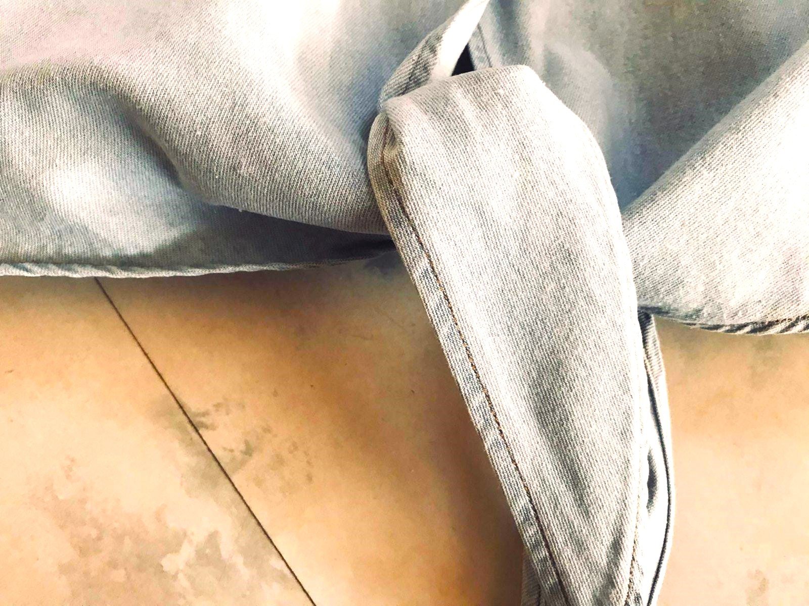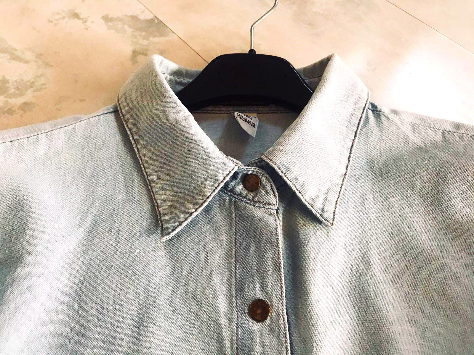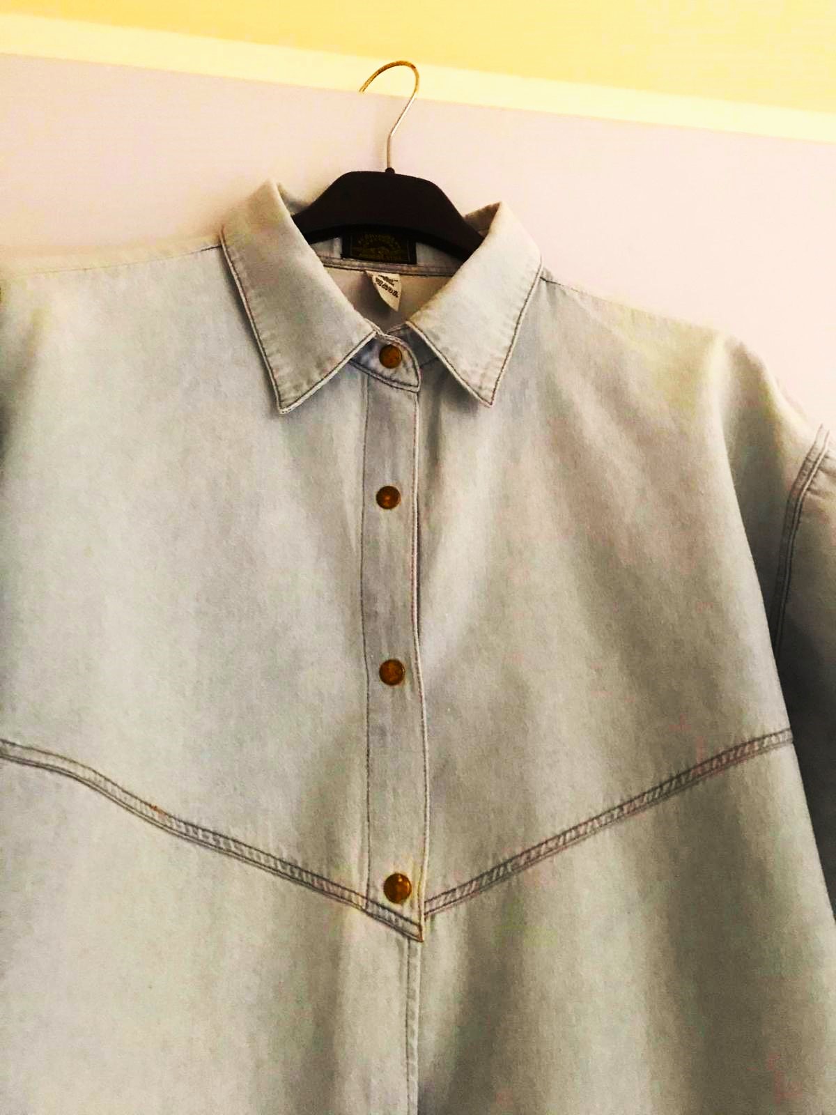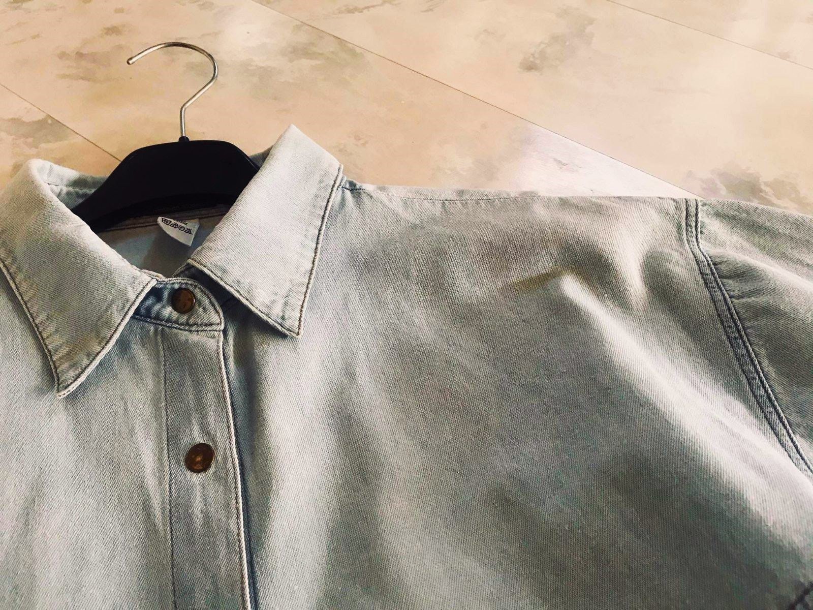 bavlnená riflová košeľa, voľná,na uväzovanie vpredu,šírka = 57 x 2 cm, dlžka celkom = 47 cm, dlžka od pazuchy smerom dole - na boku = 19 cm