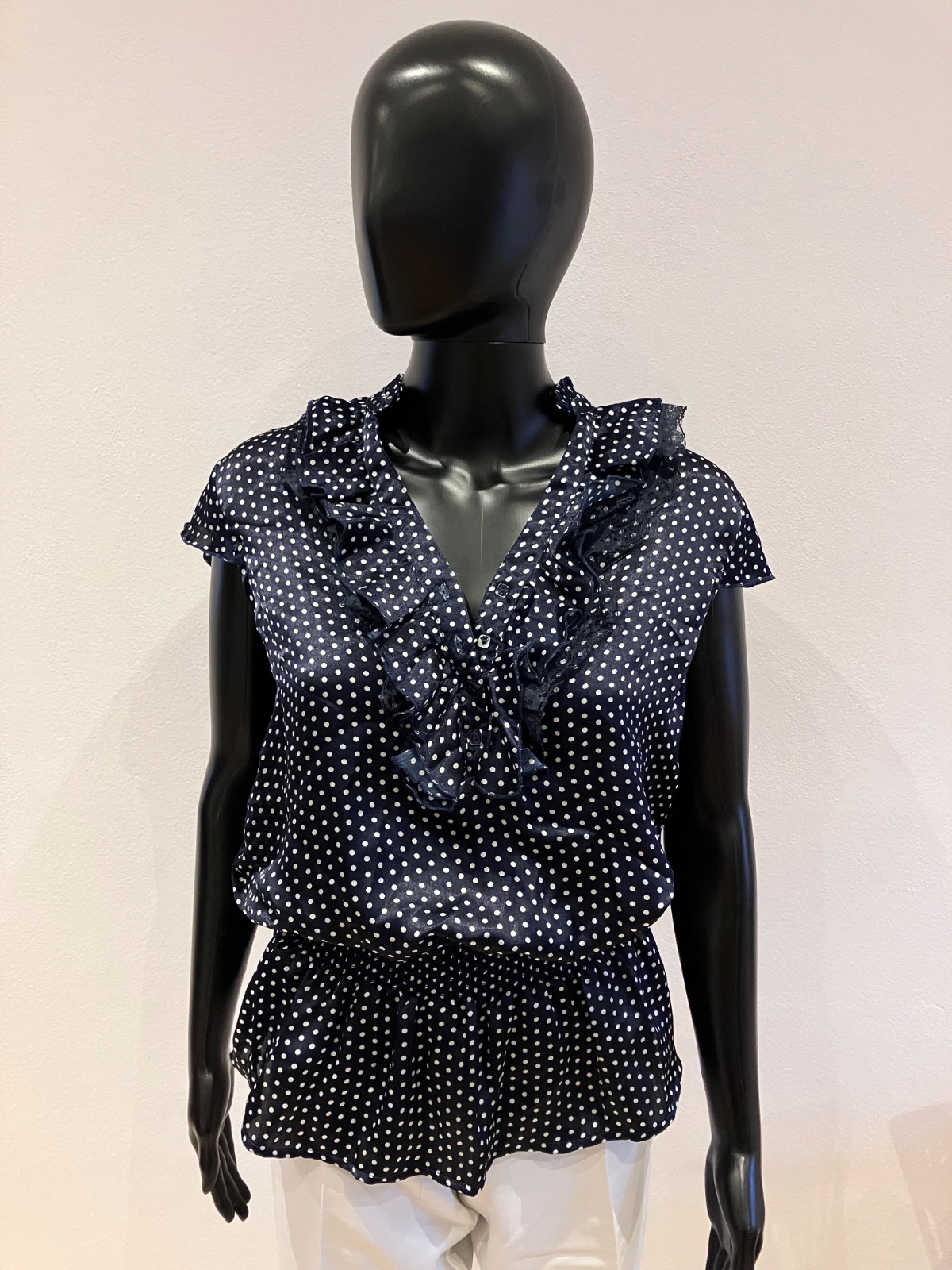 Dámska tmavomodrá blúzka s krátkymi rukávmi a bielymi bodkami, s volánikmi na ktorej je malá čipka, v páse na širokú gumu (elastická). Blúzka nie je elastická. Tenká. S véčkovým výstrihom. Zapínanie na štyri gombíky.