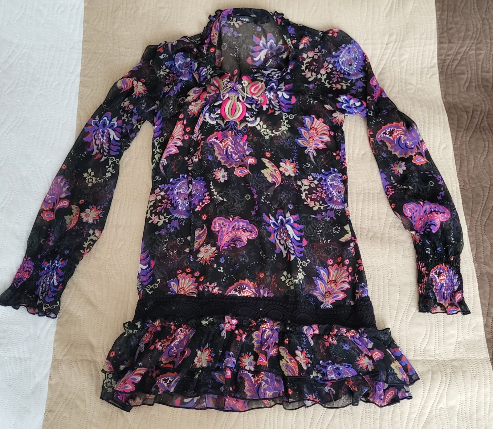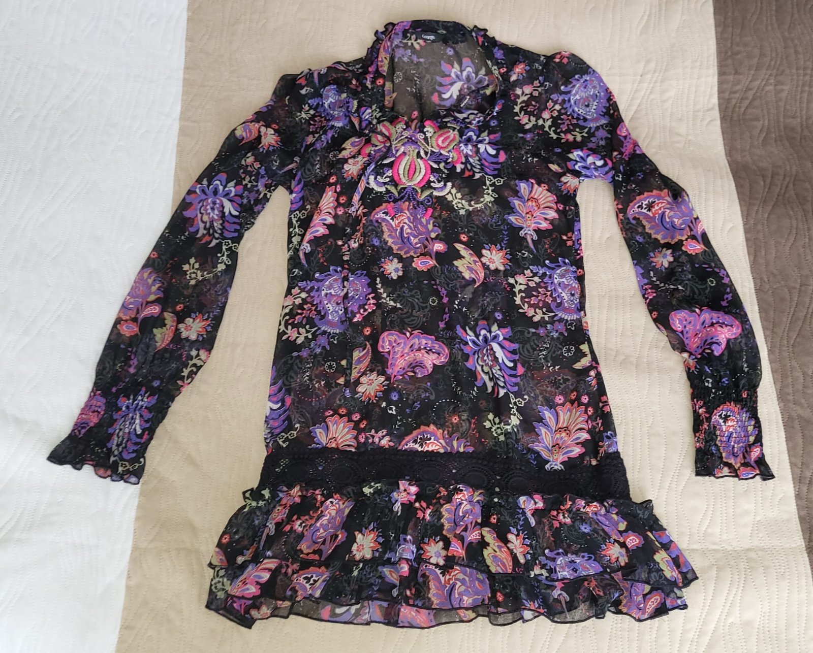Nádherná dvojvrstvová blúzka top zn.George vel.38 sedí na M. Spodok je čierne tielko vrch je priesvitný bodkovaný šifón. Na spodku volán a rukávy priesvitné. Krásna elegantná anglická blúzka, kval...