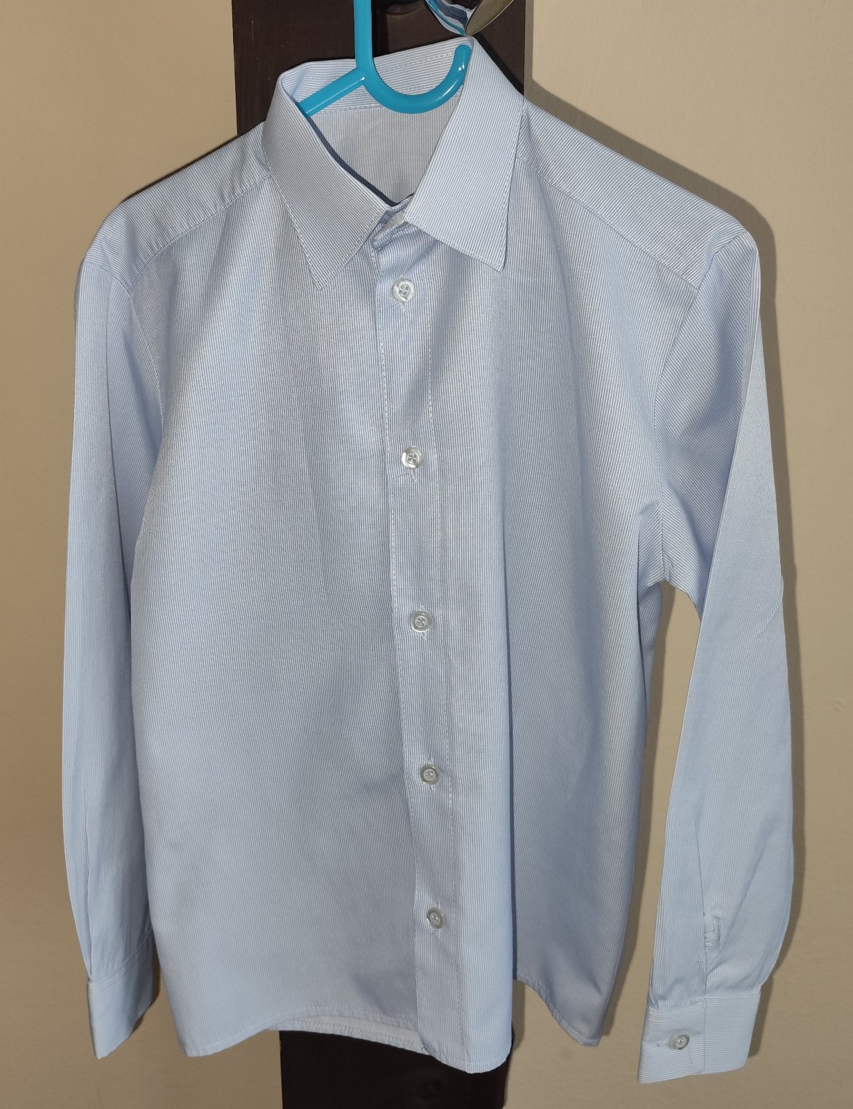 Košeľa má pásikavý vzor modrej a bielej farby, predné zapínanie je na 6 gombíkov perleťovej modrej farby.