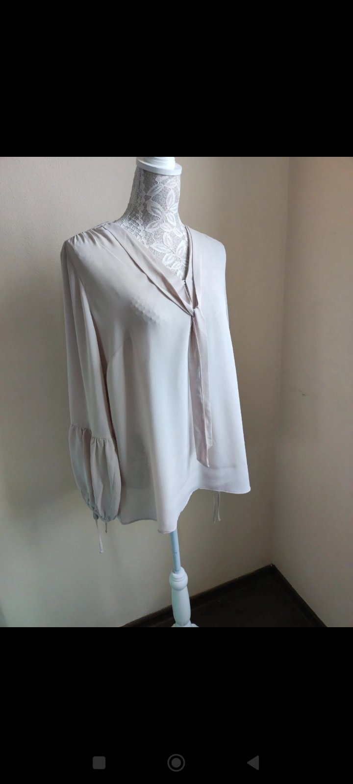 Pekná blúzka v super stave! Podľa mier veľk. 44. Presvitá. Dĺžka - 67 cm, šírka - 2x 55 cm v kľude, rukáv od krku - 73 cm.