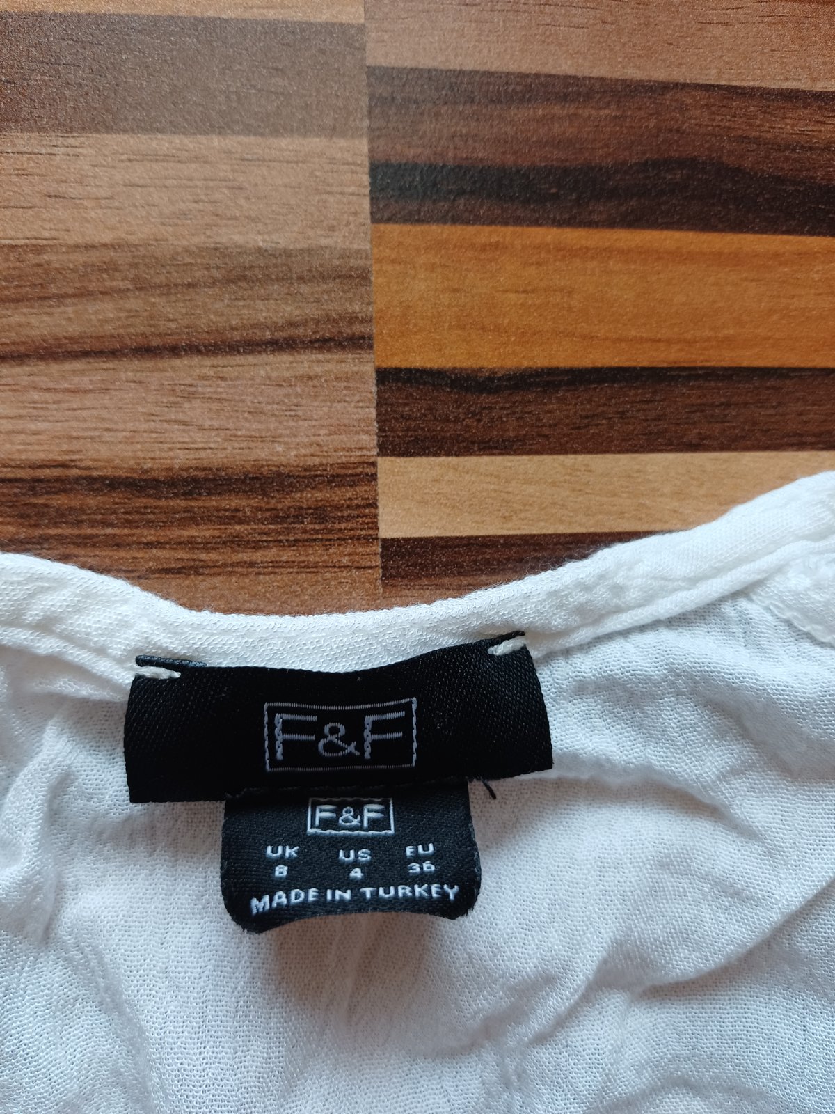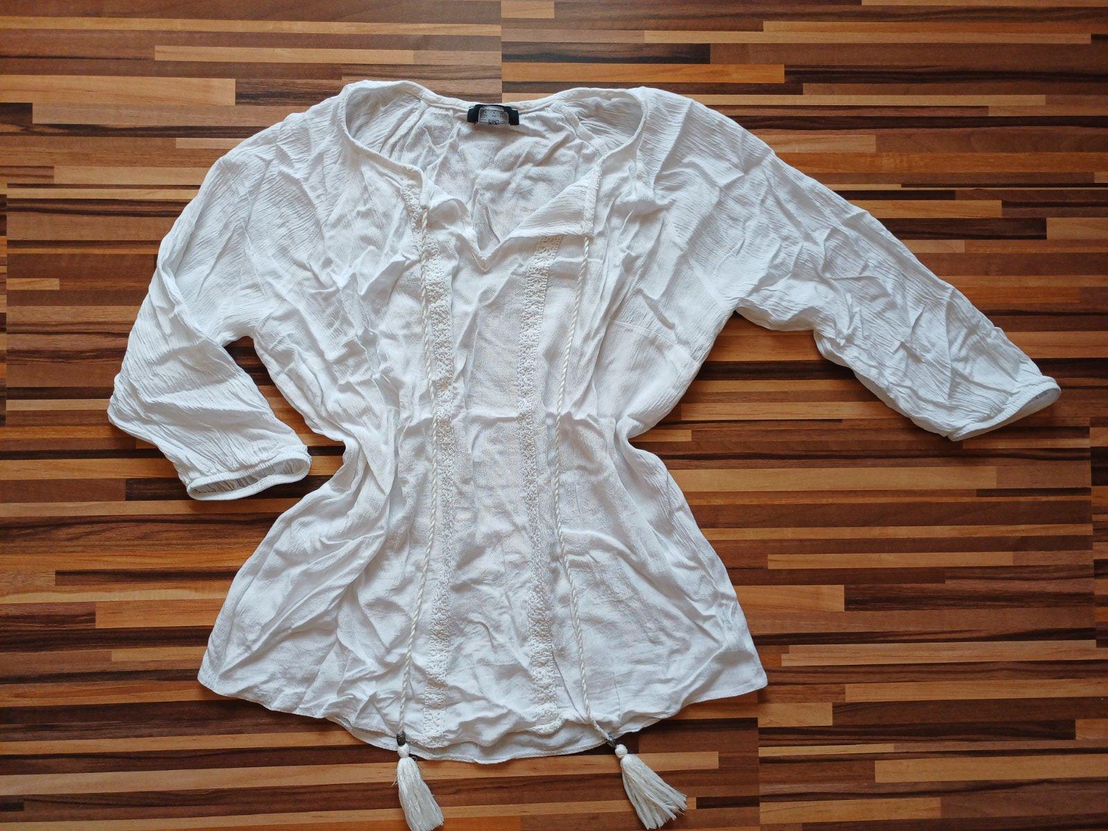 Blúzka zn. F/F, veľ. 38. Ľahká, letná, 3/4 rukáv ukončený gumičkou, biela farba, vo výstrihu šnúrky. Dĺžka od ramena po spodný okraj 58 cm.