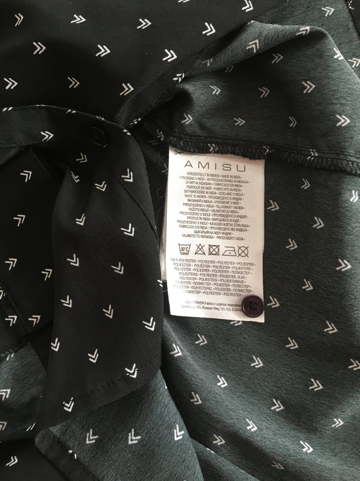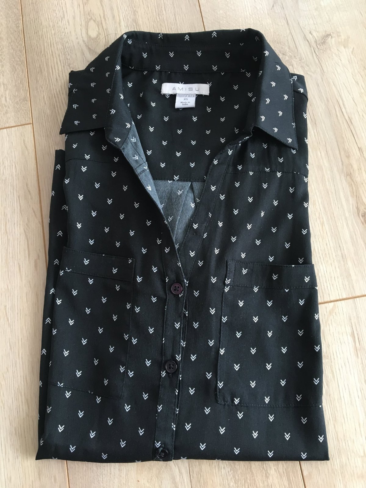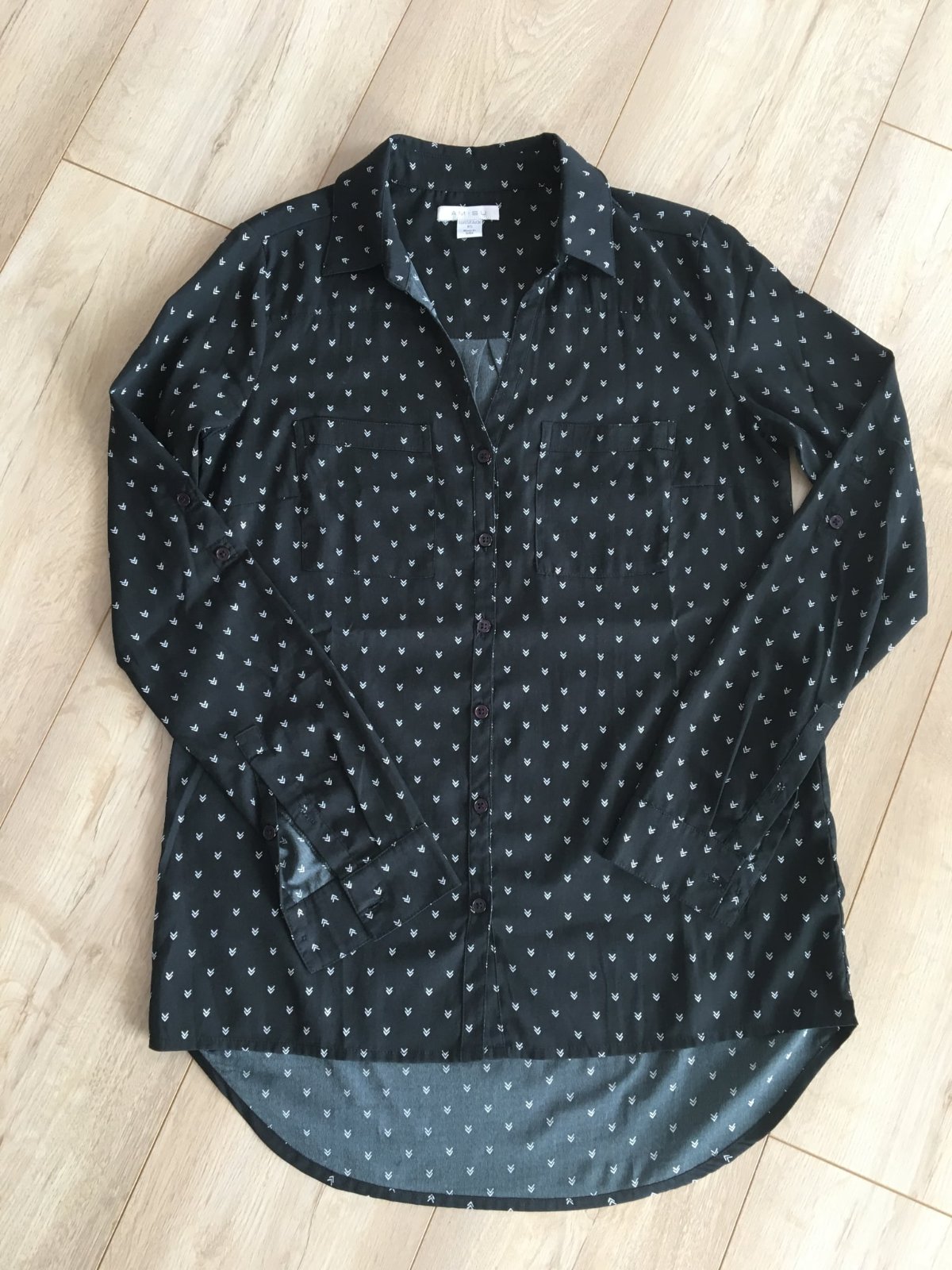 Dámska blúzka na gombíky. Čierny podklad s bielou potlačou. V oblasti pŕs sú situované dve vrecká.