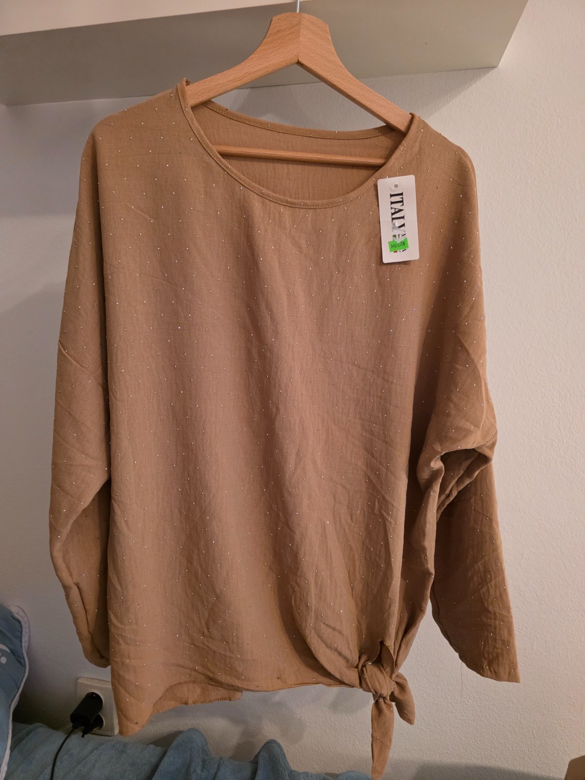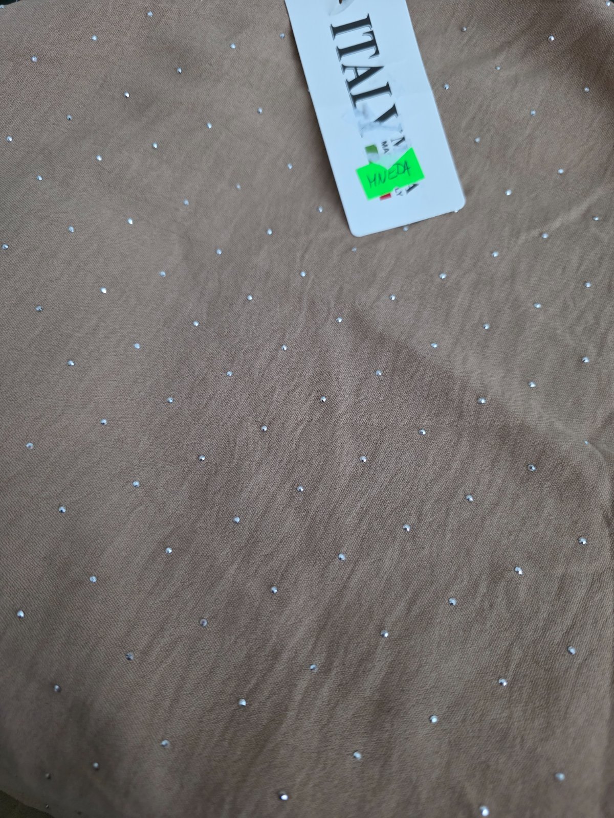 NOVÁ blúzka, bledohnedej farby, po celok povrchu jemné kamienky, na ľavom boku viazanie podľa nálady, uzol alebo mala.