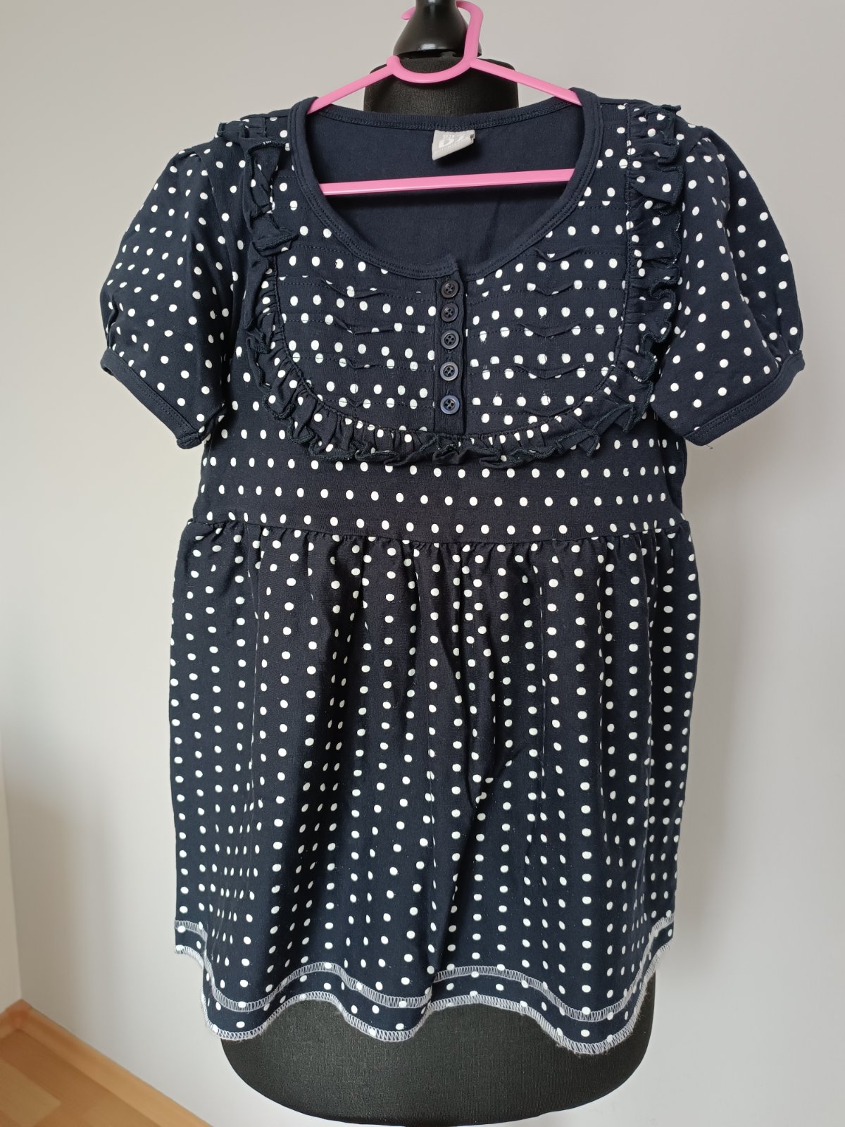 tmavomodro biele pásiky, 100% bavlna, dlžka 56 cm, rukáv od rameno 49 cm, šírka pod ramenom 37 x2 cm, šírka dole 41 cm,
