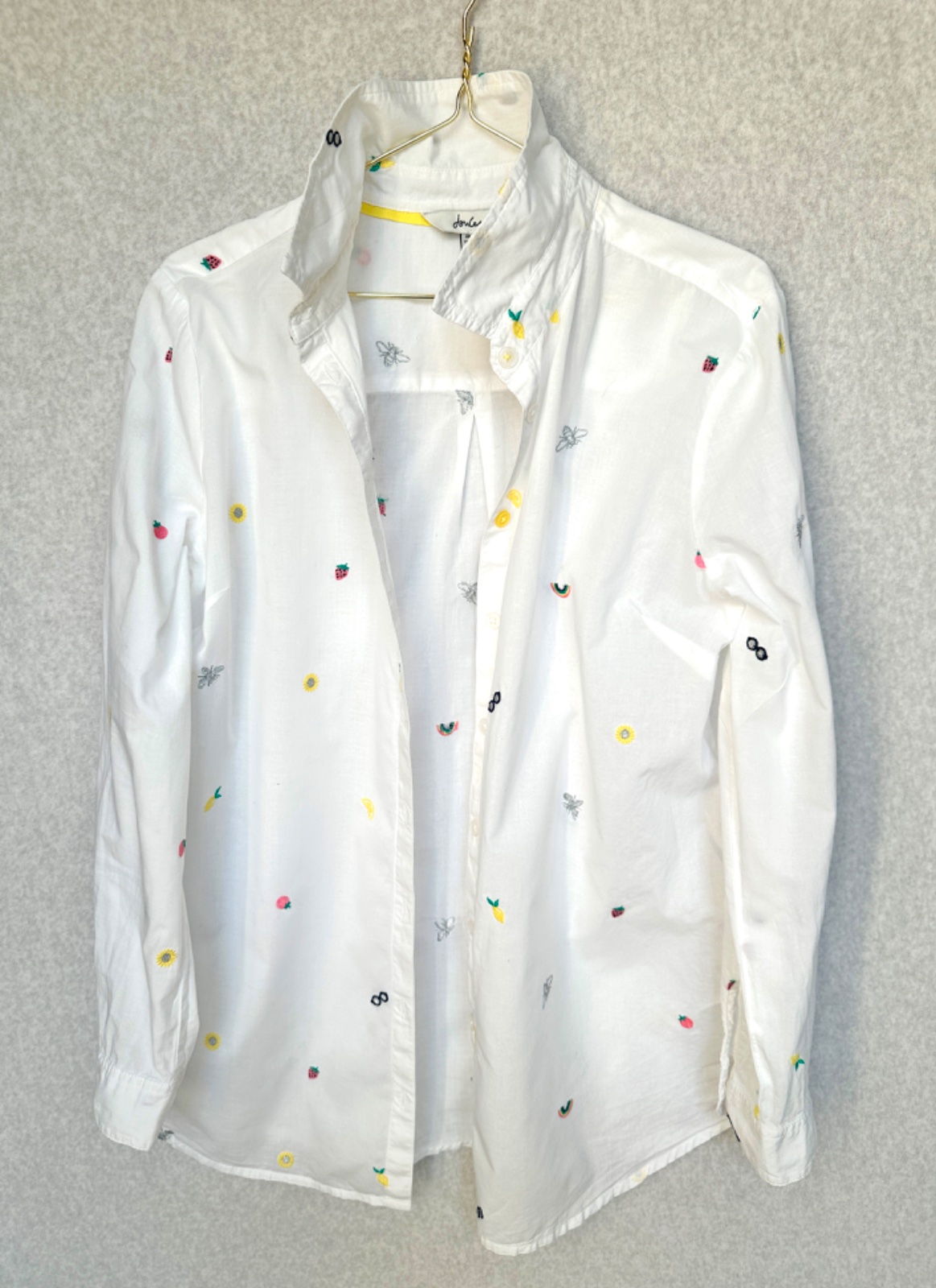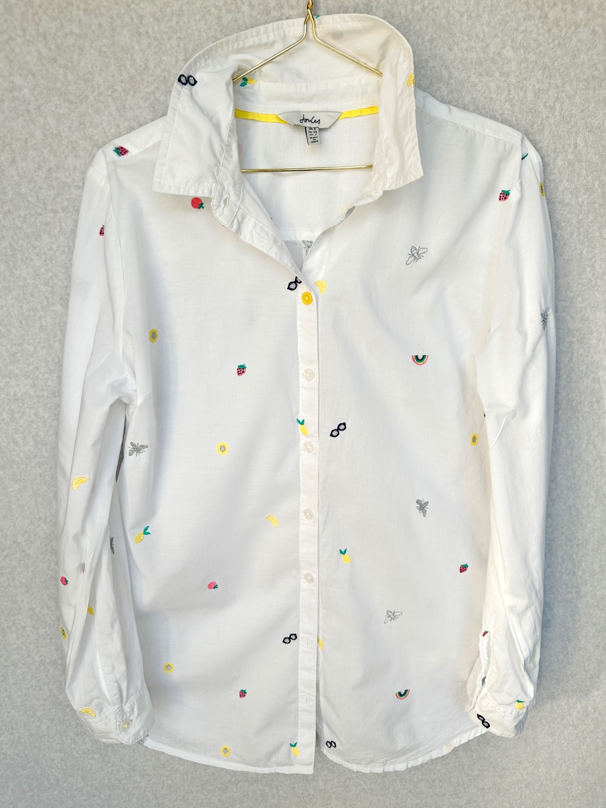 Krásna košeľa z prémiovej ultra hebkej bavlny britskej značky Joules. Košeľa má voľnejší ležérny strih, sedí aj na veľkosť S. Farebné ikonky sú na košeli vyšívané (nie potlač). Vyrobené v Indii. Vo veľmi peknom stave, bez poškodení.