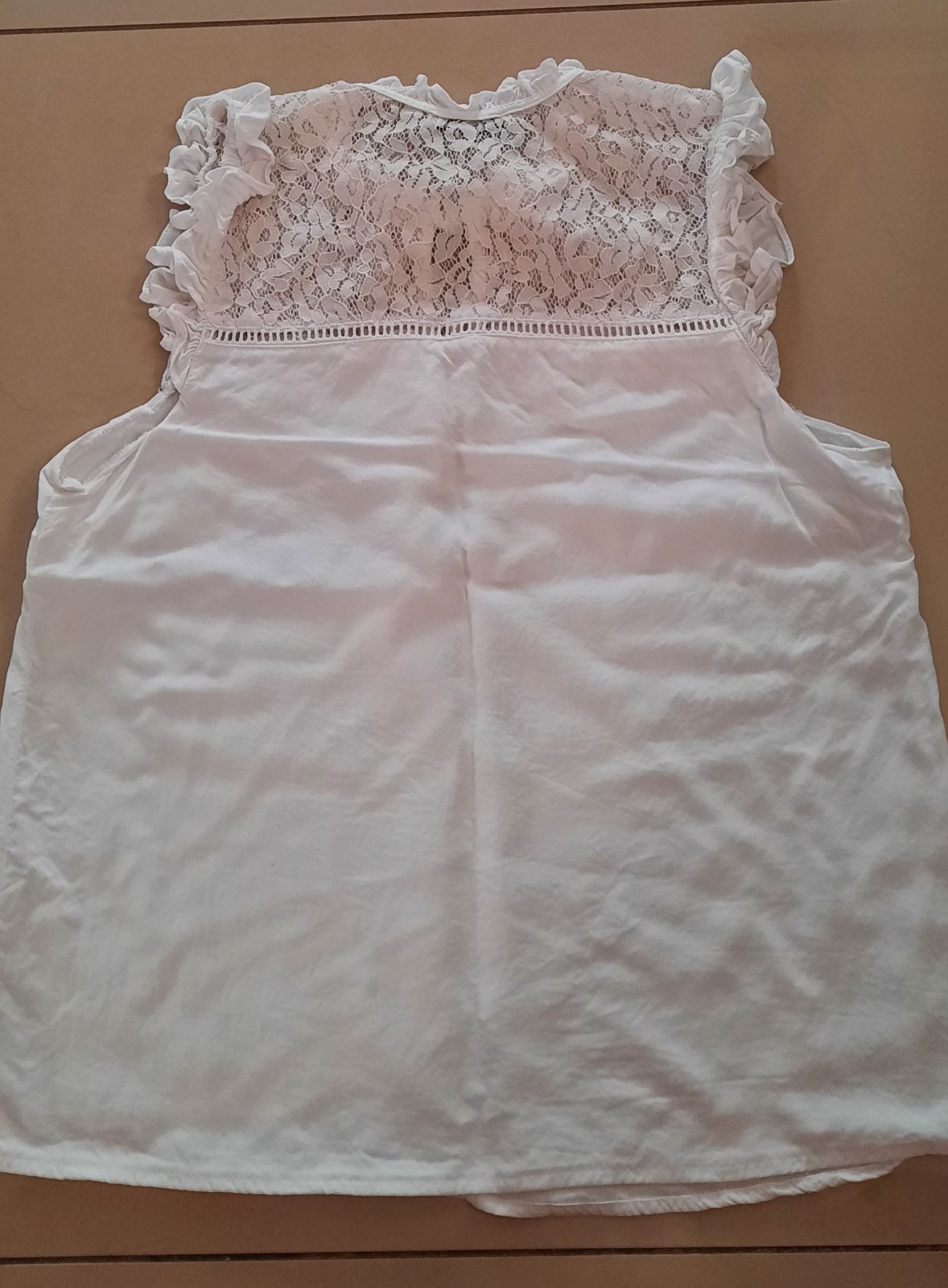 Ponukam krasnu bielu krajovú blúzku,veĺkost M,je celá elasticka-aj bilela latka aj krajka,vpredu za mašlu,vzadu je tie krajka ale len do poly lopatiek,kukni foto.Pekna top stav Bez rukavov