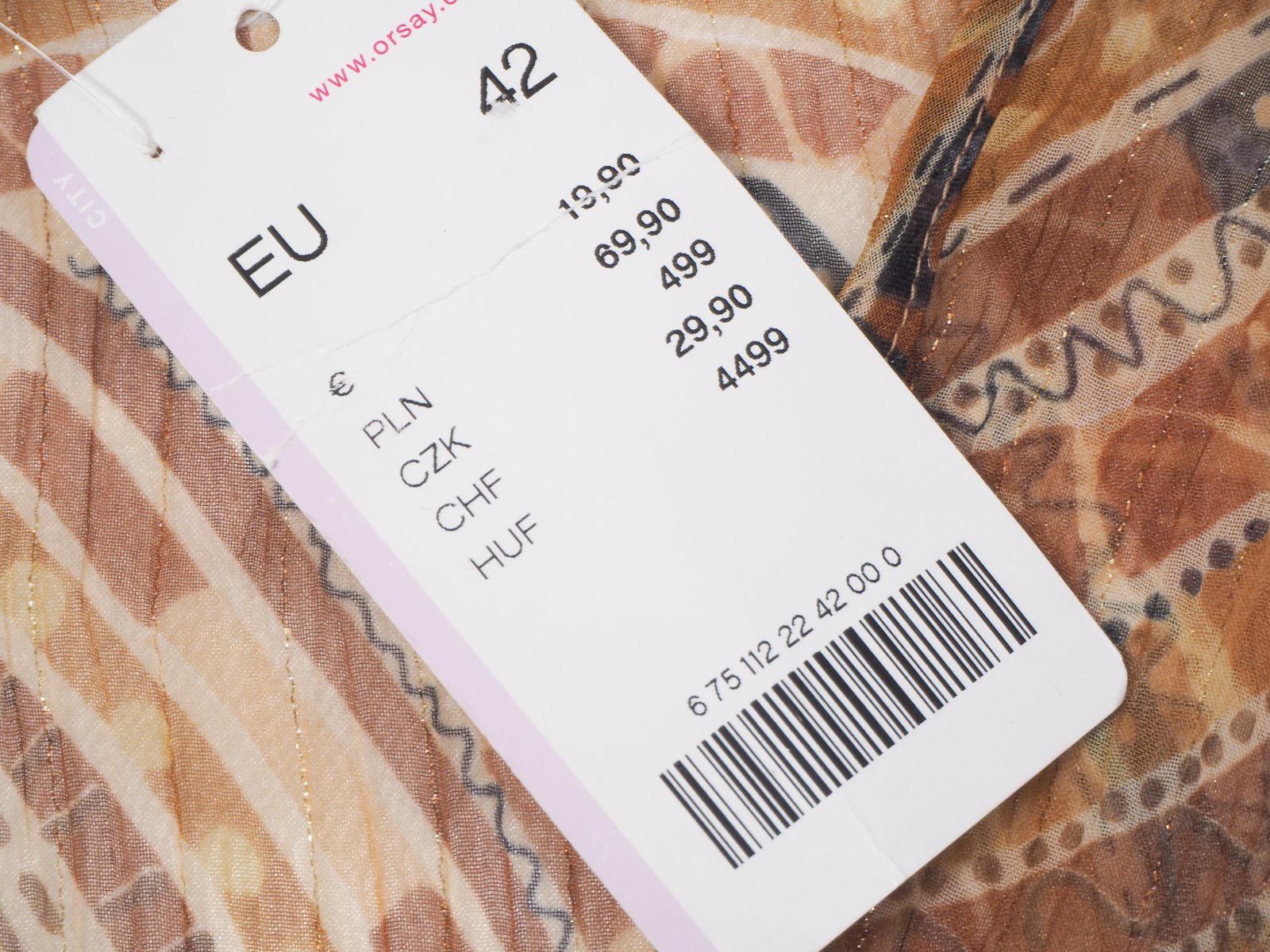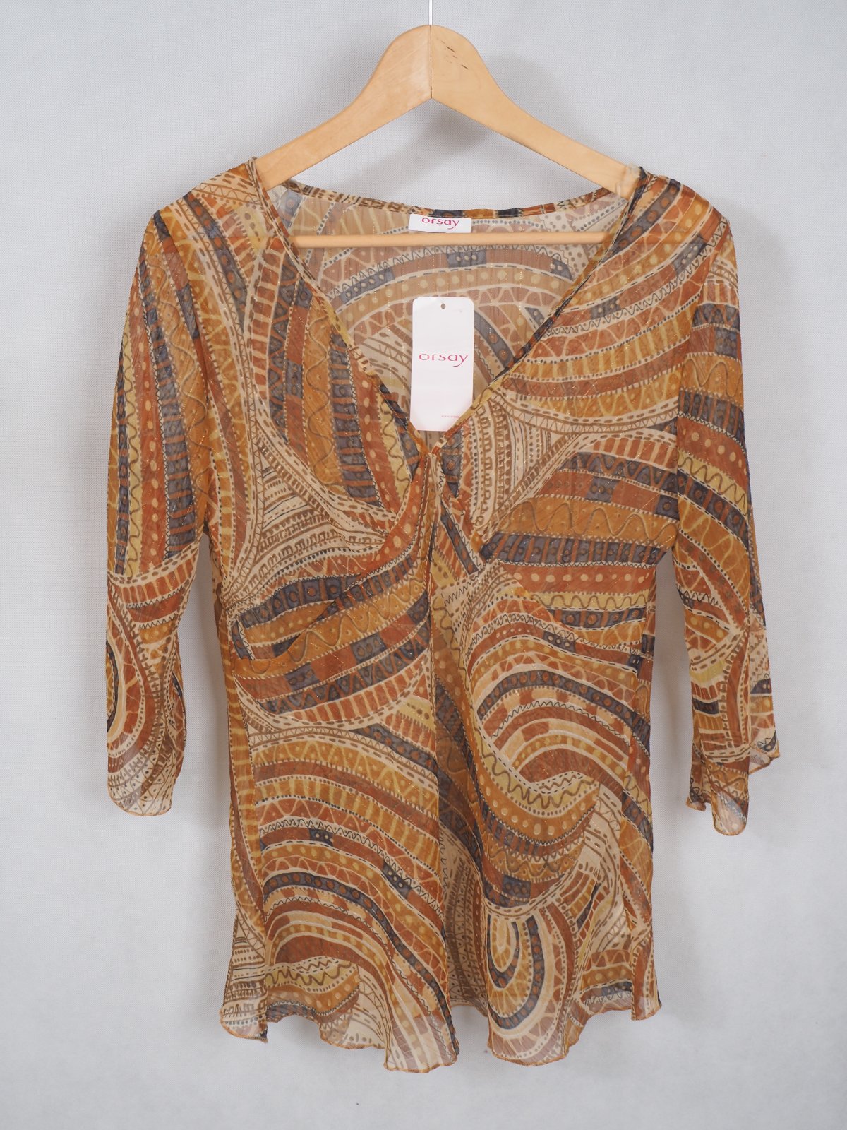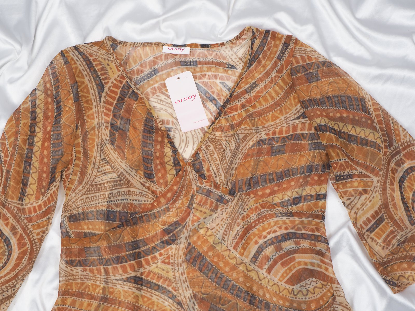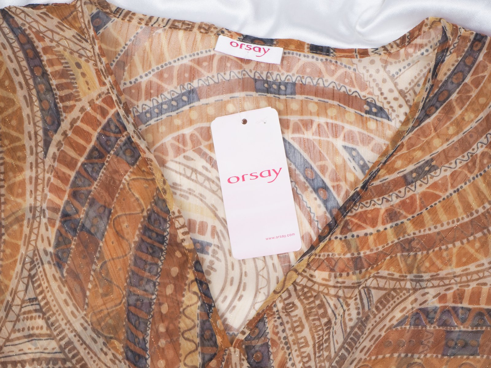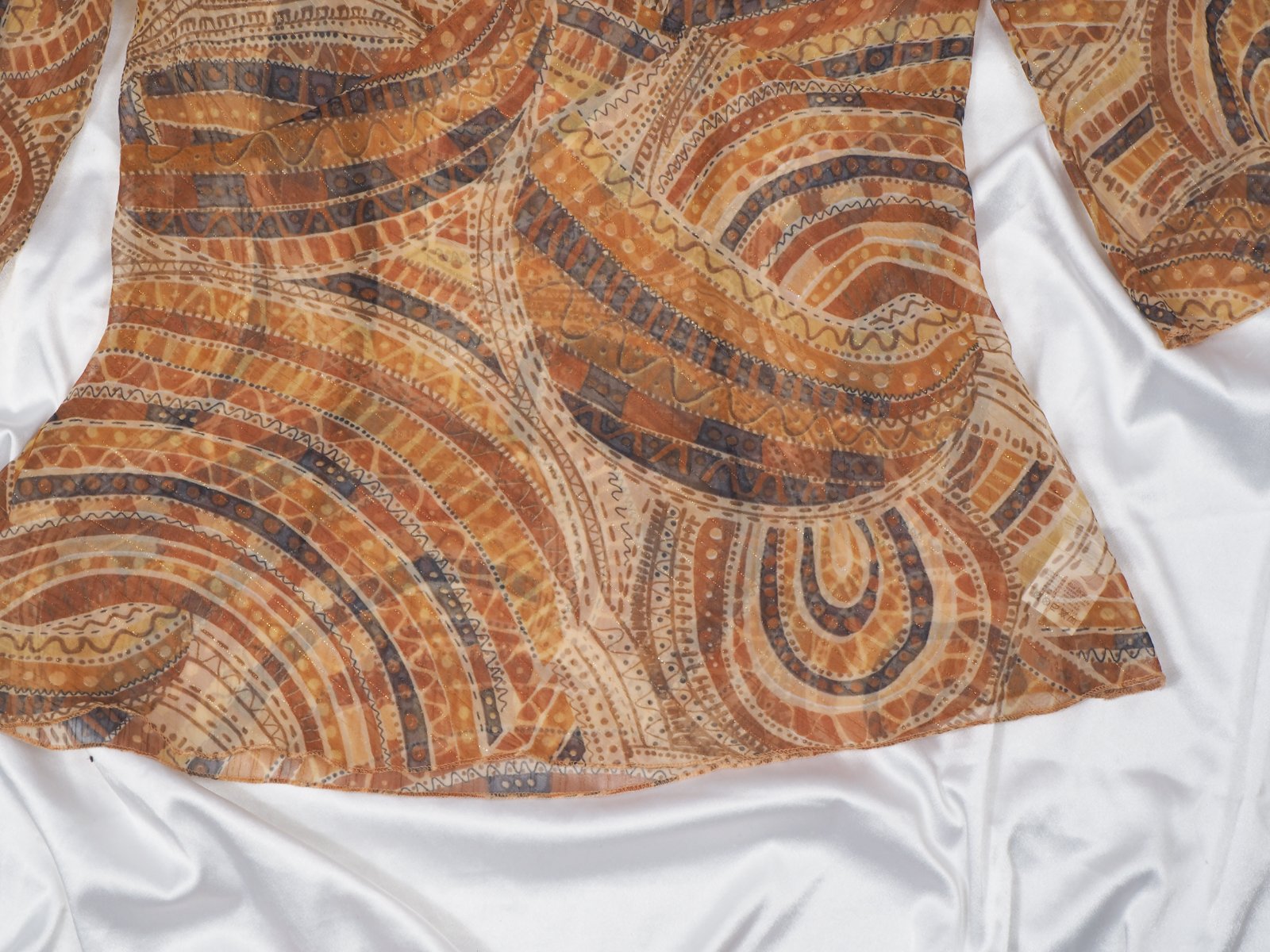Kvalitná transparentná tunika, bežovo-hnedých vzorov, popretkávaný zlatou niťou, materiál 98% polyester, 1% nylon, 1% metalické vlákno, nová.