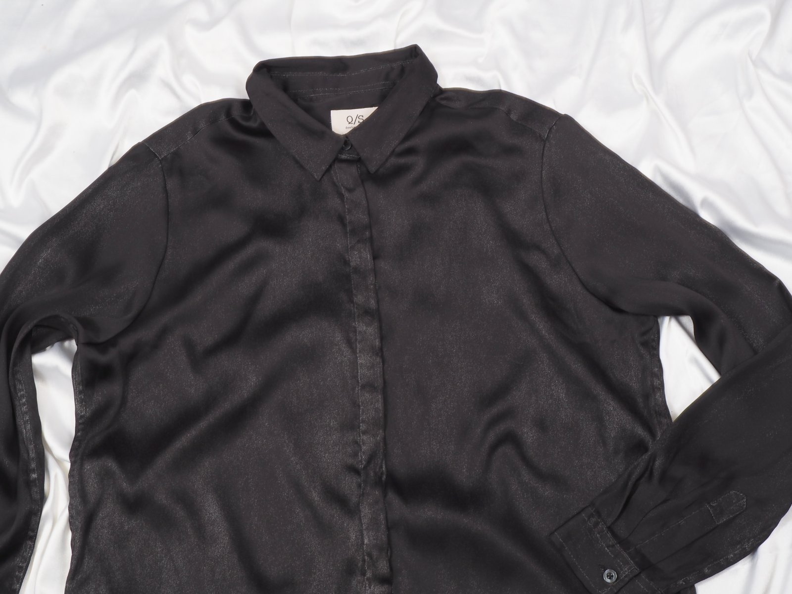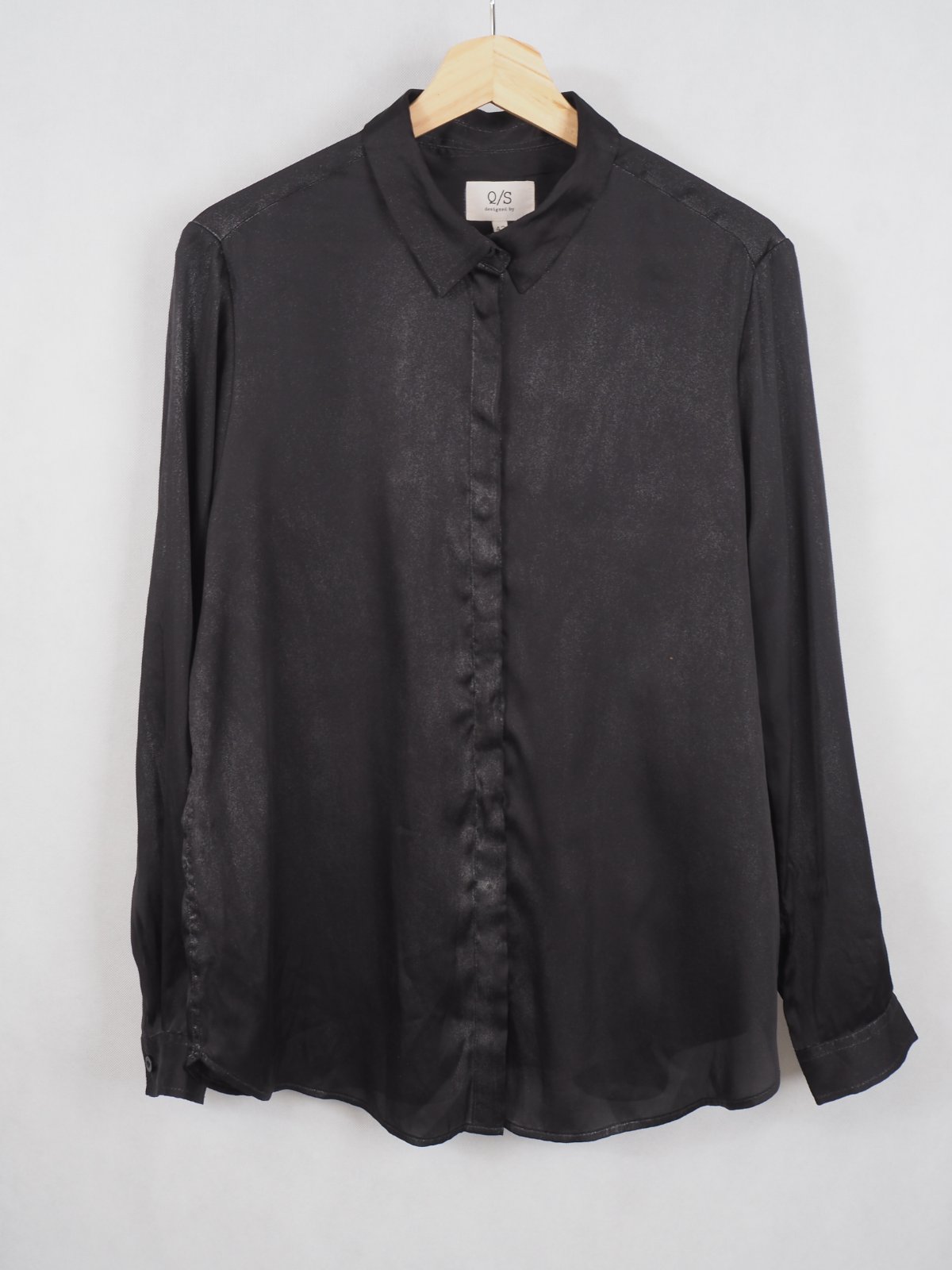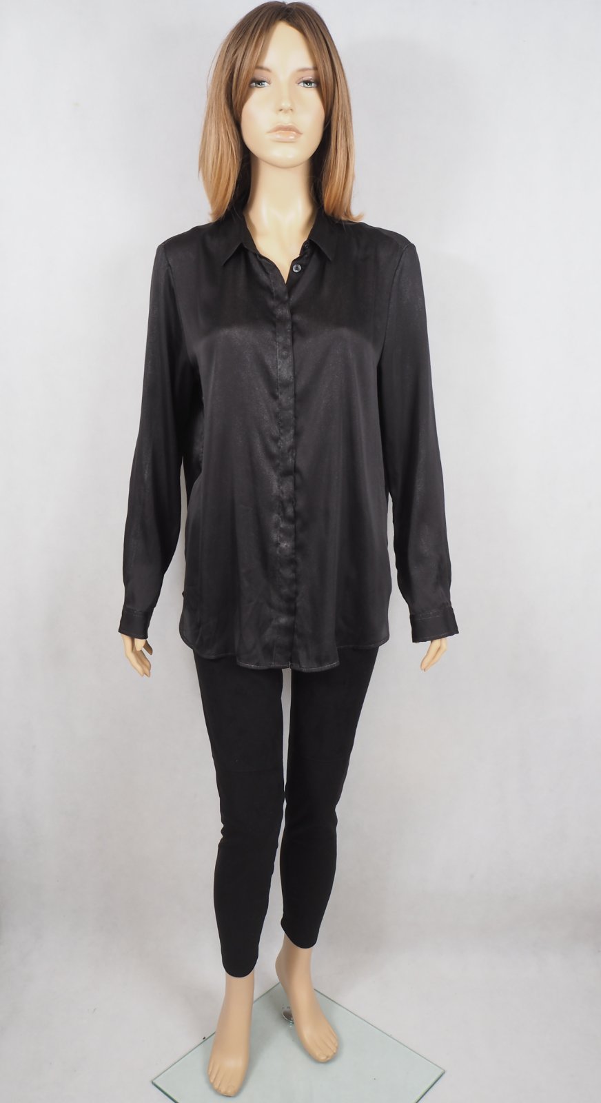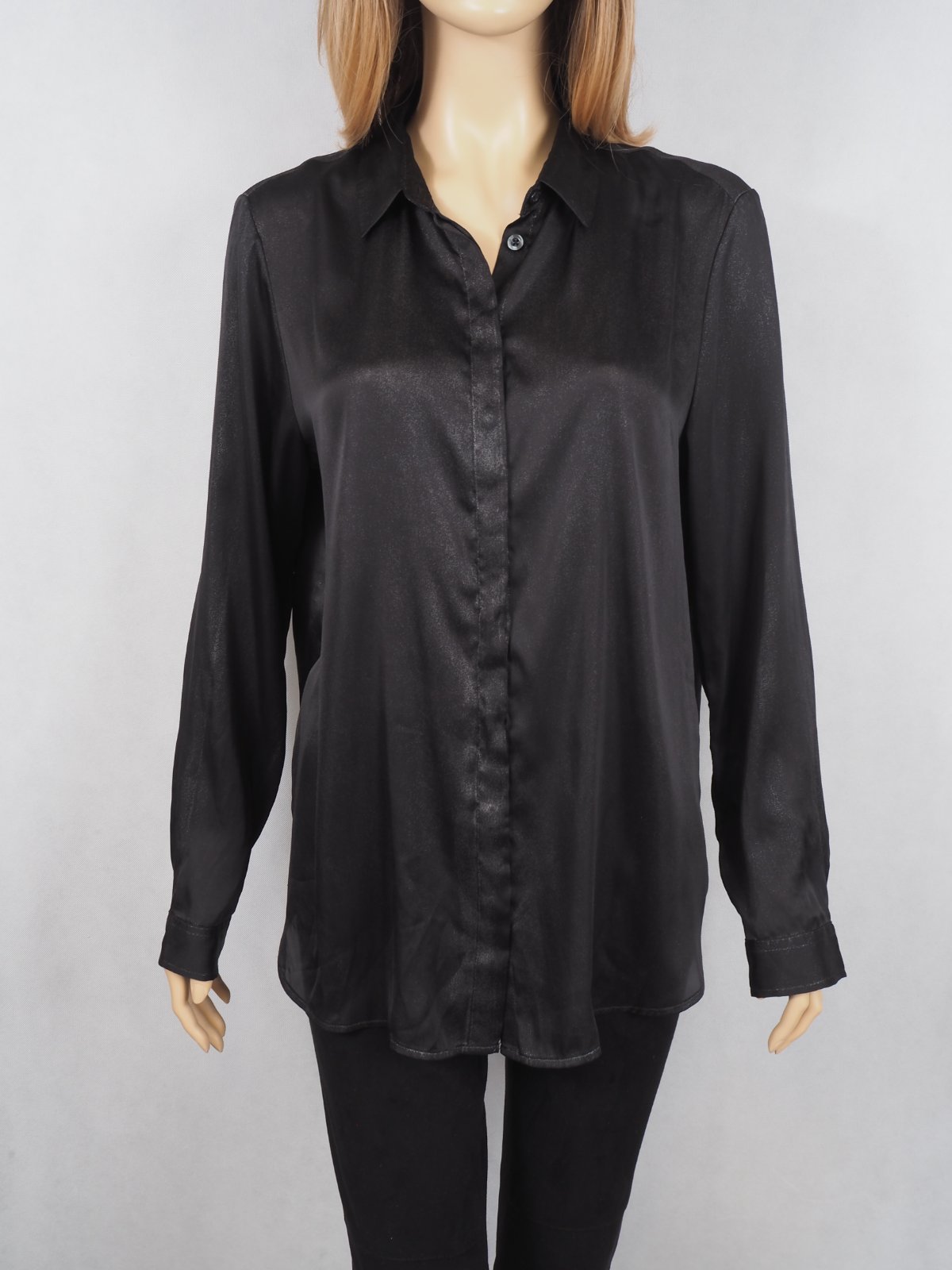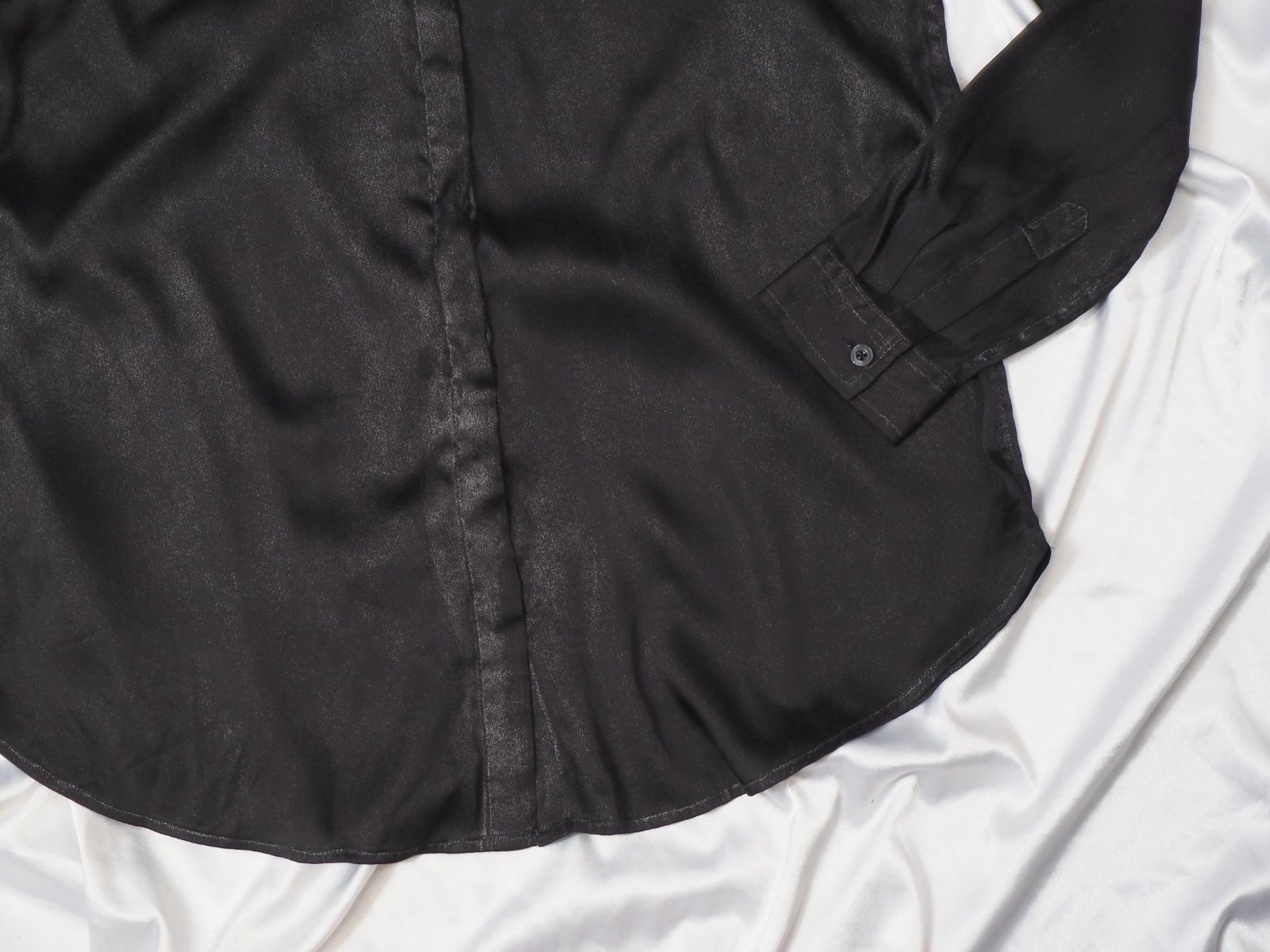 Kvalitná padavá blúzka čiernej farby s jemným strieborným odleskom, zapínanie na gombíky, materiál 100% polyester, super stav.