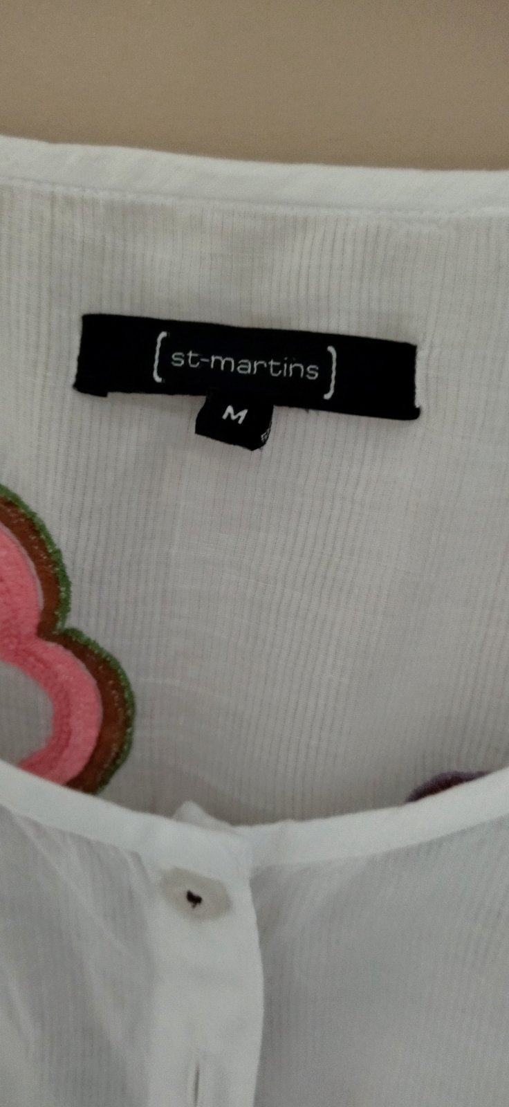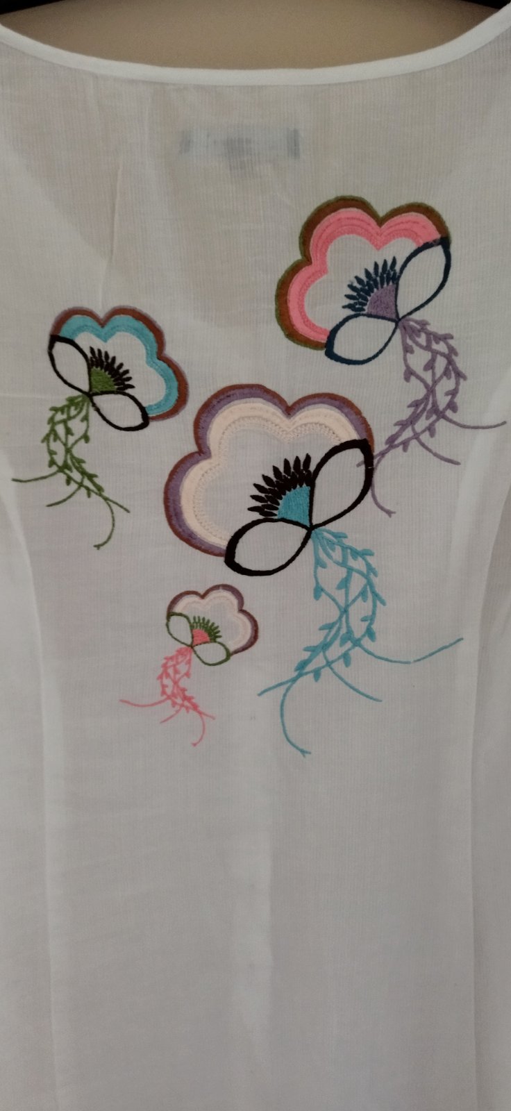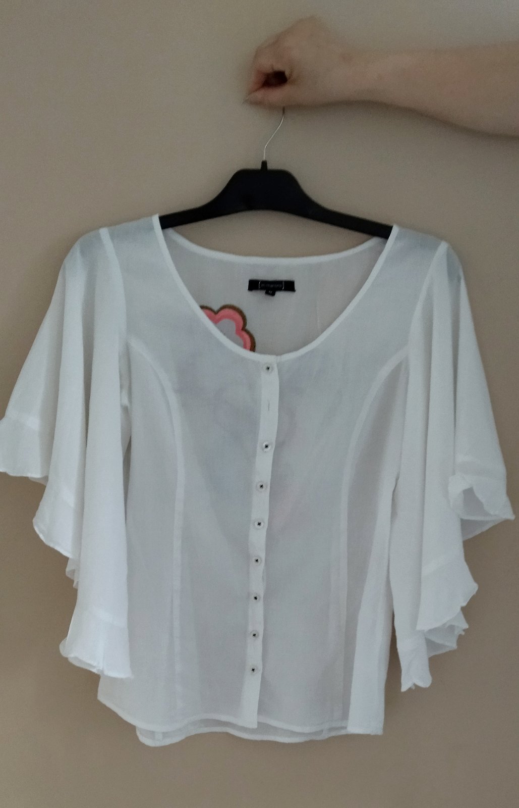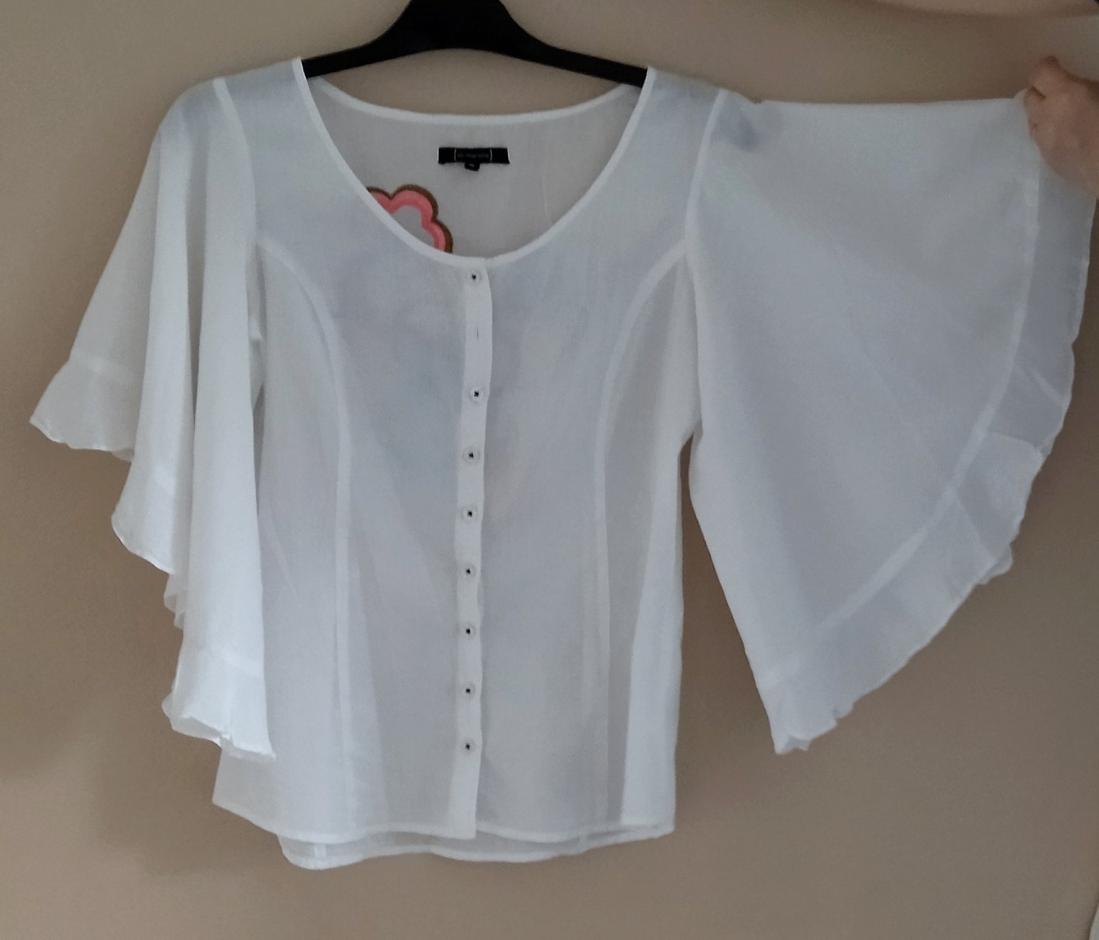 Biela široká viskózová blúzka, 3/4 široký rukáv do tvaru "A", veľkosť "M"; vpredu je biela výšivka, límec vpredu okolo krku má dekor čipky s kamienkami; vzdušná. Po opratí nie je potrebné žehliť. N...