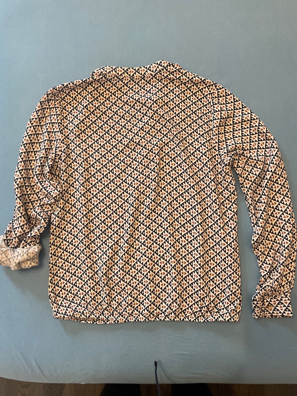 100% stav, zapínanie na gombíky, materiál asi bavlna, lístok je odstrihnutý, dĺžka 58 cm, šírka 2 x 49,5 cm, rukáv od krku 8 + 55 cm, vnútorná dĺžka rukáva 38 cm