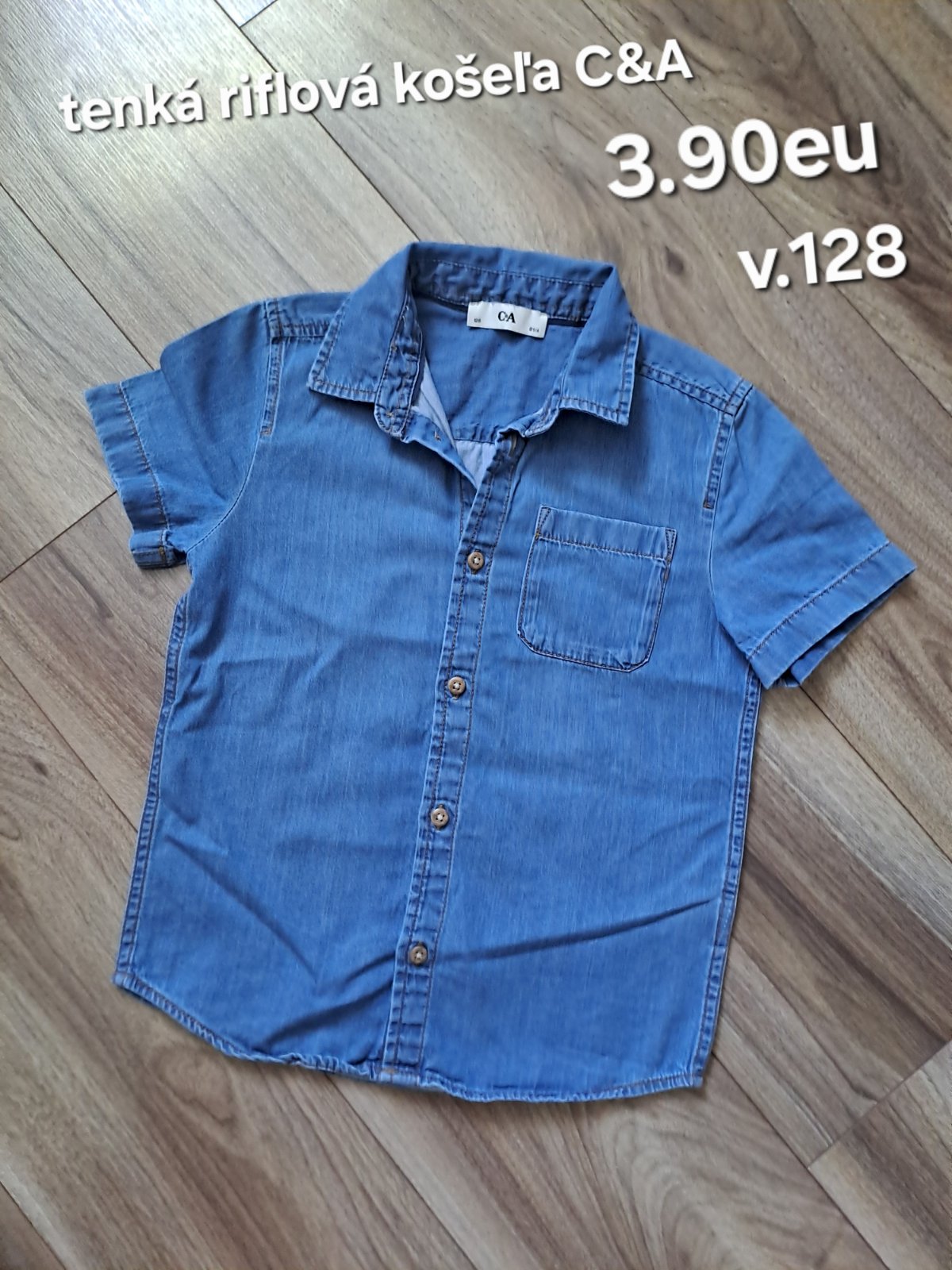 Ponúkam krásnu frajerskú košeľu so zapínaním na cvoky (pri krku na gombík) Košeľa je ľahkého, vzdušného materiálu, veľ. 128. vo vynikajúcom stave (bez akýchkoľvek poškodení); malinko nosené. Na pož...