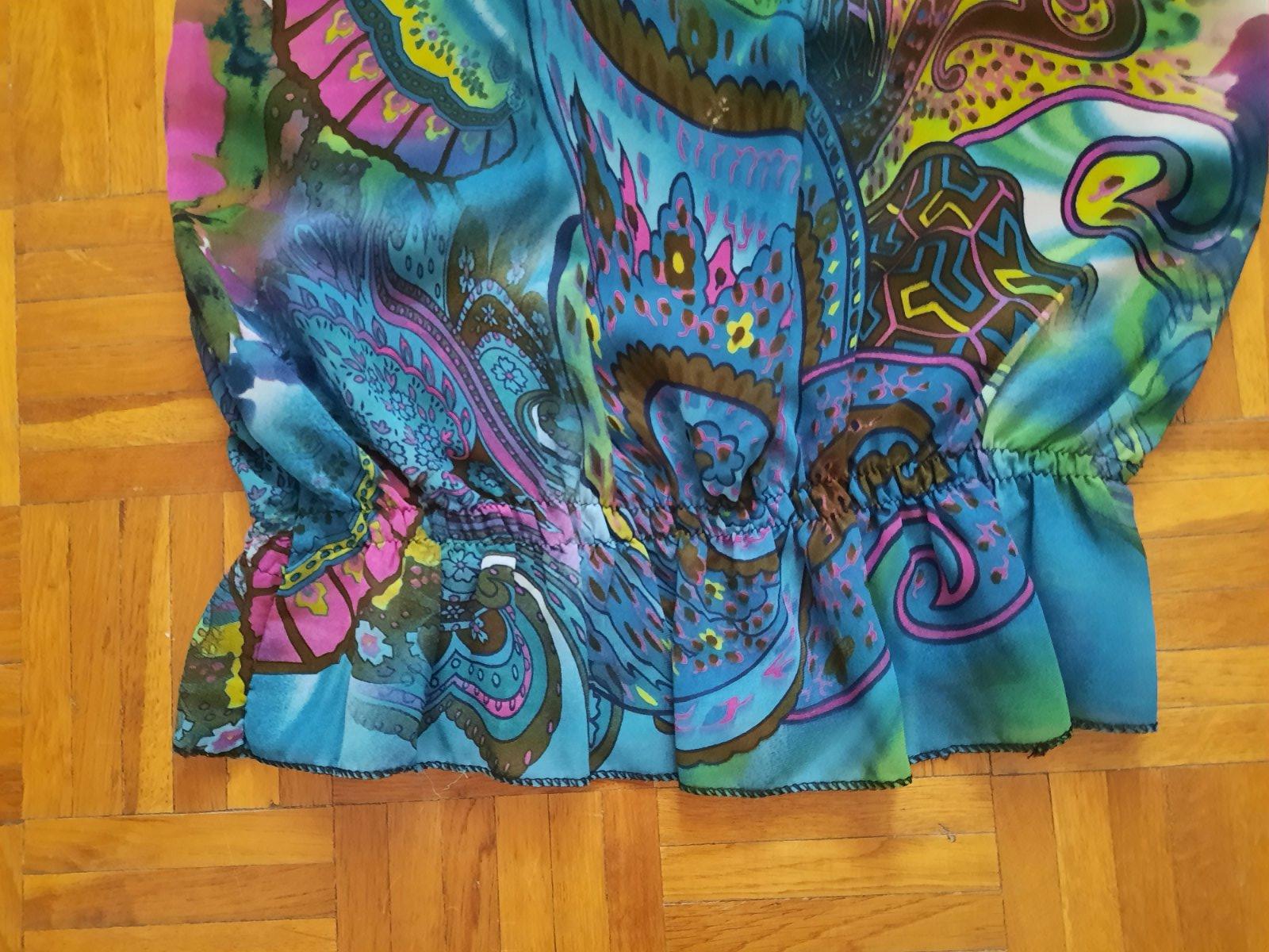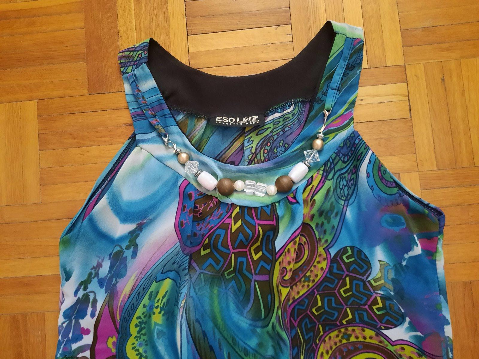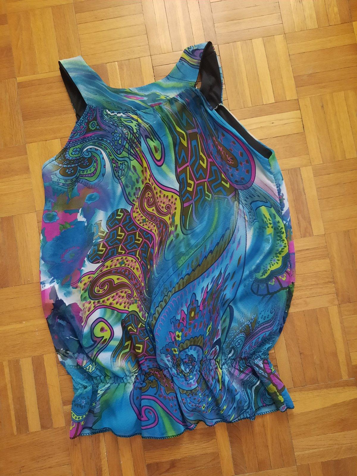 Predám elegantný top / blúzku. Je zaujímavo ušitá- dole je nariasená tenkou gumou. Predná časť je podšitá čiernou látkou, aby nepresvitala. Okolo výstrihu vpredu je ozdoba- ako náhrdelník, ktorý je napevno. Má pekné sýte farby. Bola oblečená max.2x, čiže je v top stave. Materiál je vzdušná blúzkovina.
