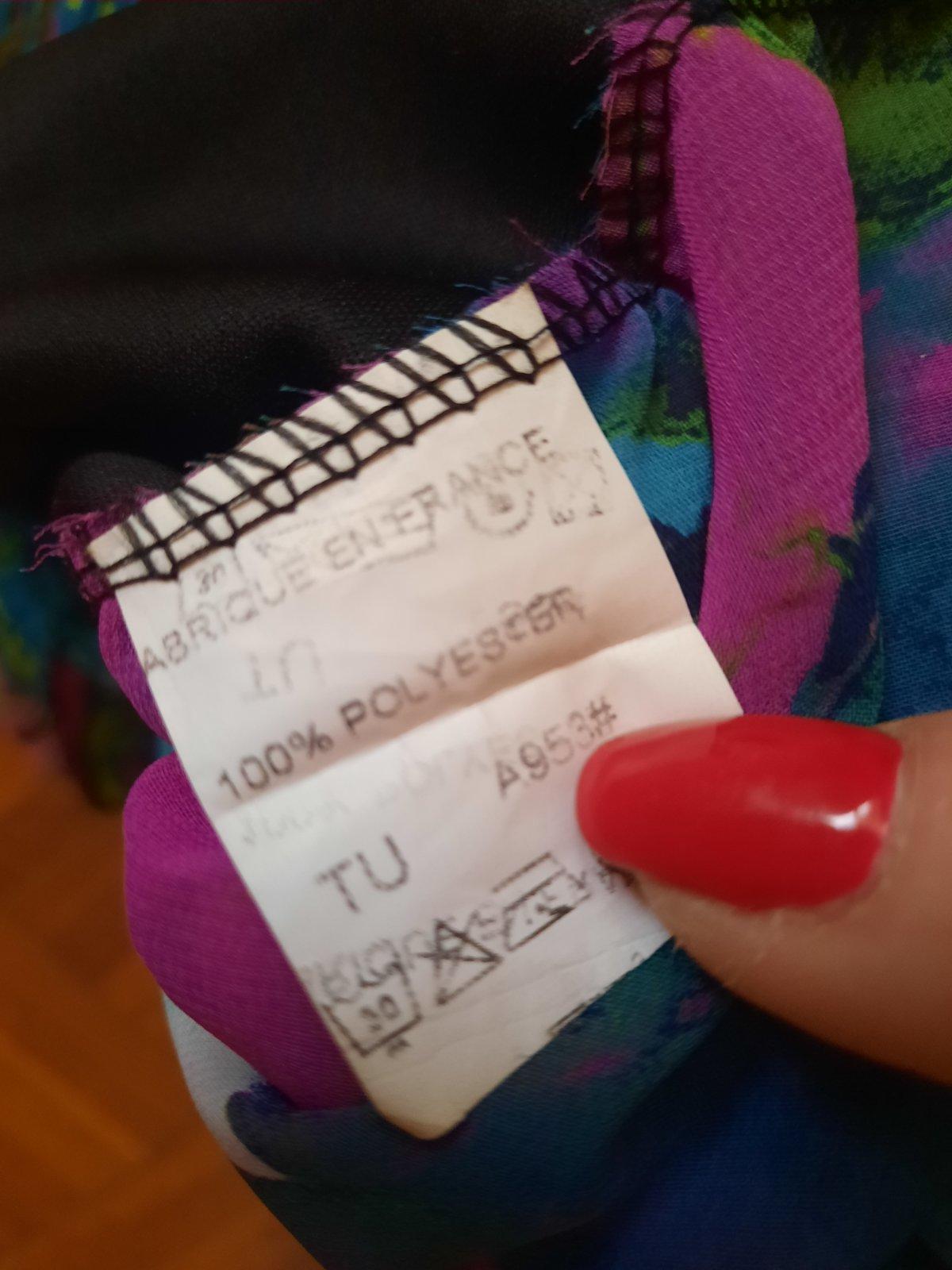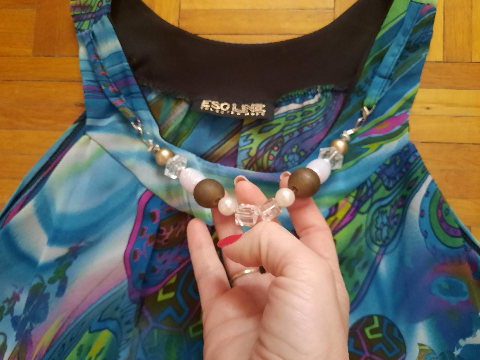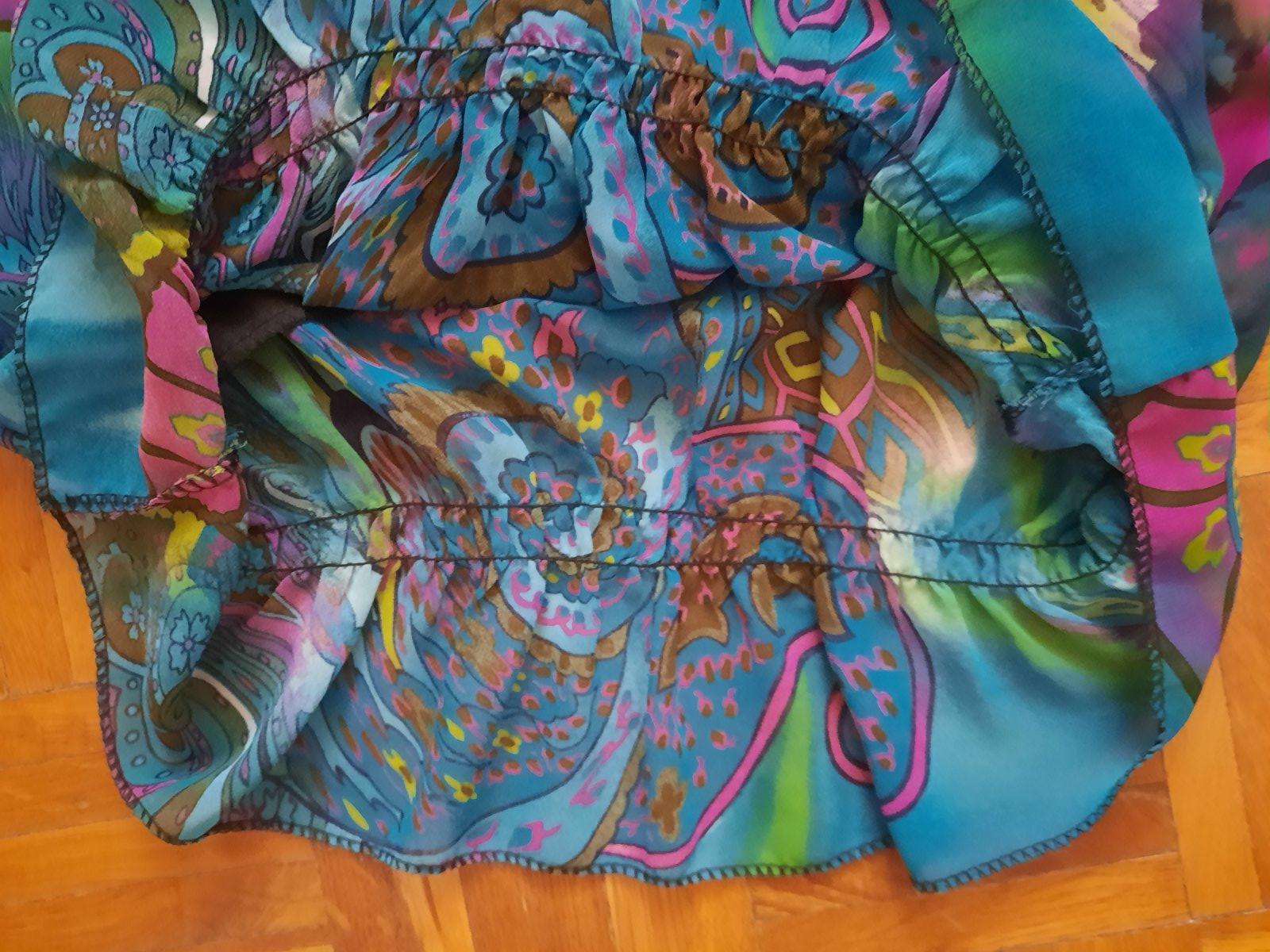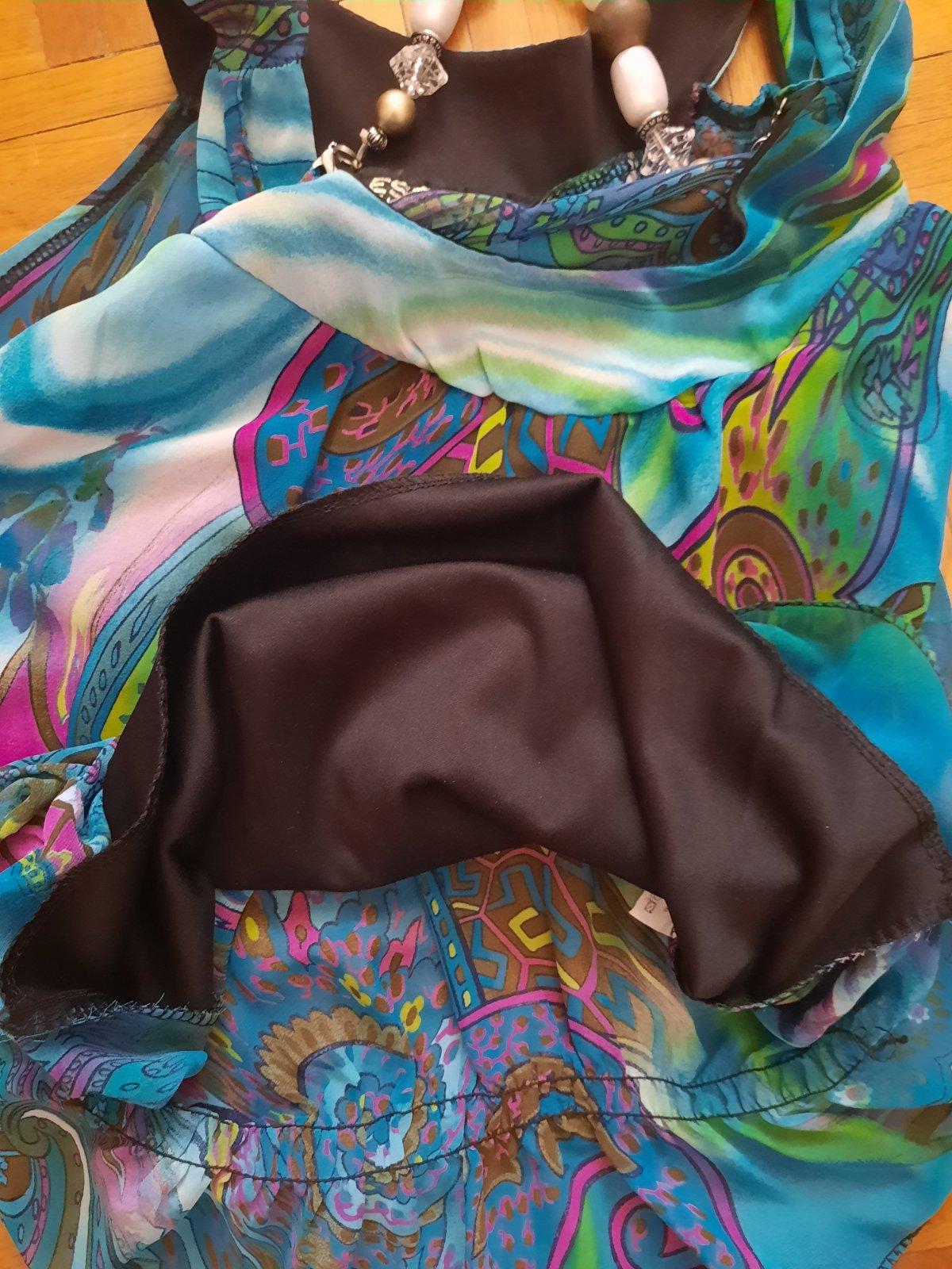 Predám elegantný top / blúzku. Je zaujímavo ušitá- dole je nariasená tenkou gumou. Predná časť je podšitá čiernou látkou, aby nepresvitala. Okolo výstrihu vpredu je ozdoba- ako náhrdelník, ktorý je napevno. Má pekné sýte farby. Bola oblečená max.2x, čiže je v top stave. Materiál je vzdušná blúzkovina.