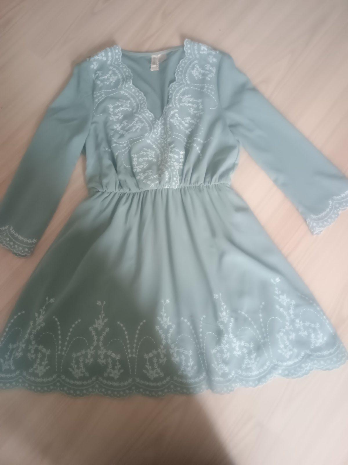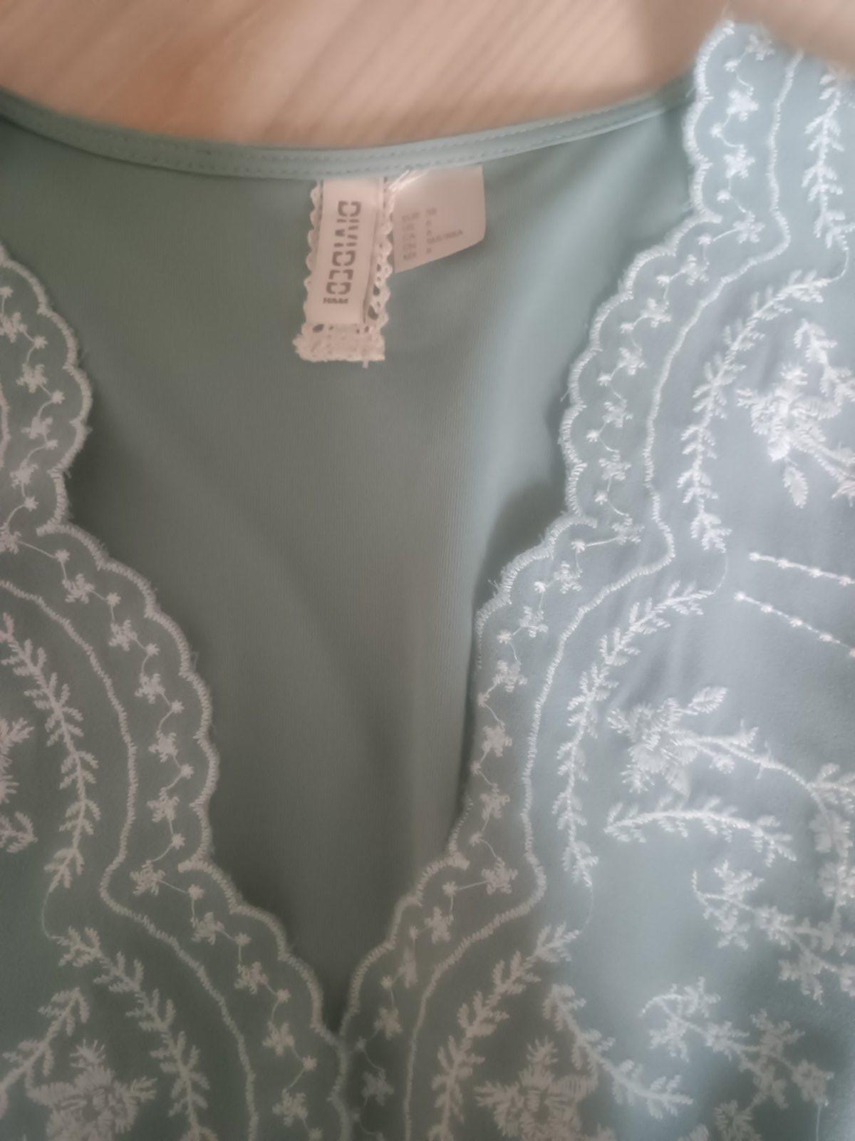 Predám tenšiu blúzku/tuniku peknej svetlo mentolovej farby s malými kvietkami a výstrihom na šnurovanie. Veľkosť nie je udaná, ale bude sedieť S alebo M, dĺžka cca 48 cm, šírka 36 cm. Rukávy s volá...