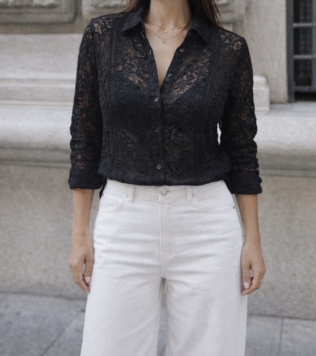 Čierna čipkovaná košeľa od Zara v dokonale ženskom a elegantnom prevedení. Celá košeľa je vyrobená z jemnej čipky, ktorá pôsobí luxusne, no stále veľmi nositeľne. Prepínanie na gombíky dodáva klasický charakter, zatiaľ čo čipkované detaily vytvárajú romantický a sofistikovaný vzhľad.
