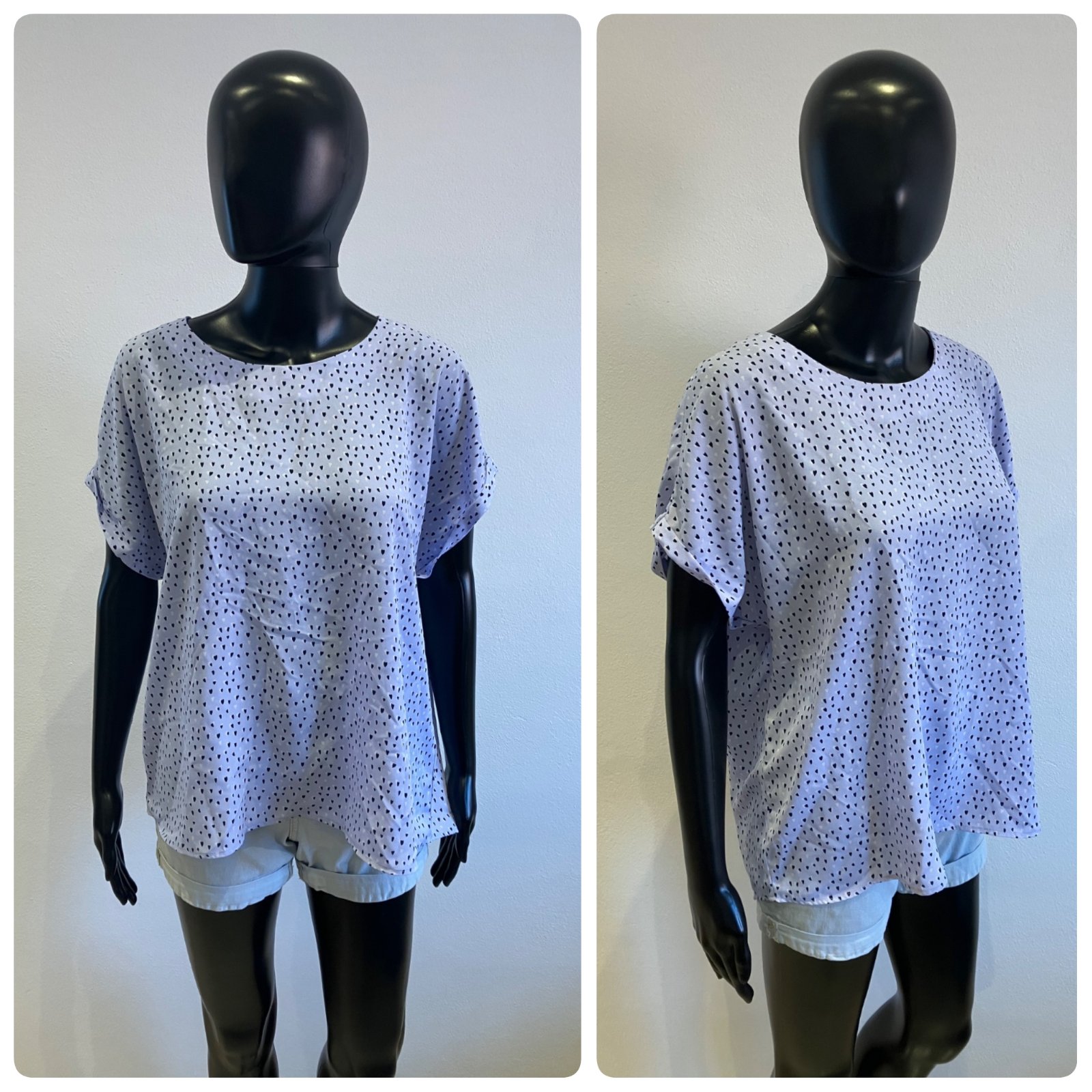 Dámska blúzka s krátkym rukávom, vzor srdce, nie je elastická, zapínanie vzadu na jeden gombík, tenká, farba fialovo-modrá vzor čierno-biely, materiál 100%polyester.