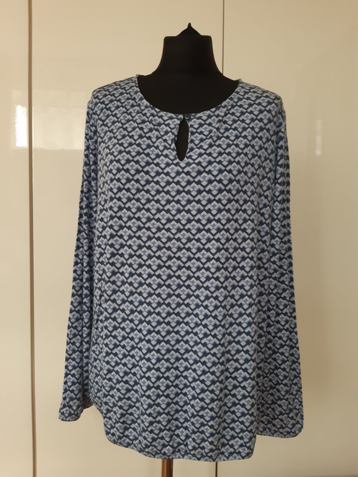 Blúzka je vo výbornom stave, bez poškodenia, Farba blúzky je kombinácia tmavo a svetlo modrej a bielej. zle sa mi fotilo, správna farba je približne na druhej fotke v poradí-zadný diel. Dl. 68 cm, šírka v podpaží 62x2 cm, dl. rukáva 64 cm. Materiál je zrejme viskóza, elastan, alebo bavlna, elastan, je príjemný , mäkký. Sedí na veľkosť 46/48.
